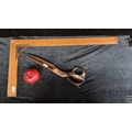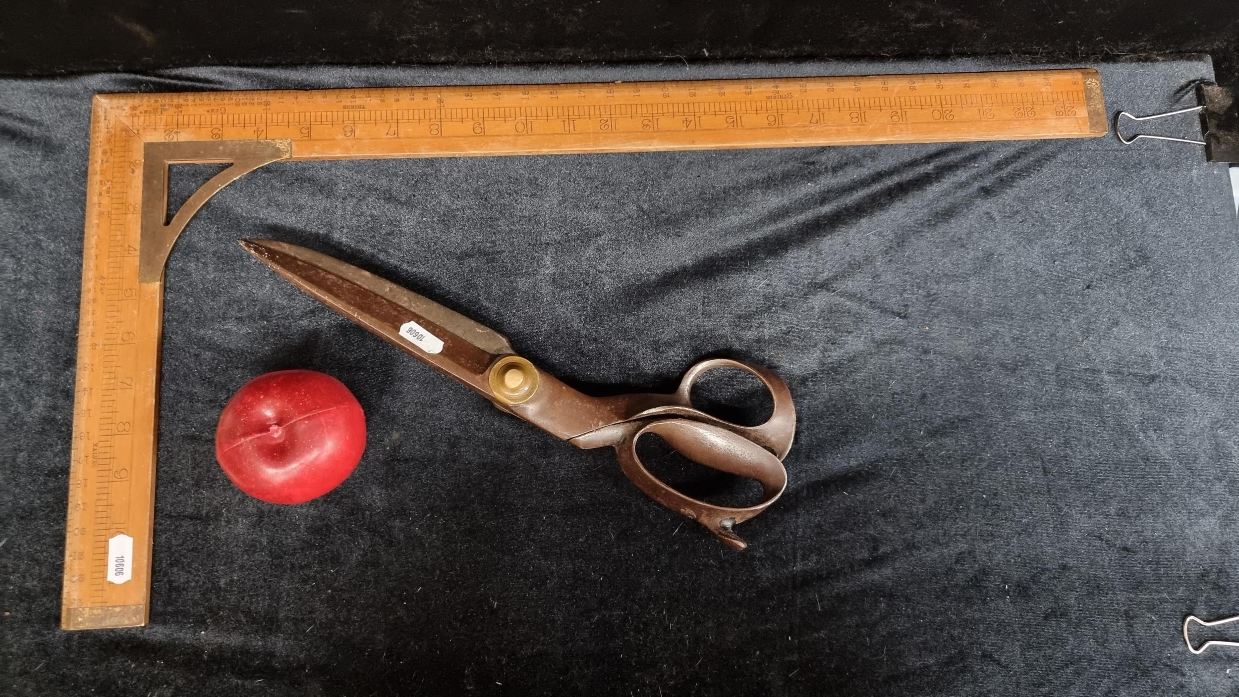 Two vintage tailoring items including a wooden proportionate waist measure T square and heavy large pair of tailoring scissors.