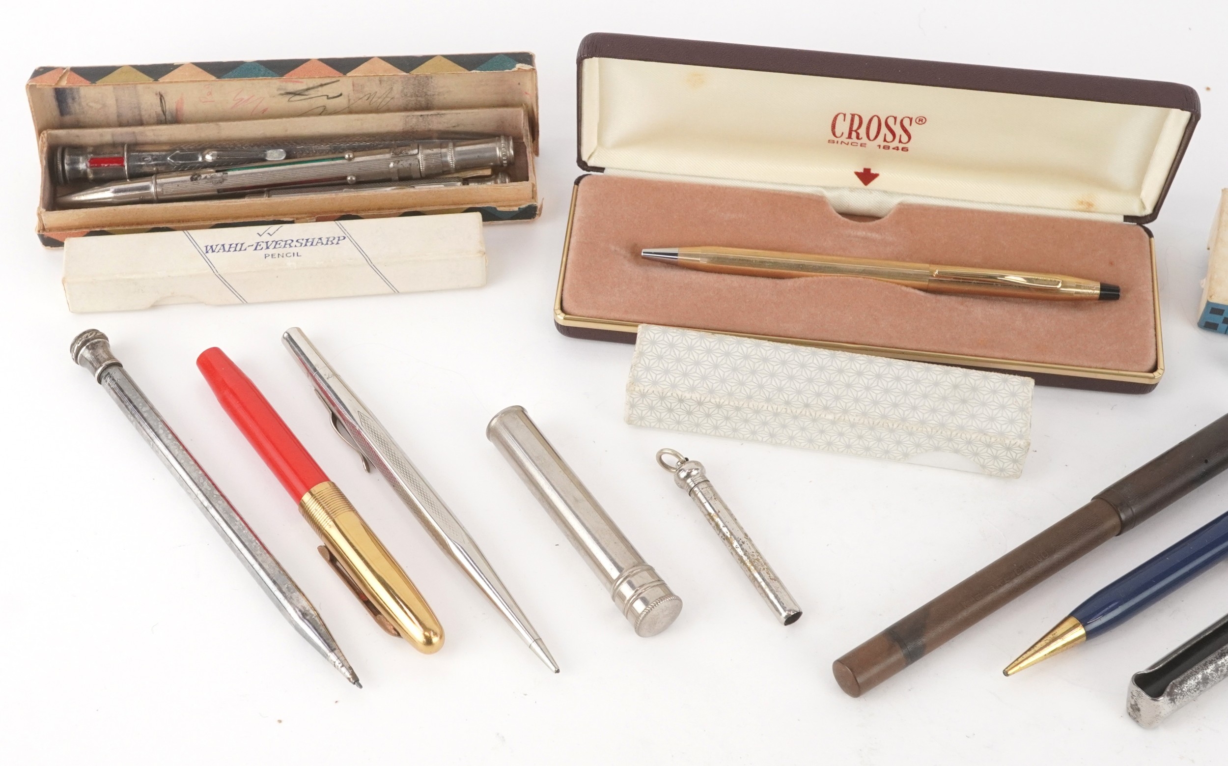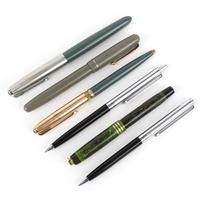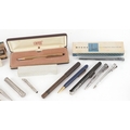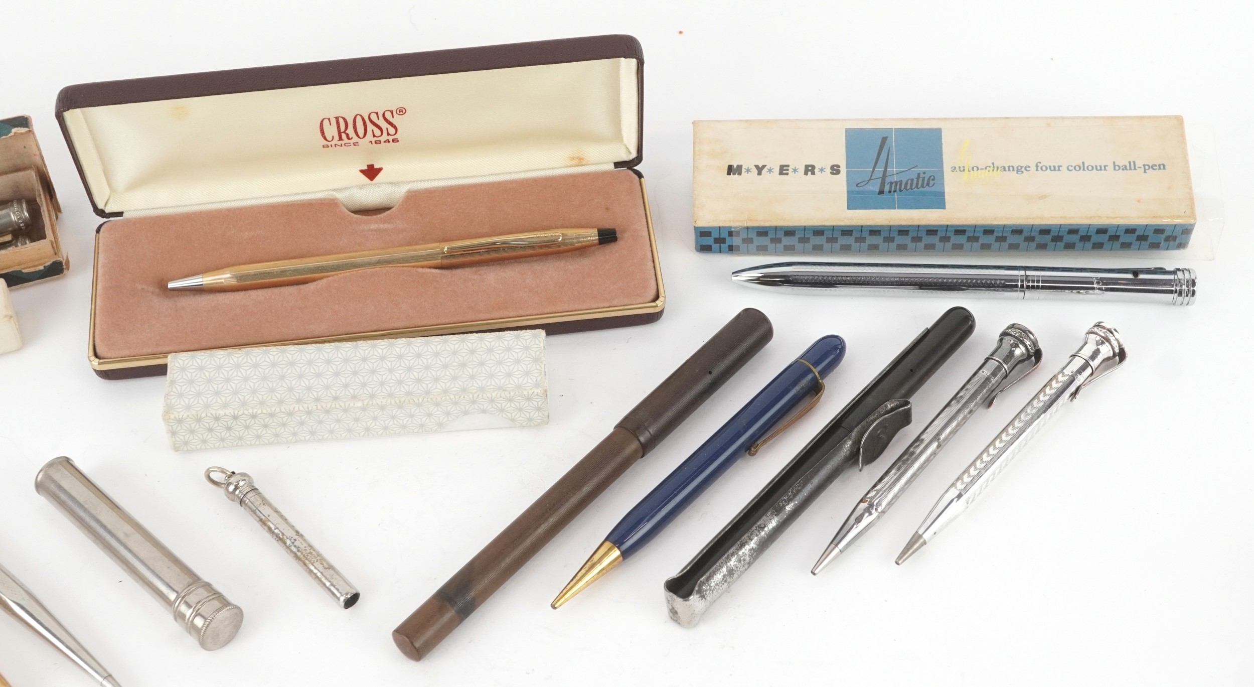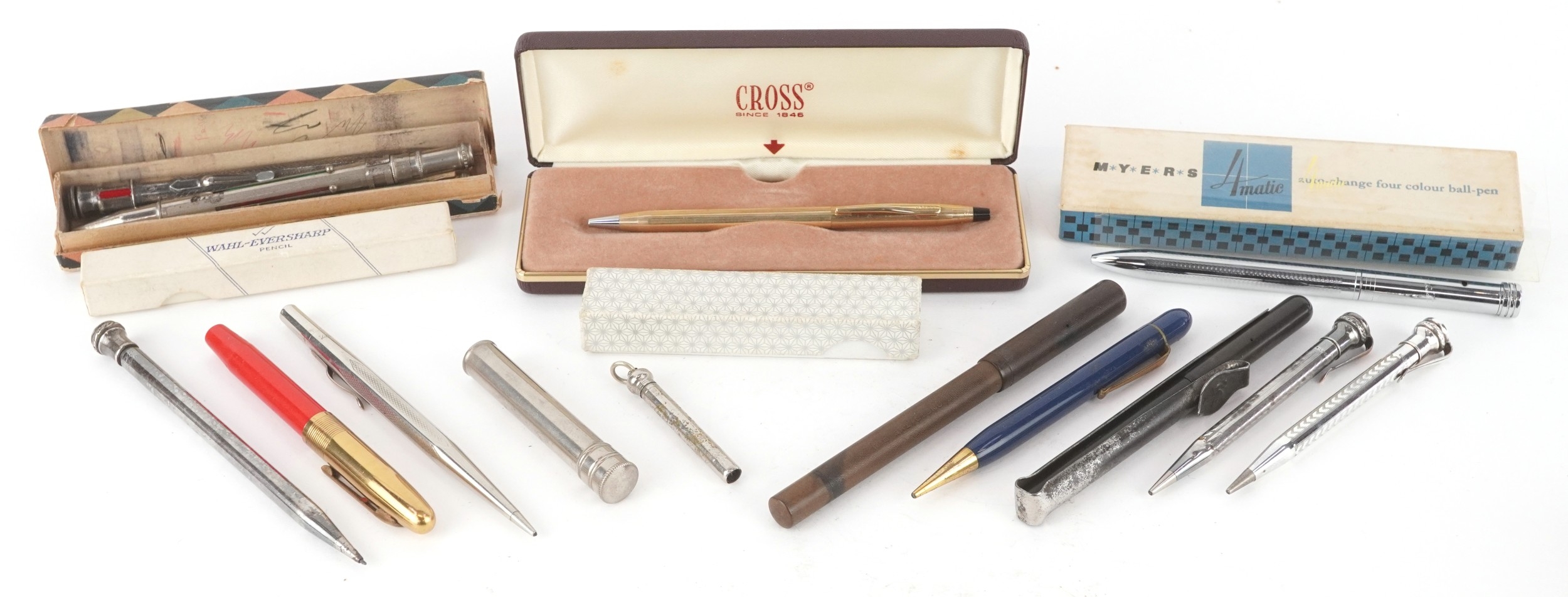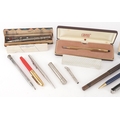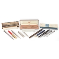 Vintage and later fountain pens, ballpoint pens and propelling pencils, some silver plated, including Eversharp, Myers and Cross.