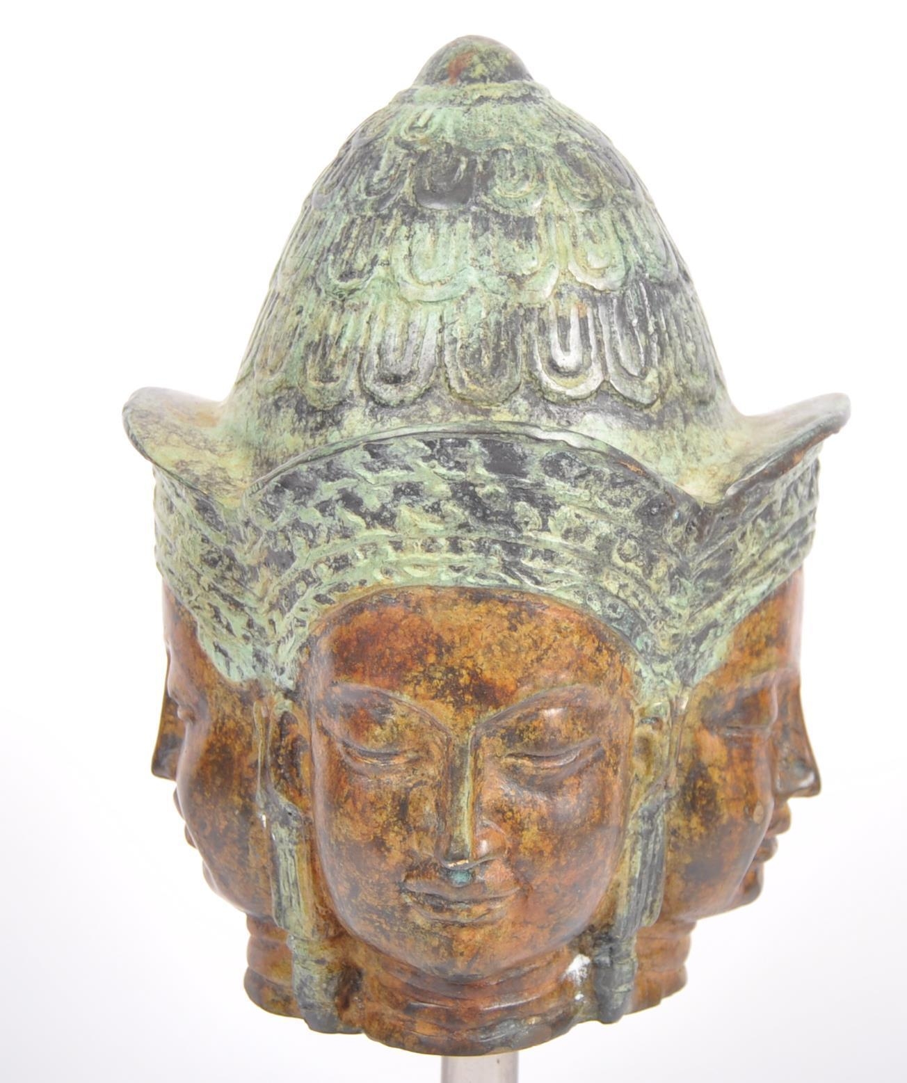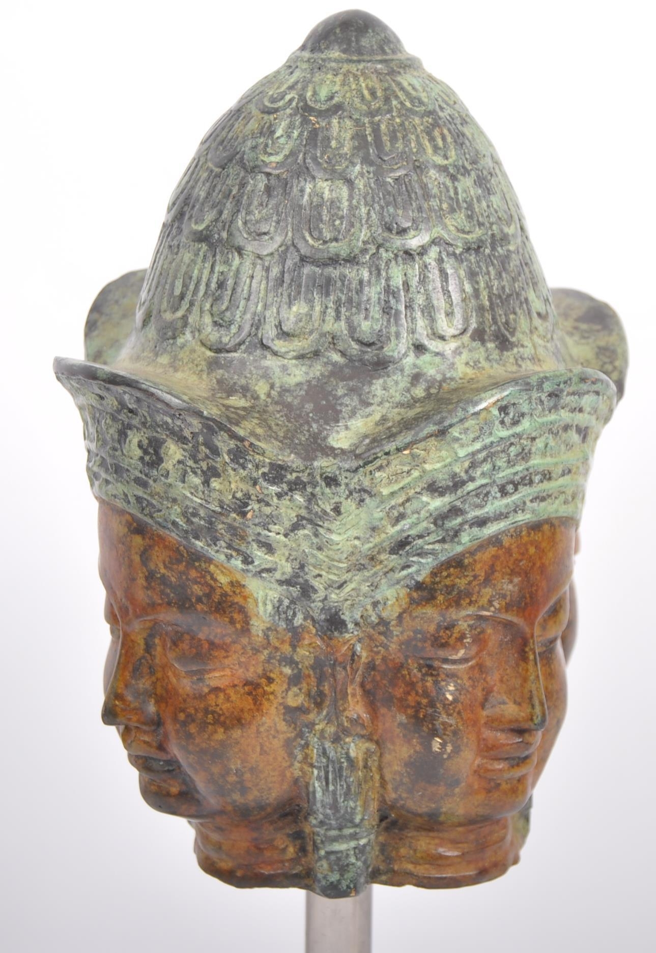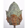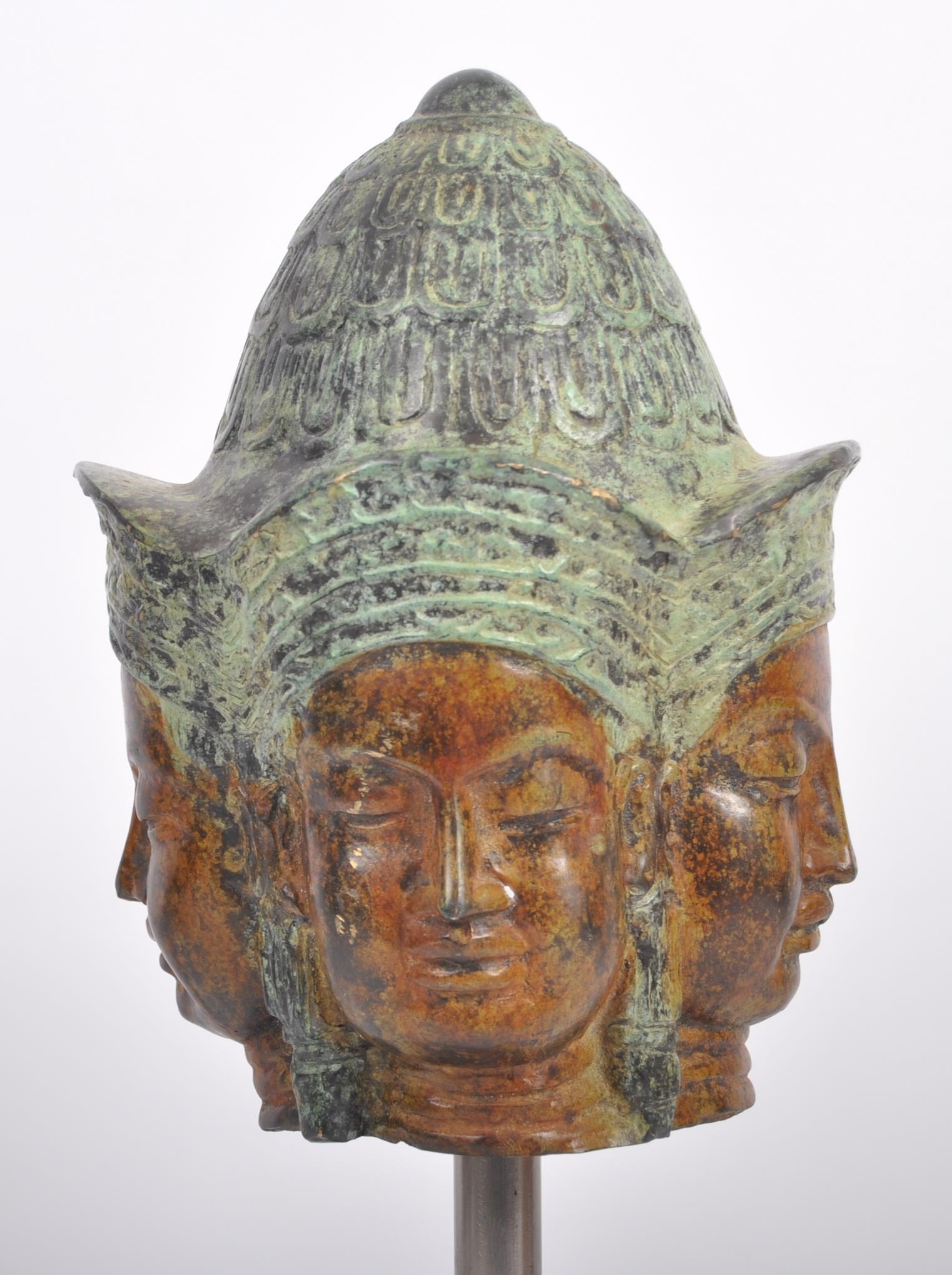 A 20th Century Chinese Tibetan Thai bronze Buddha Phra Phrom four headed head. Cast features with two tone finish green verdigris crown. Raised on a polished metal stand. Measures approx; 38cm tall.