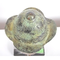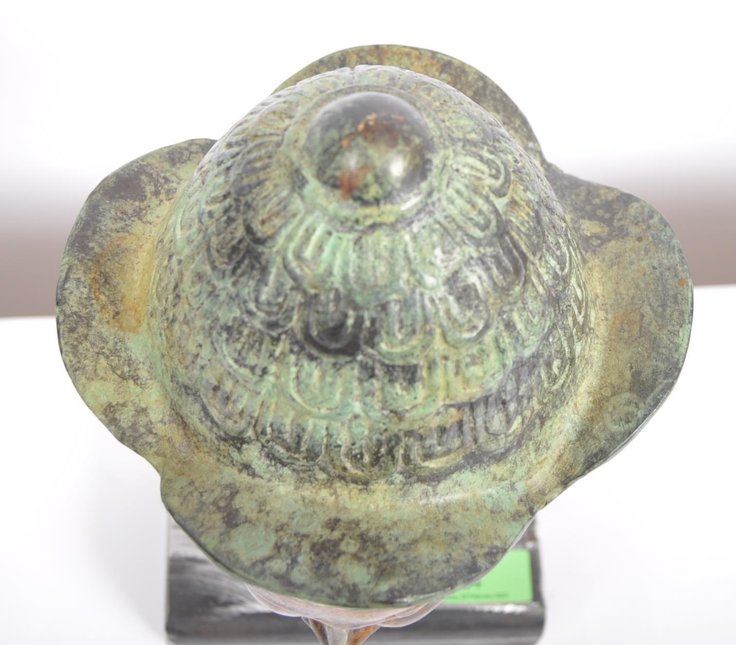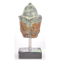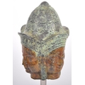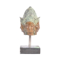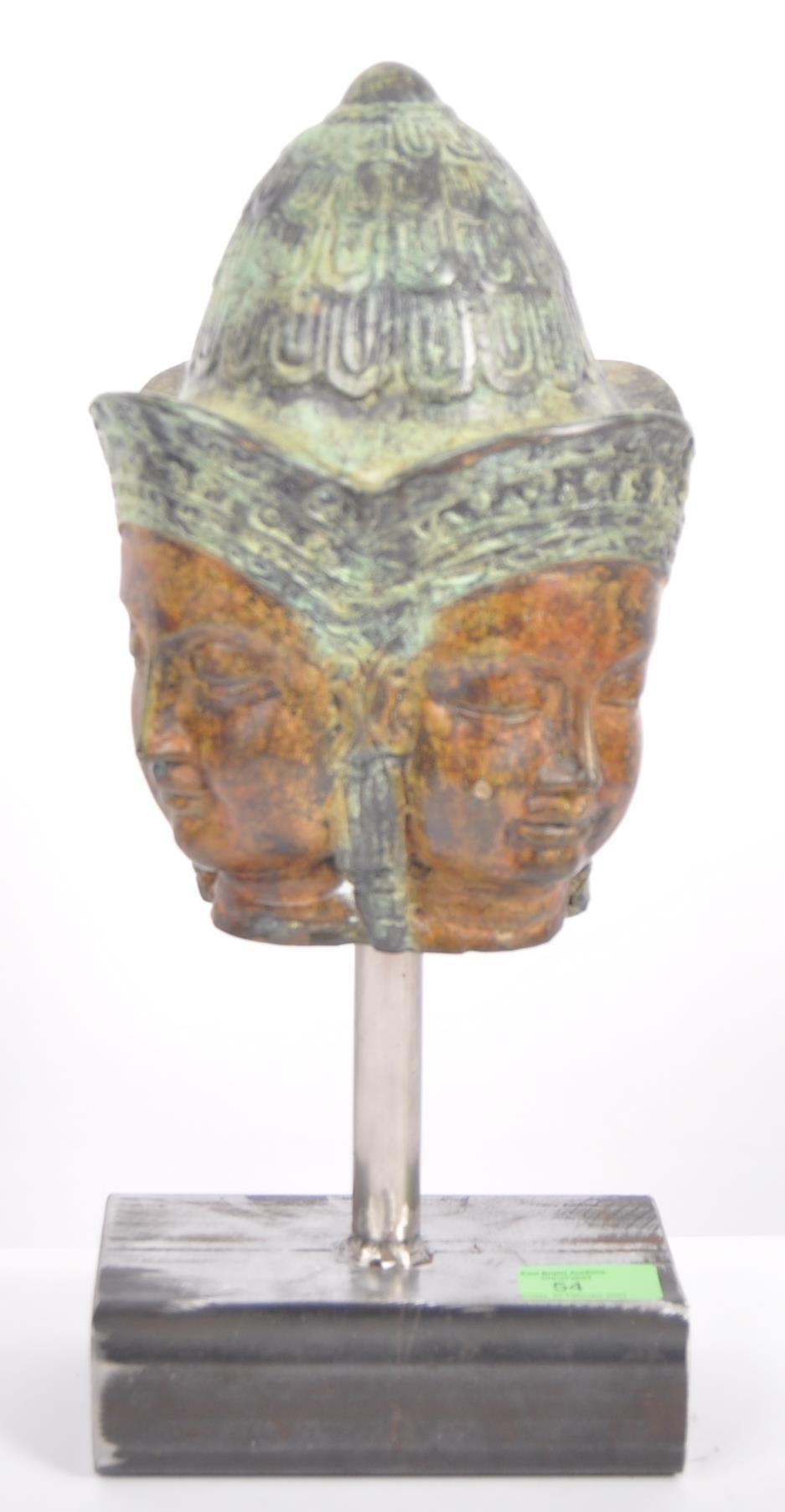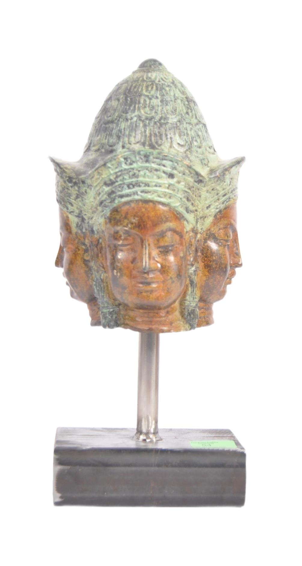A 20th Century Chinese Tibetan Thai bronze Buddha Phra Phrom four headed head. Cast features with two tone finish green verdigris crown. Raised on a polished metal stand. Measures approx; 38cm tall.