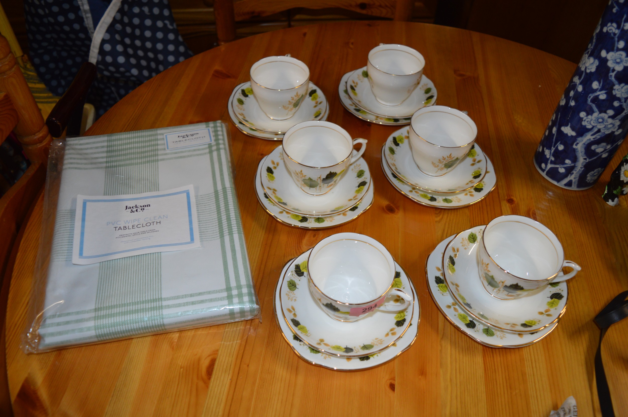 A Duchess Bone China Six Place Settings (Cups, Saucers and Cake Plates) plus a Brand New White Clean Tablecloth 137cm x 183CM