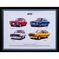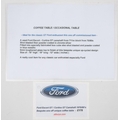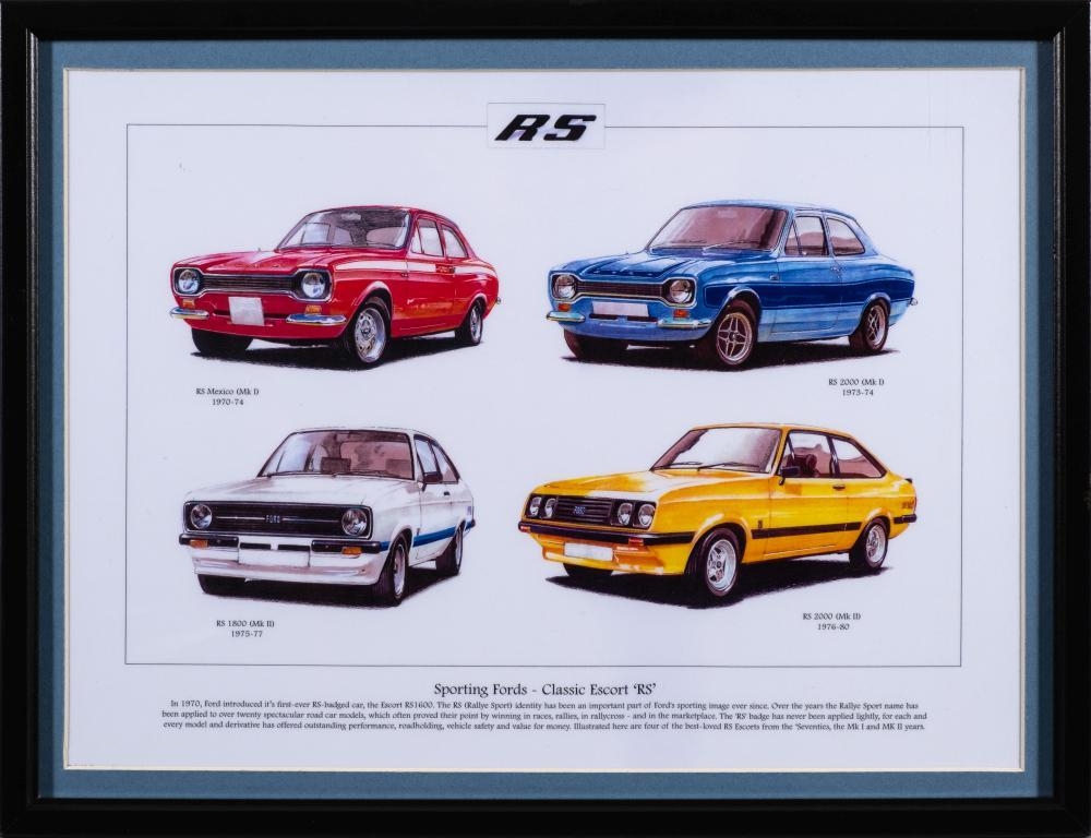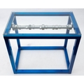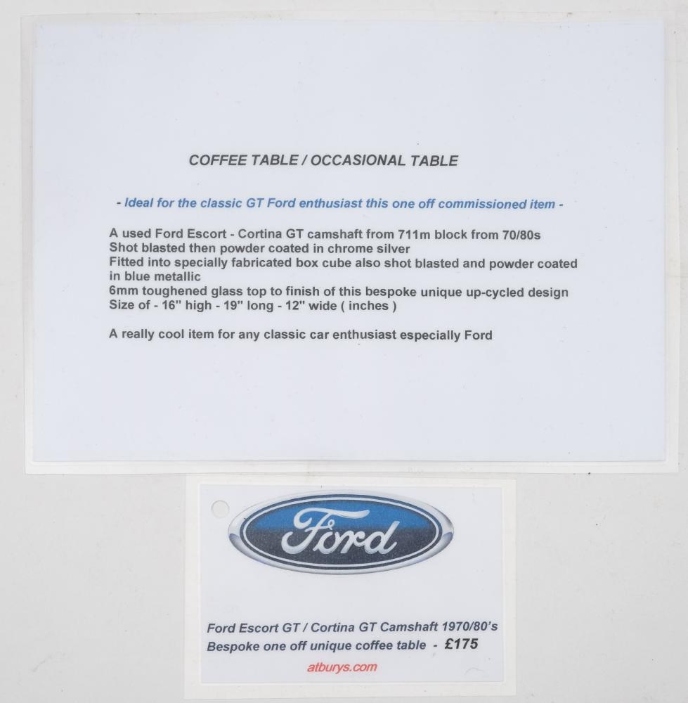 A Ford Camshaft coffee table: constructed from a silver powder coated Ford Escort/Cortina GT camshaft mounted in a blue metallic powder coated frame with glass top, 42 x 48 x 30cm, together with a framed print of Ford Escorts.