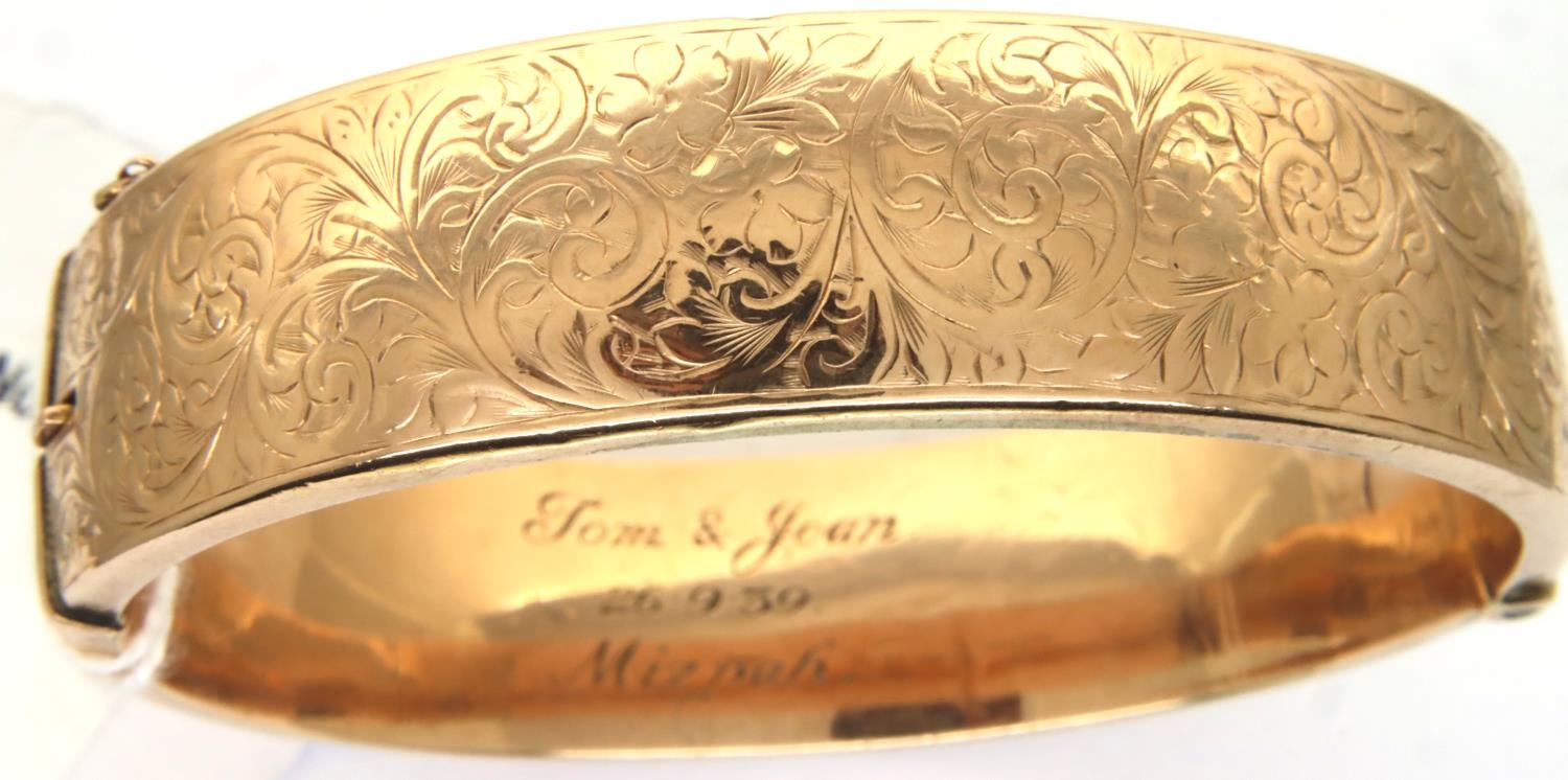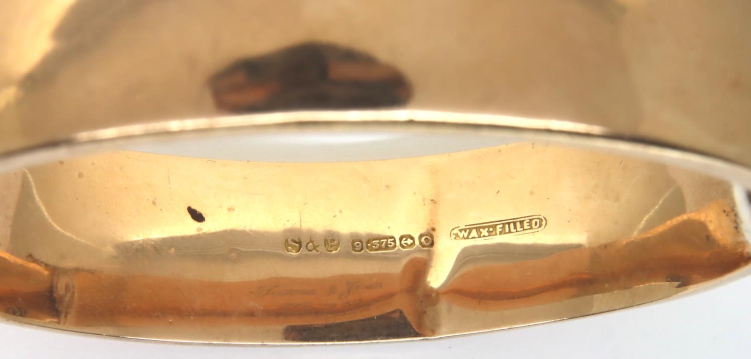 Hallmarked 9ct gold wax filled snap bangle, D: 5.5 cm 33.0g. P&P Group 1 (£14+VAT for the first lot and £1+VAT for subsequent lots)