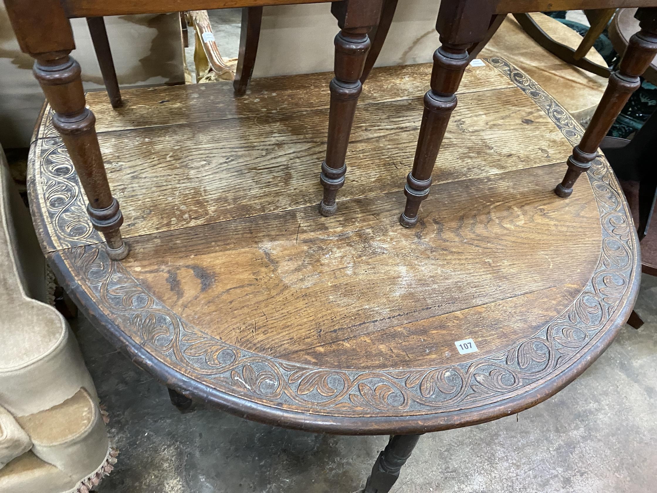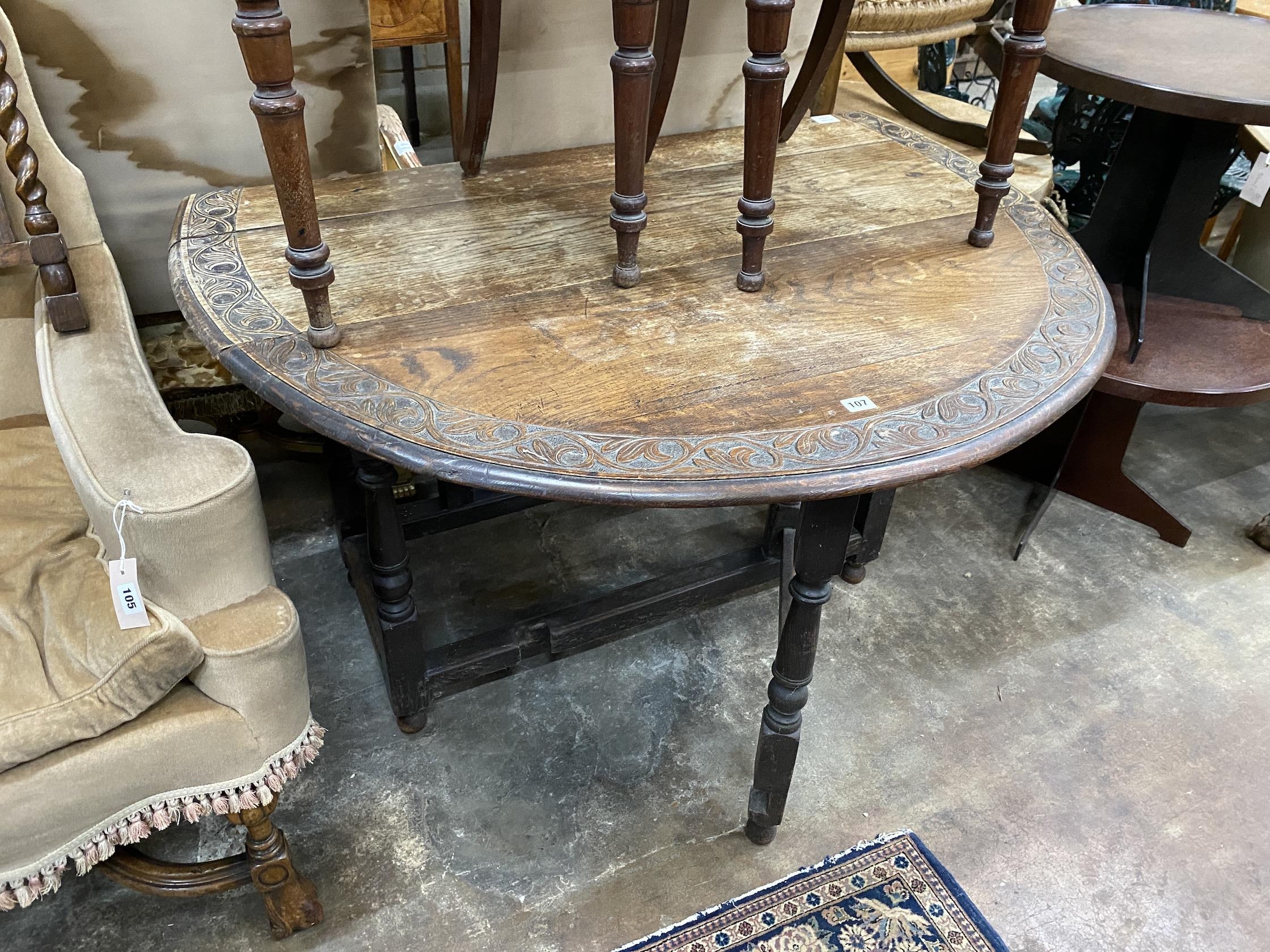 An early 20th century carved oak gateleg table, width 120cm, depth 44cm, height 74cm