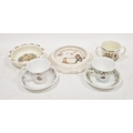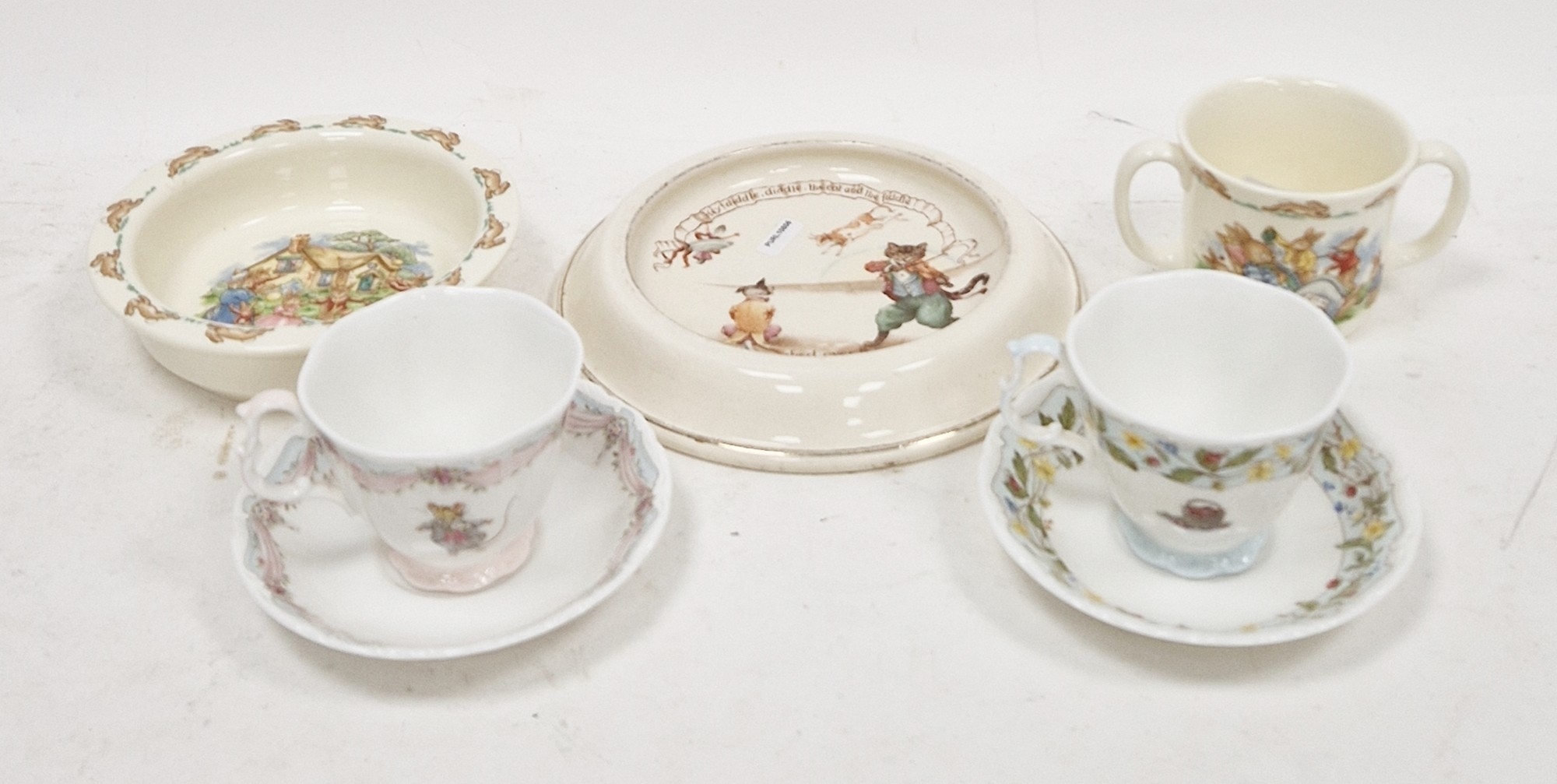 Group of Royal Doulton Bunnykins nursery wares including a two-handled mug, feeding bowl, Royal Doulton Hey Diddle Diddle the Cat and the Fiddle feeding bowl and two Royal Doulton The Engagement and The Wedding teacups and saucers, various printed factory marks