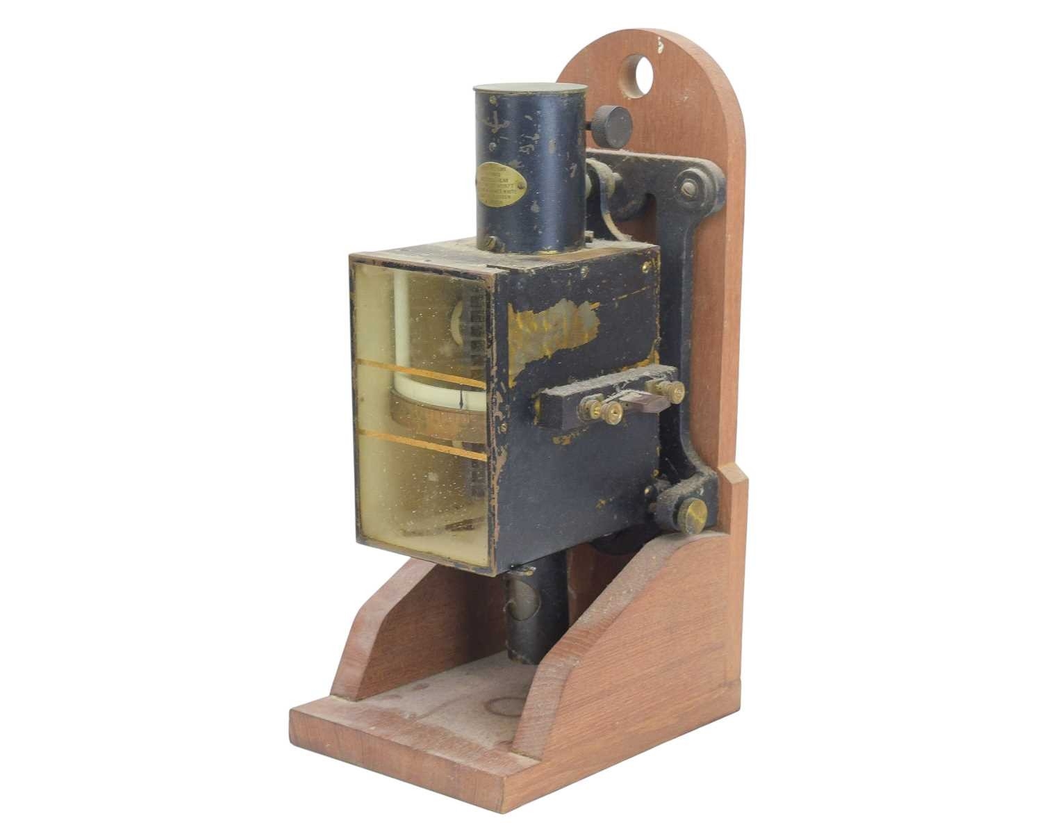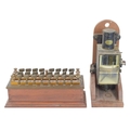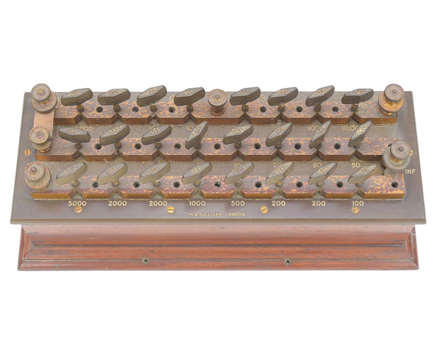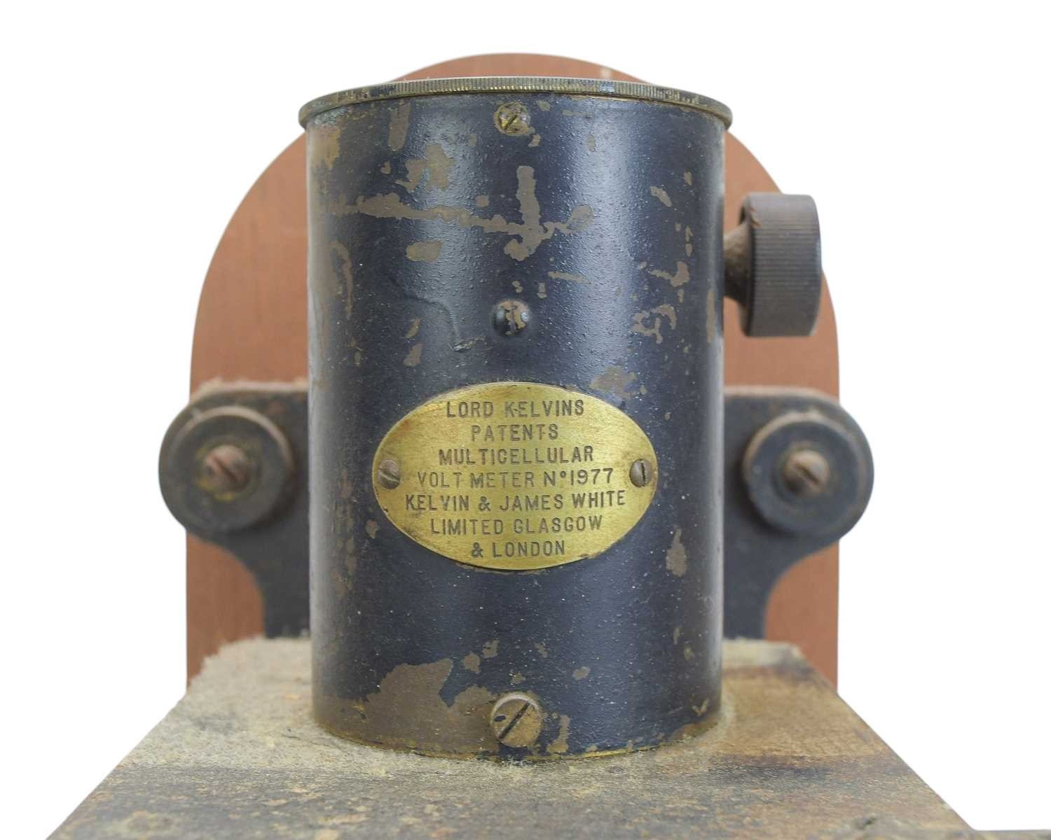 A Kelvin & James White multicellular volt meter. Lord Kelvin's patent, No 1977, height 35cm, mounted on a mahogany stand, together with a Manganin mahogany and bakelite resistance box by H.W. Sullivan (2).