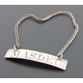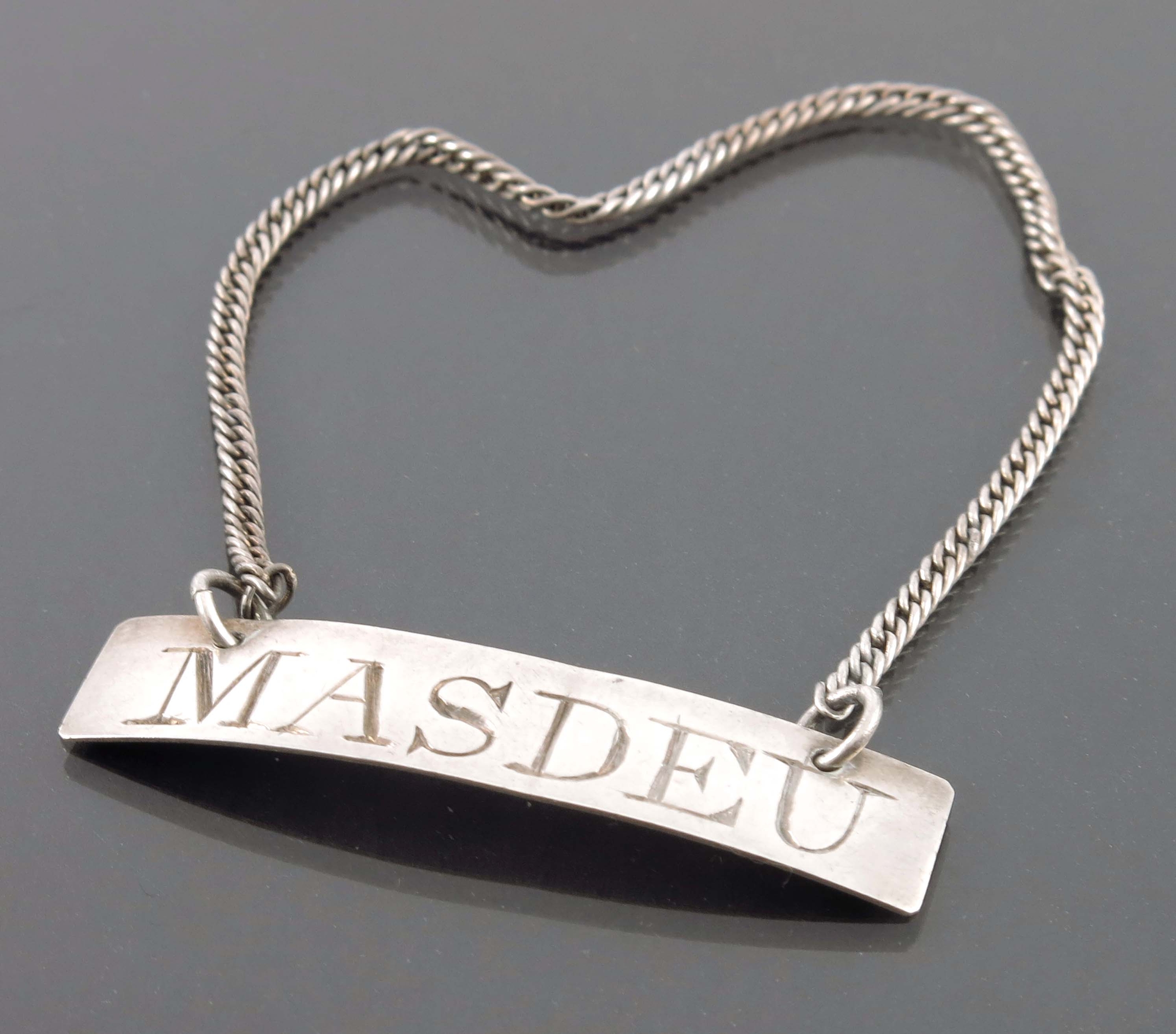 A 19th century silver wine label for Masdeu, unmarked, circa 1800, plain rectangular form, suspended on a curb chain, 4.5cm, 0.14ozt Note: Masdeu refers to a vineyard in the Spanish Priorat region which has produced wine since the 13th century; part of the Scala Dei Carthusian monastery