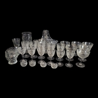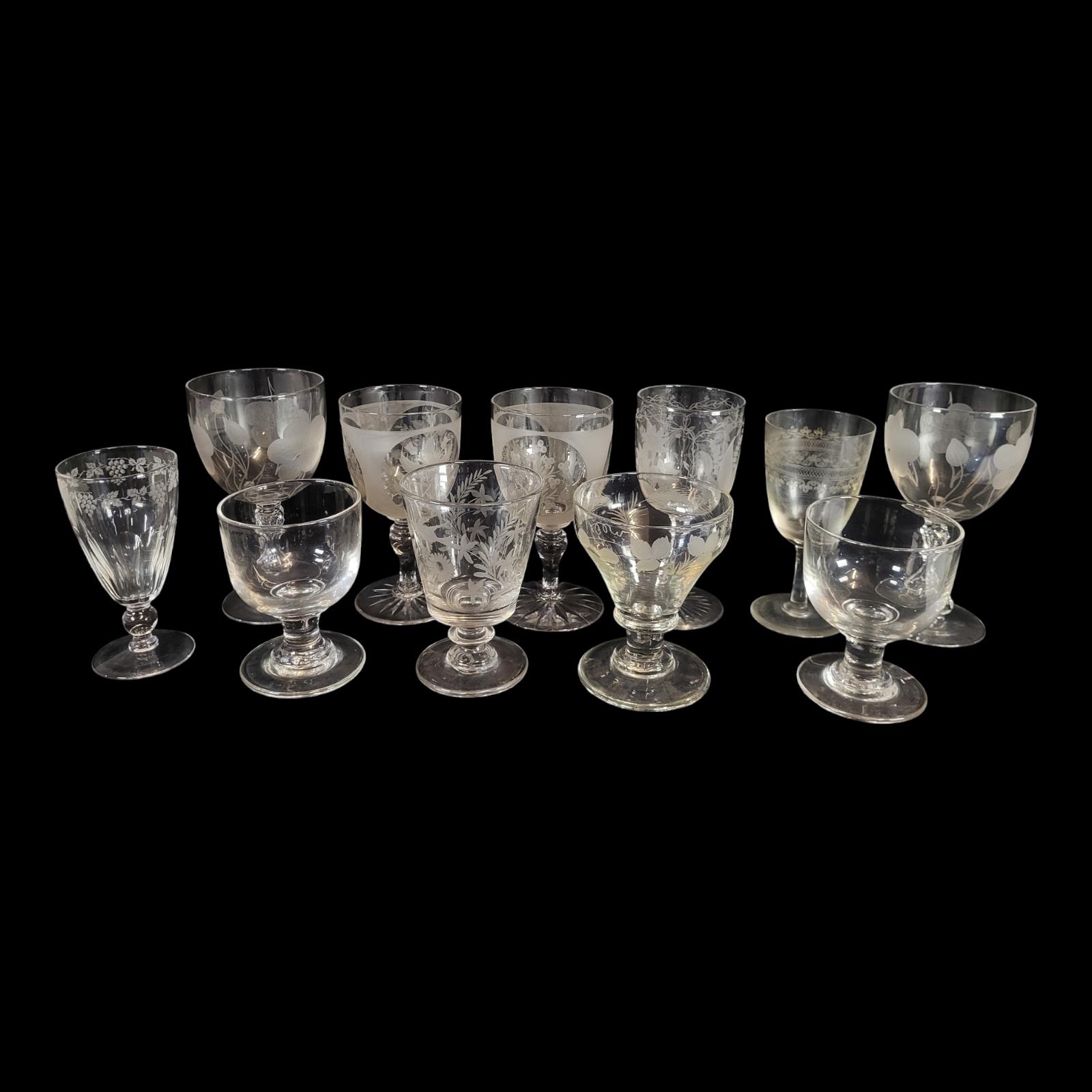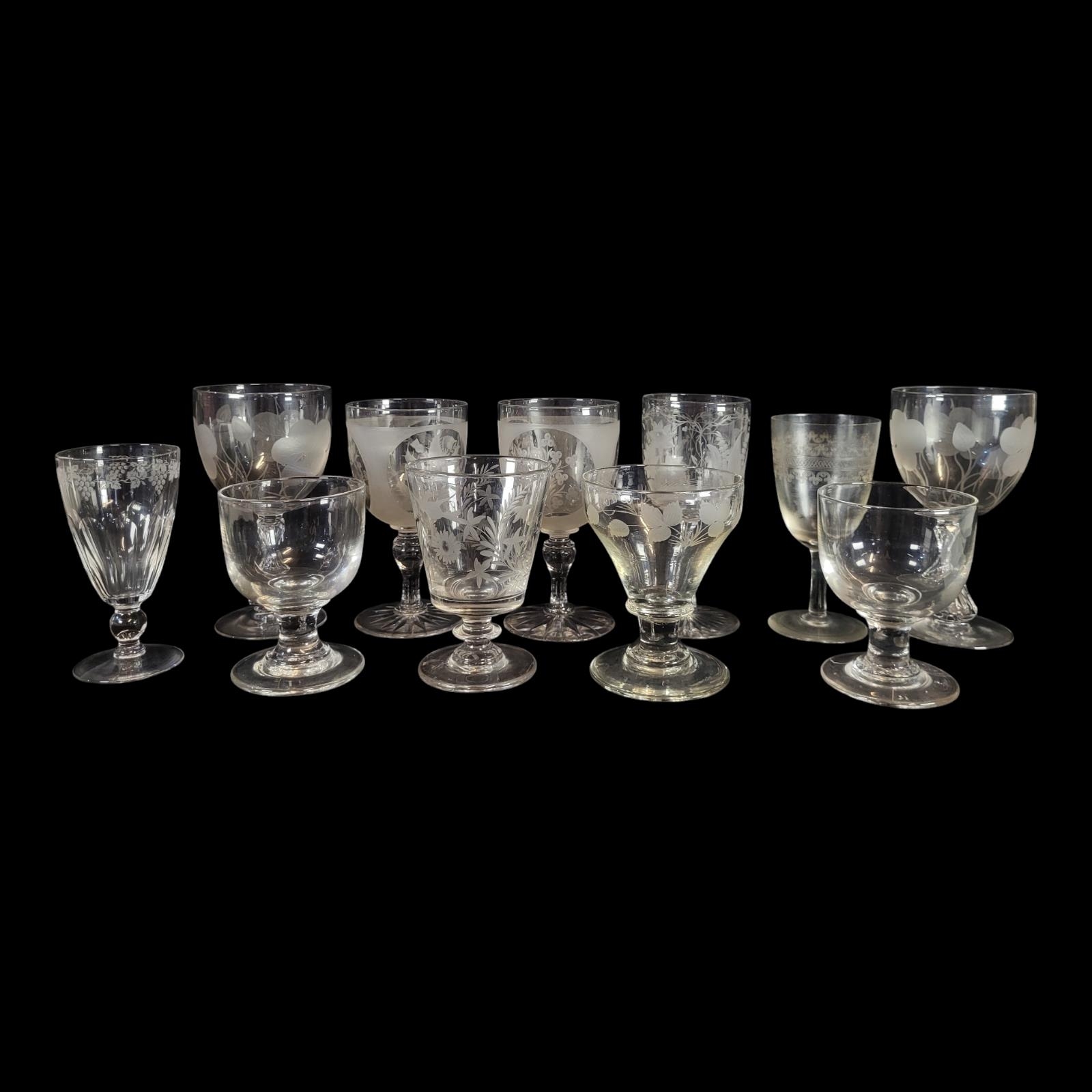 Plain form with stepped base, together with two 19th Century etched rummer glass and two pairs of larger etched glasses.