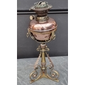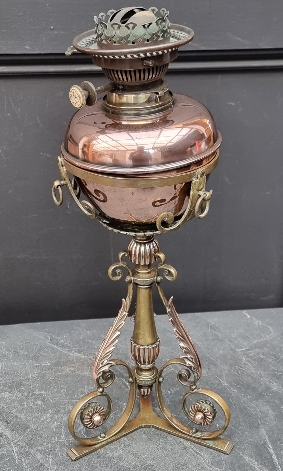 An Arts & Crafts copper and brass oil lamp, total height 49cm, (reservoir associated).