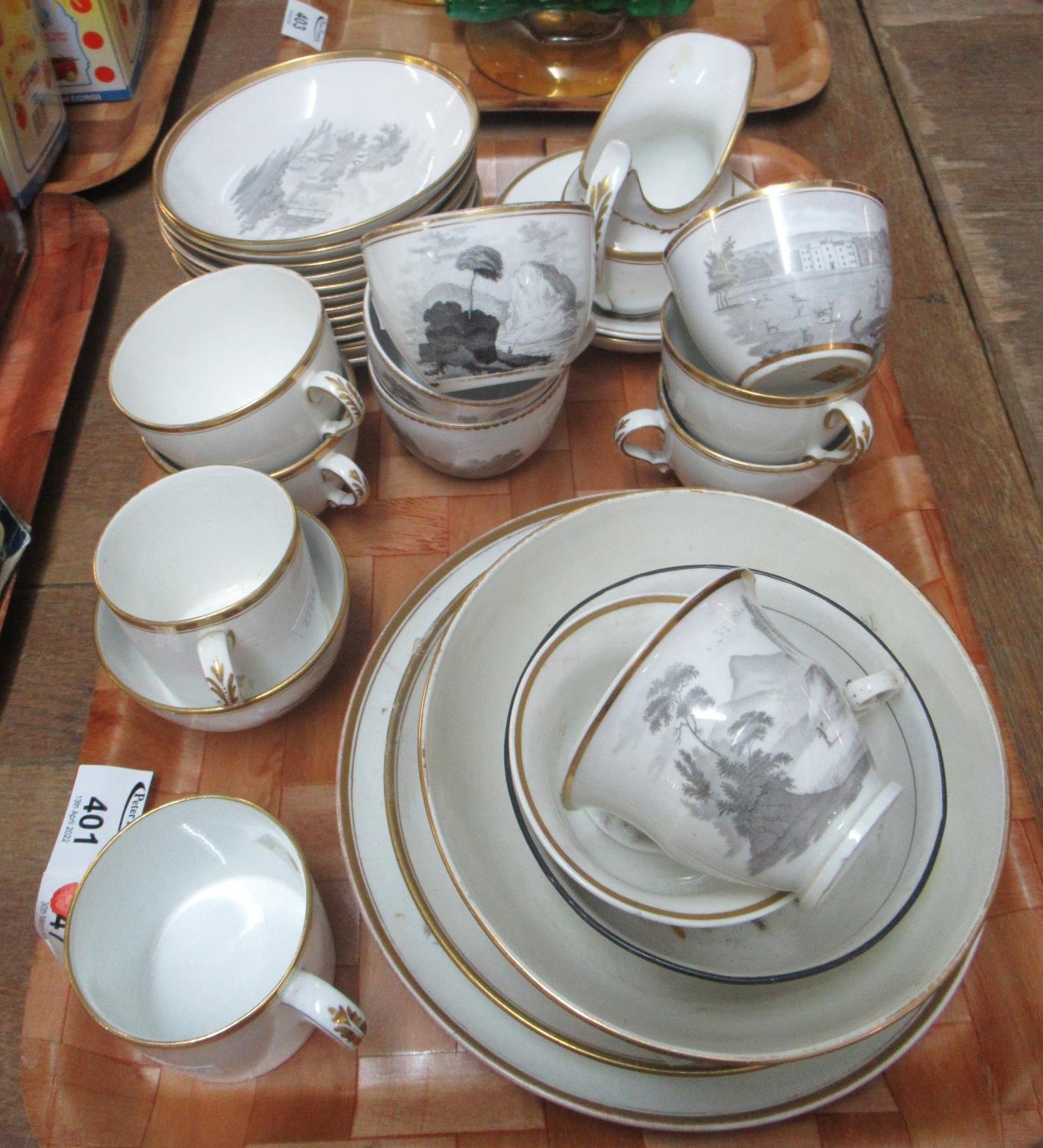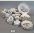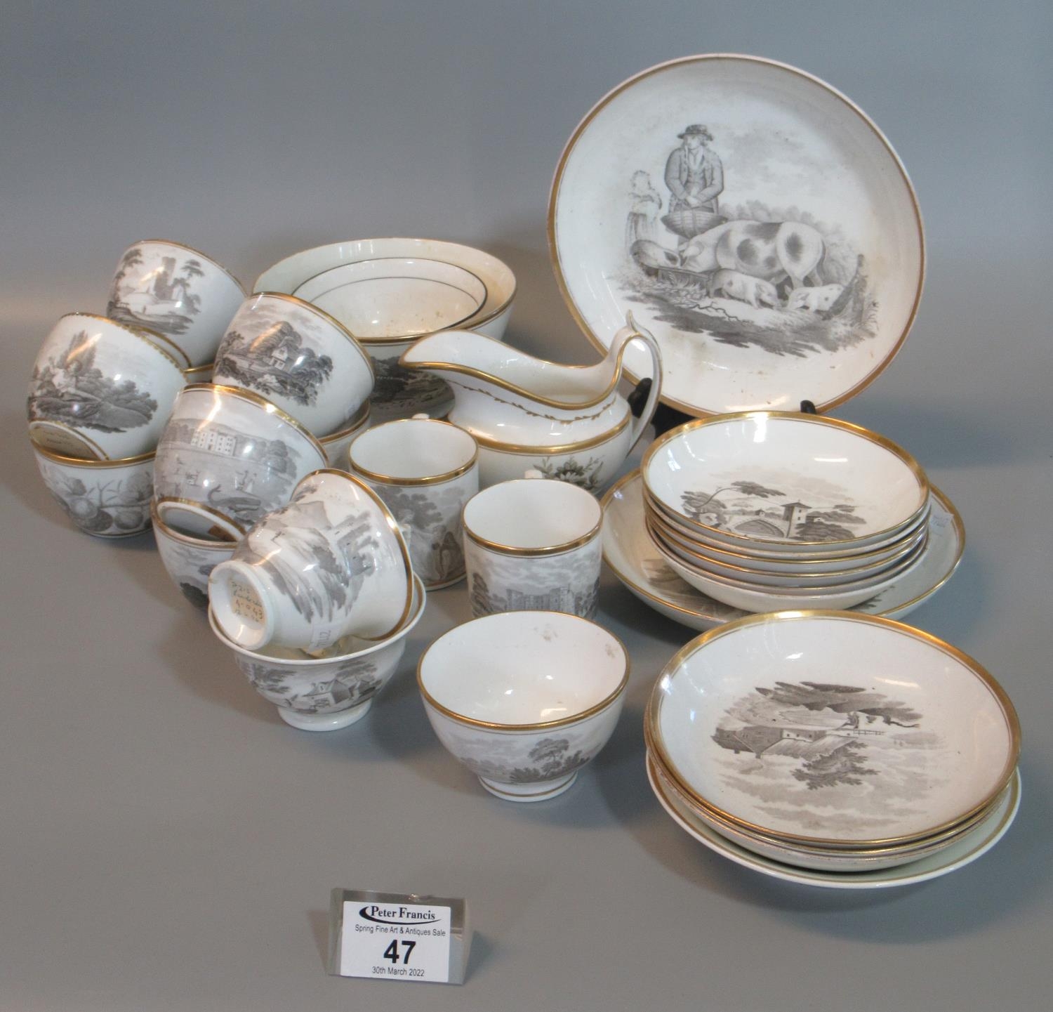 Group of 19th Century bat printed black and white transfer printed china items to include tea cups, coffee cans and saucers, cream jug, sucrier etc, overall with varying designs of fruits, animals, farming, topographical etc