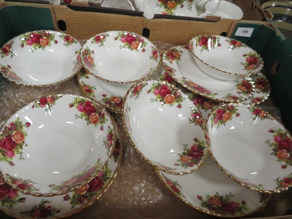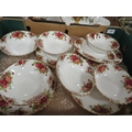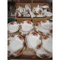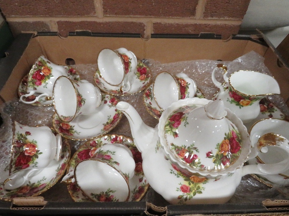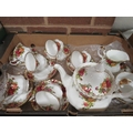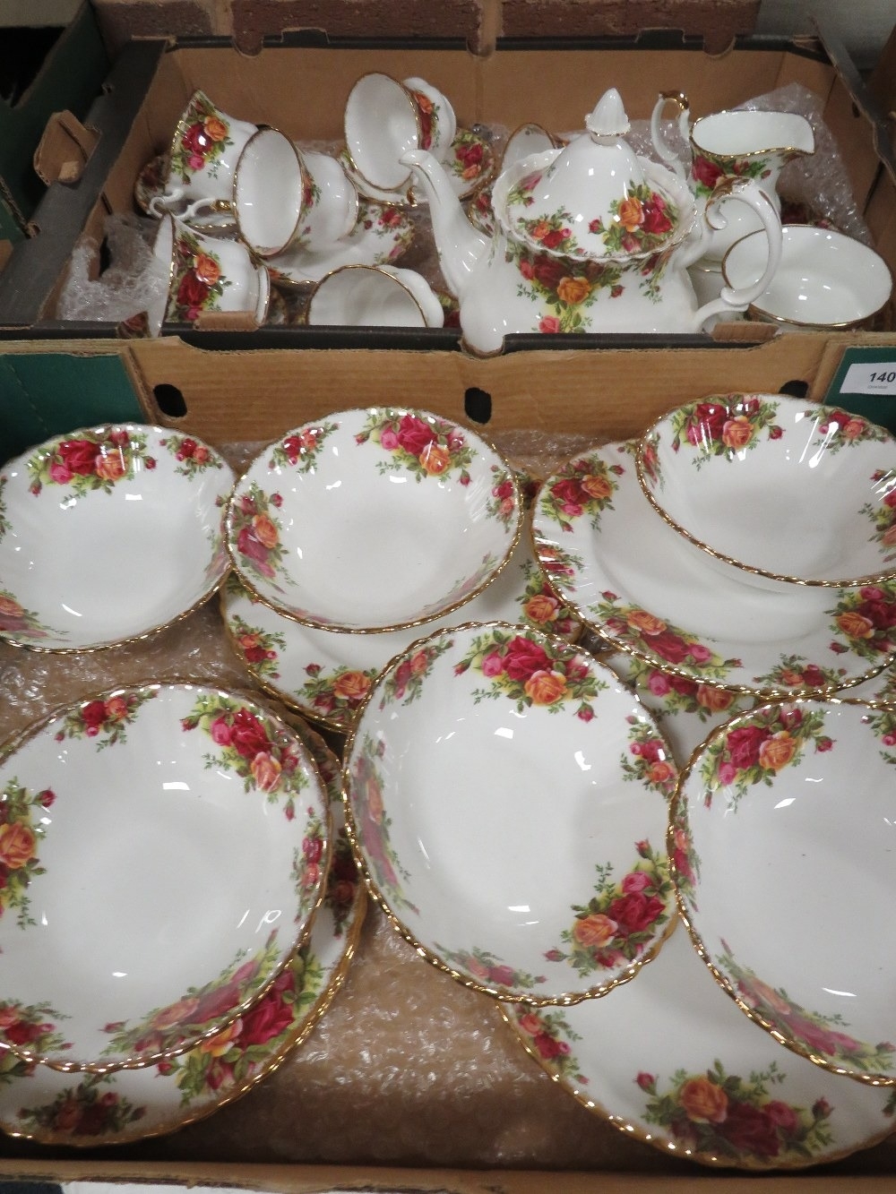 Two trays of Royal Albert Old Country Roses, teapot, milk, sugar, tray, cake plate, 6 cups, 6 saucers, 6 bowls, and 6 plates