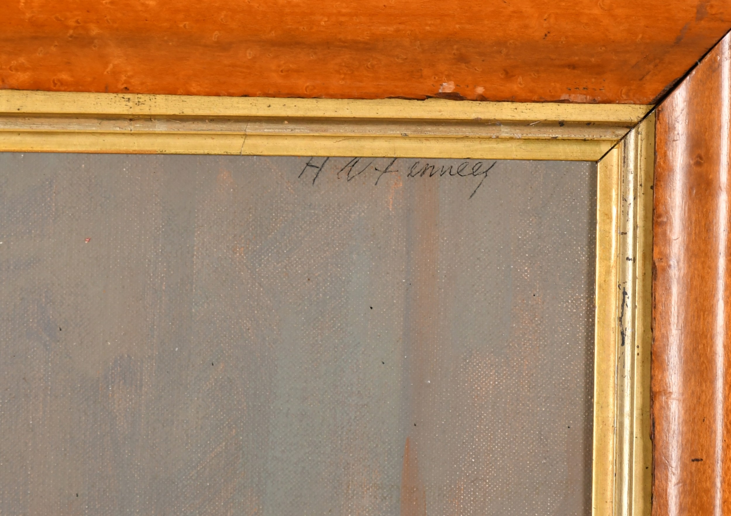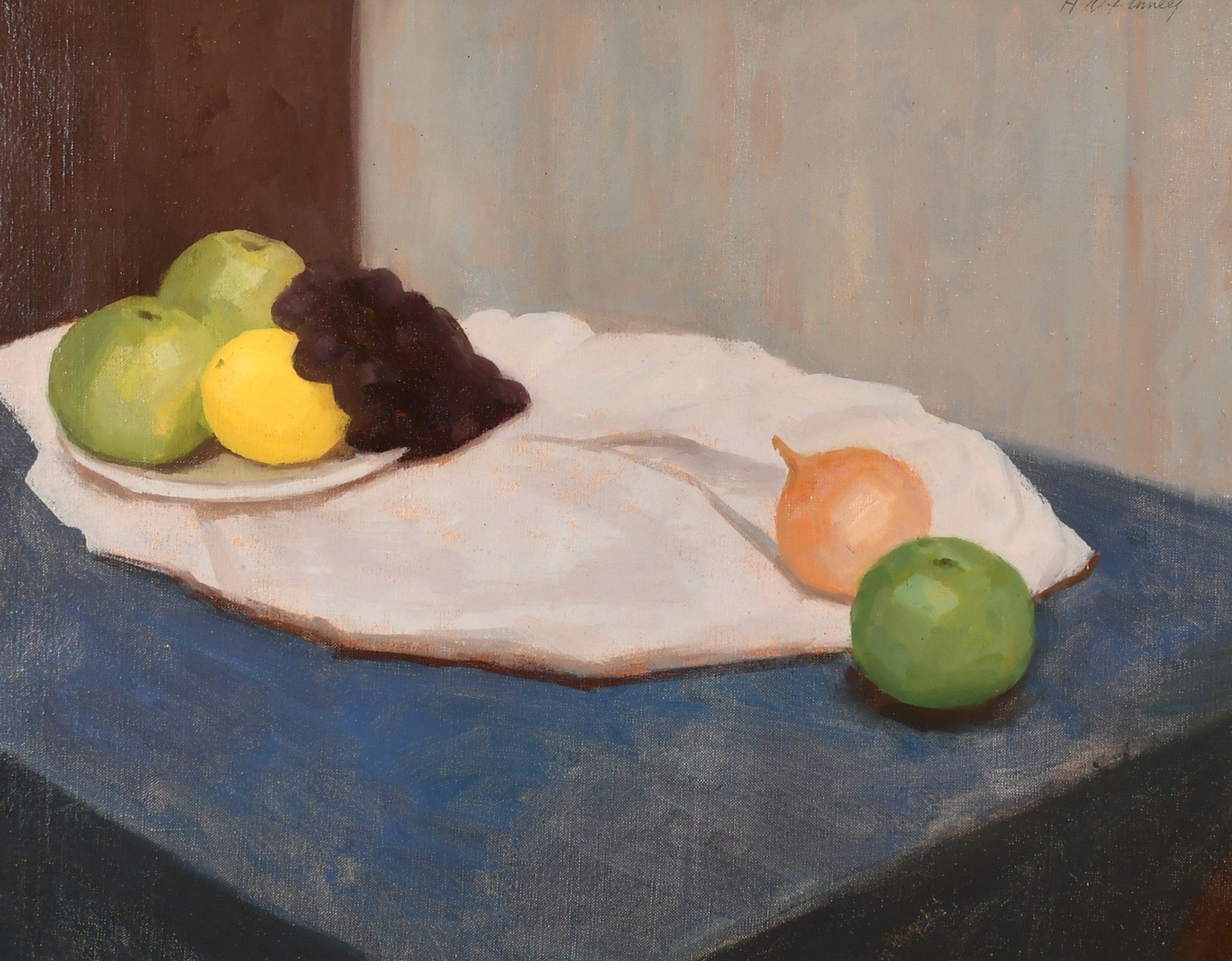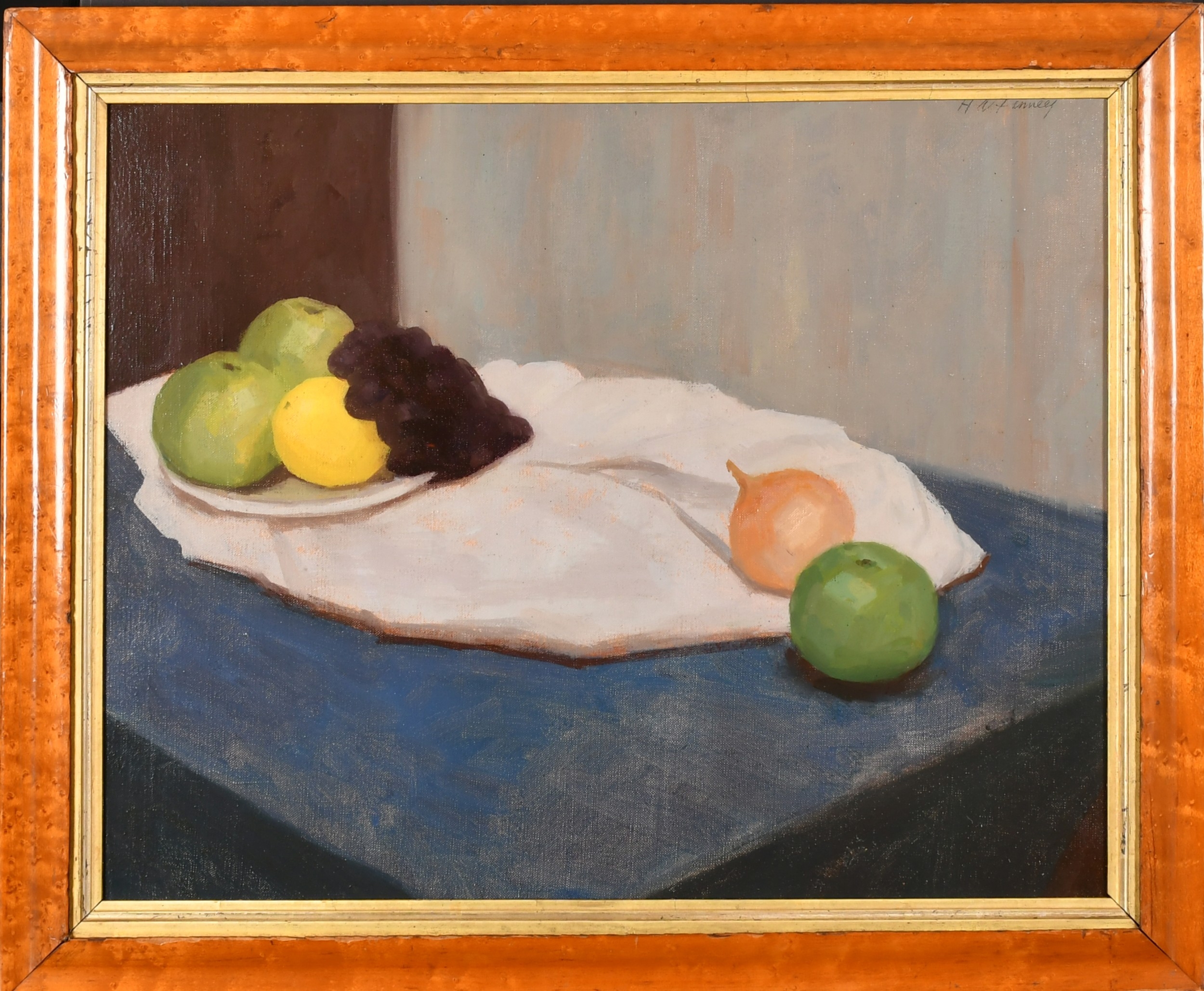Hubert Arthur Finney (1905-1991) British. Still Life on a Table, Oil on canvas, Signed, In a maple frame 17.75" x 21.5" (45.1 x 54.6cm). Provenance: The artist's family