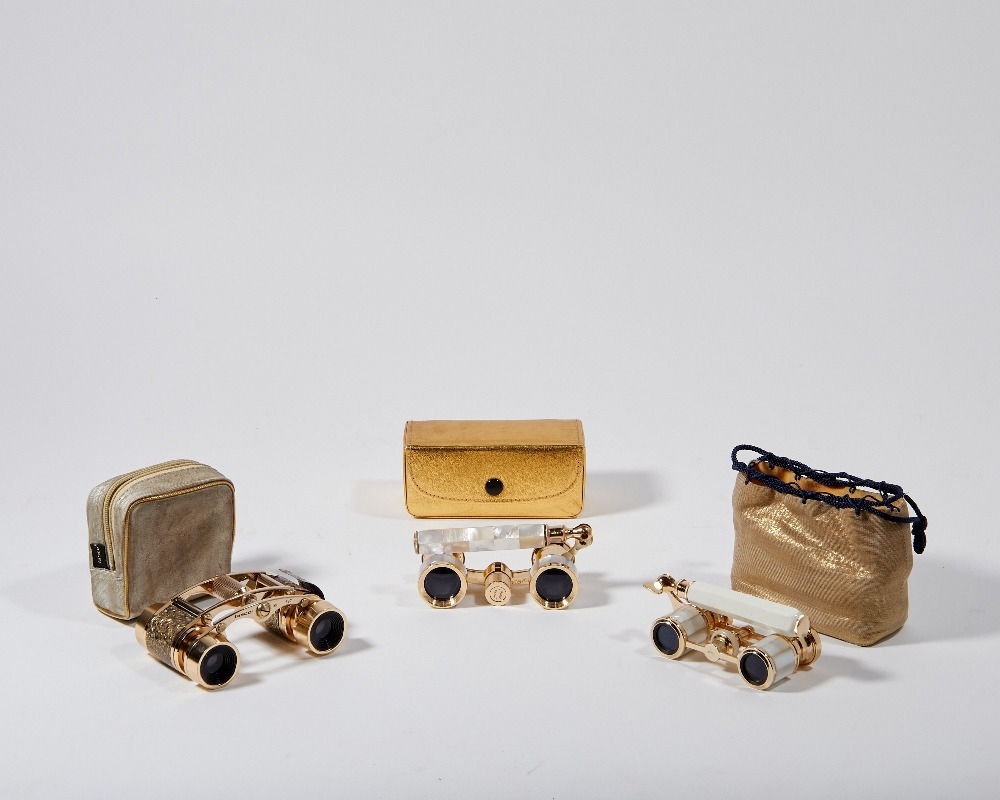 Three sets of opera glasses, comprising: two Japanese 2.5x zoom brass and mother-of-pearl mounted examples, 'Constellation' and 'Mignon', with handles and carry cases, together with a Tasco 3x zoom brass and enamelled example, with carry case (3)