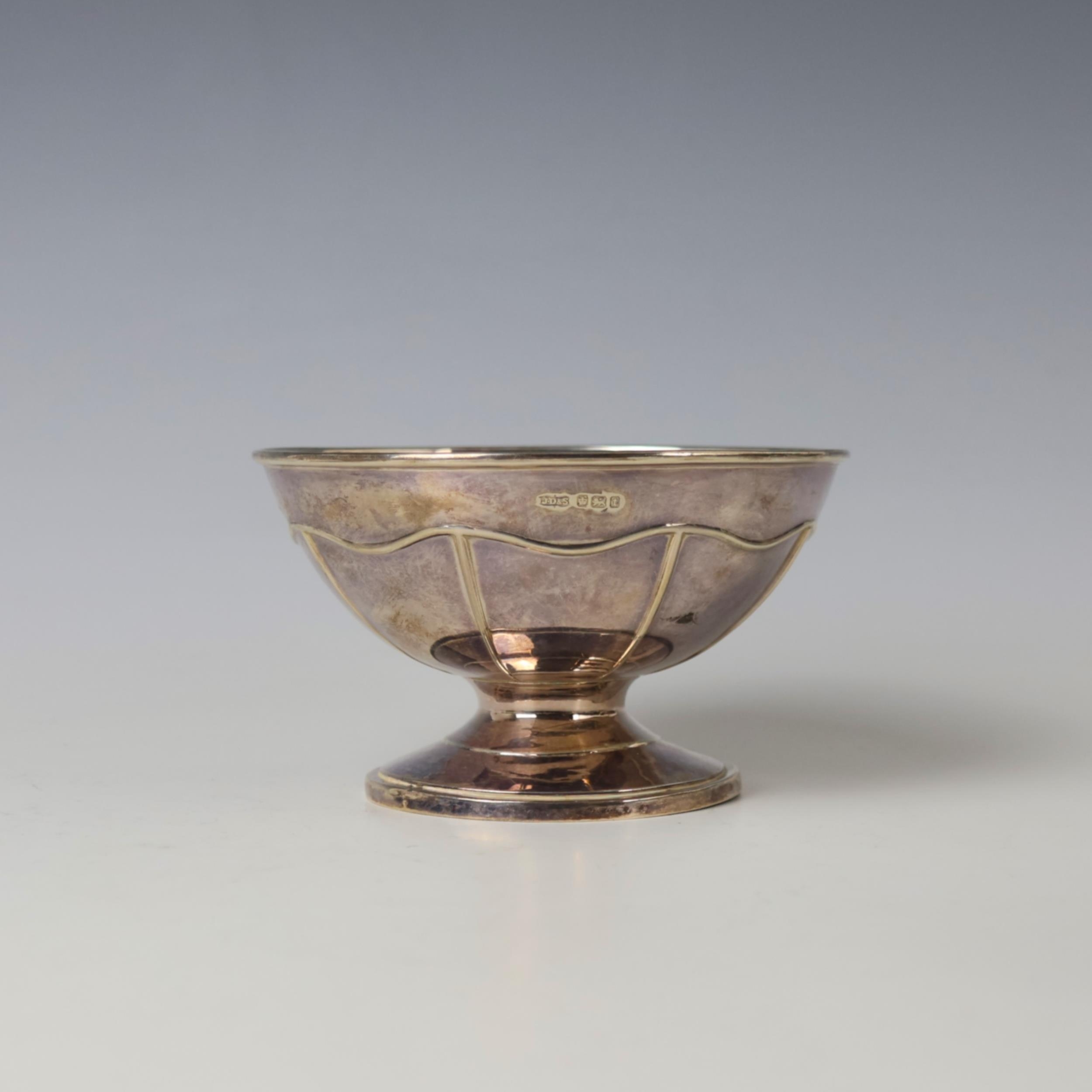 A George V silver bonbon dish, James Dixon & Sons Ltd, Sheffield 1911, the circular formed bowl with stylised embossed decoration, upon pedestal base and circular foot, 7.5cm high, 4ozt
