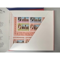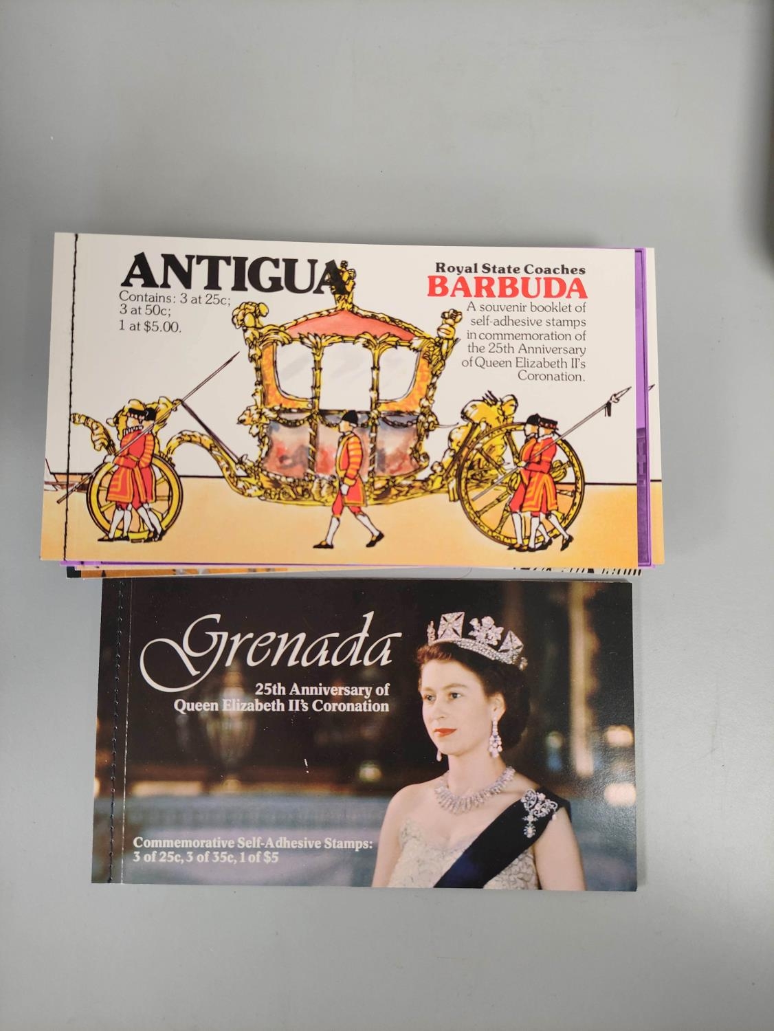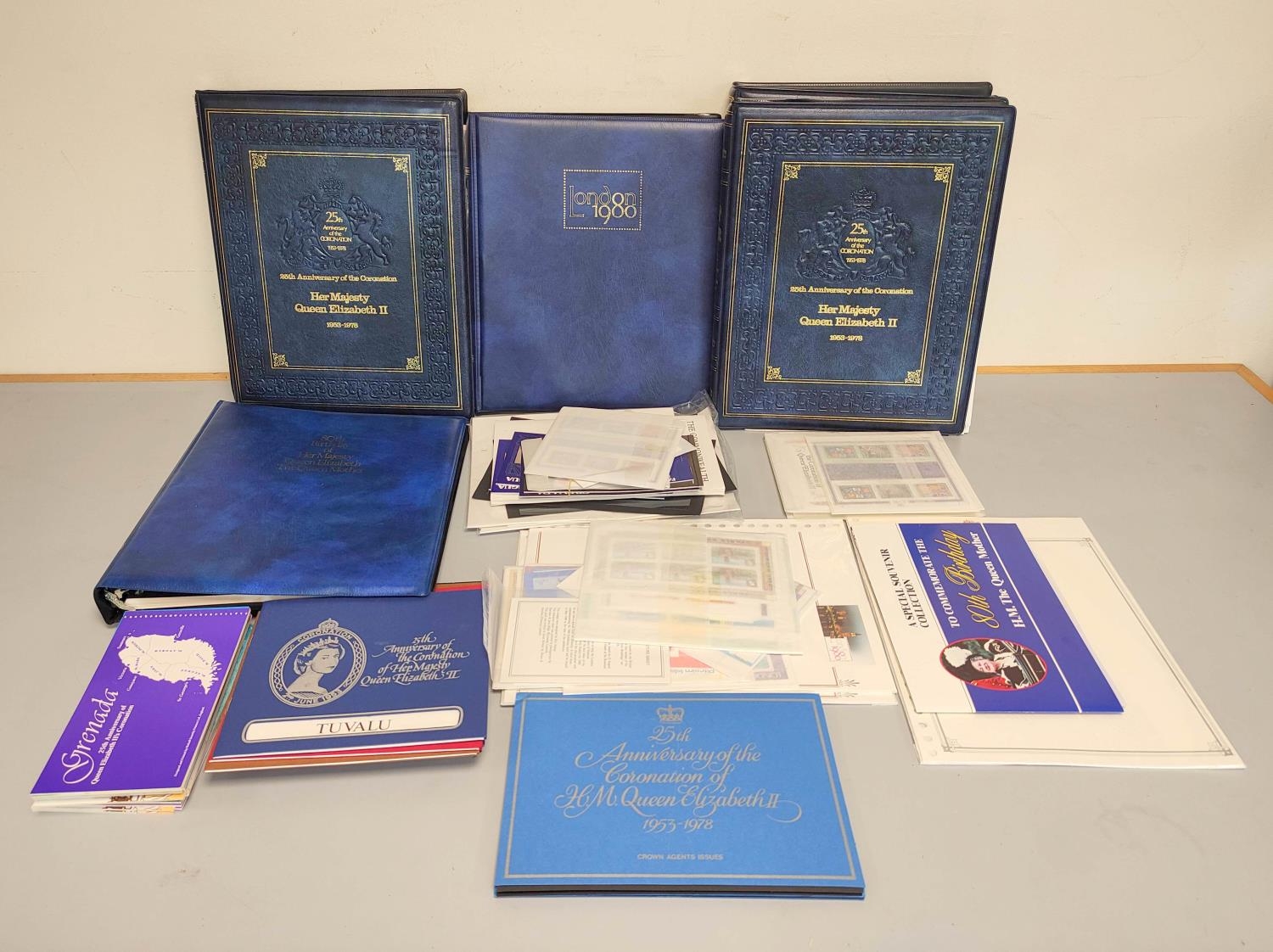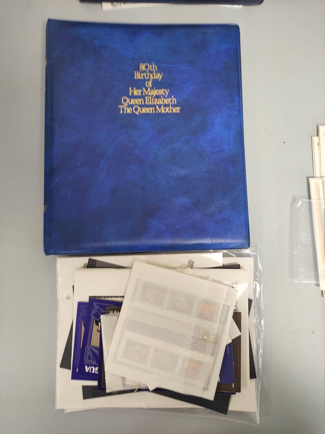 Box containing a large quantity of postage stamps and albums relating to Royal commemorative events such as the Queen Mother's 80th birthday. Many sealed. To include British and commonwealth issues.