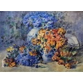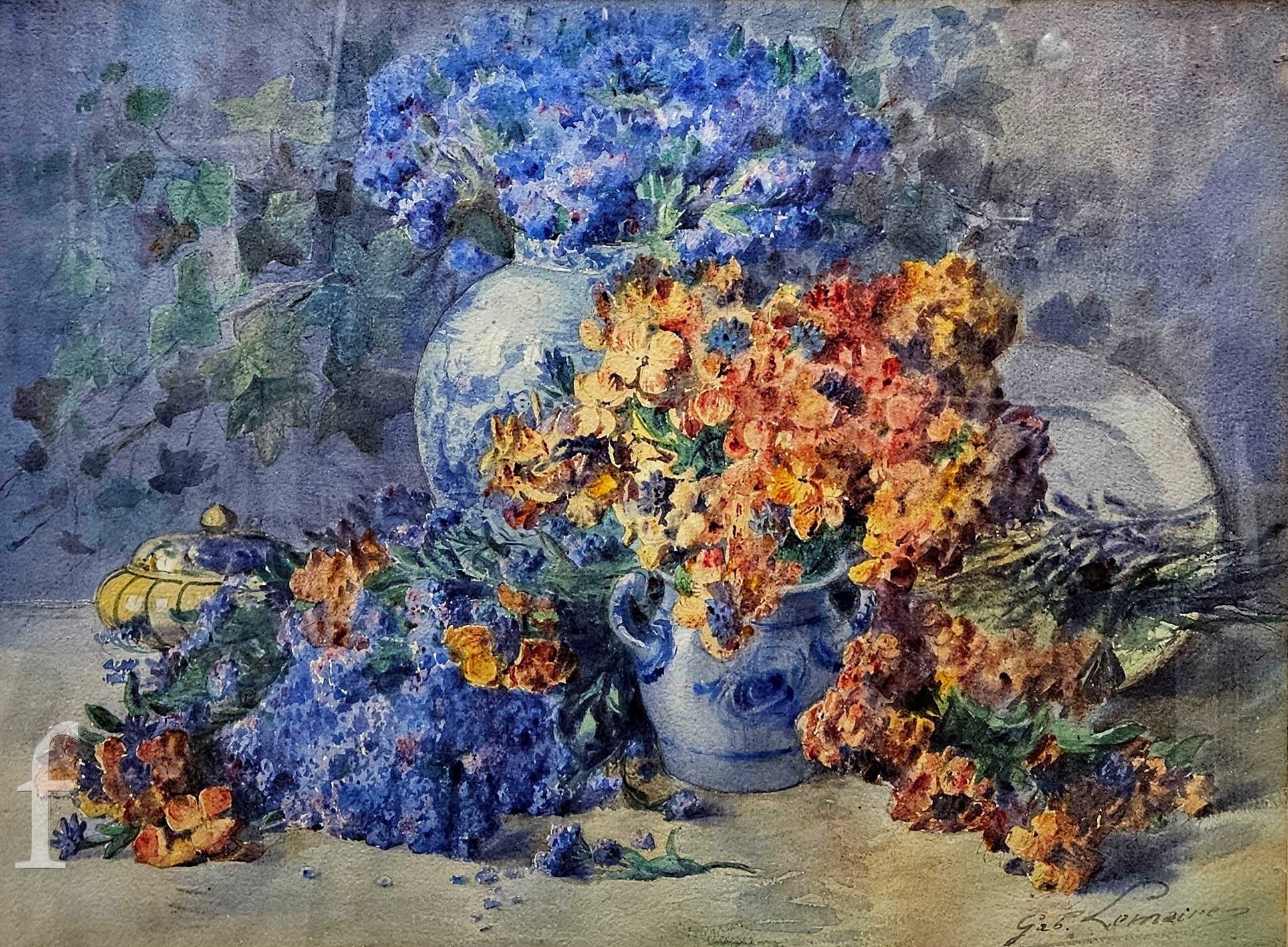 Gabrielle Lemaire (1880-1976) – Still life with flowers in blue and white vases, watercolour, signed, framed, 56cm x 75cm, frame size 80cm x 100cm.