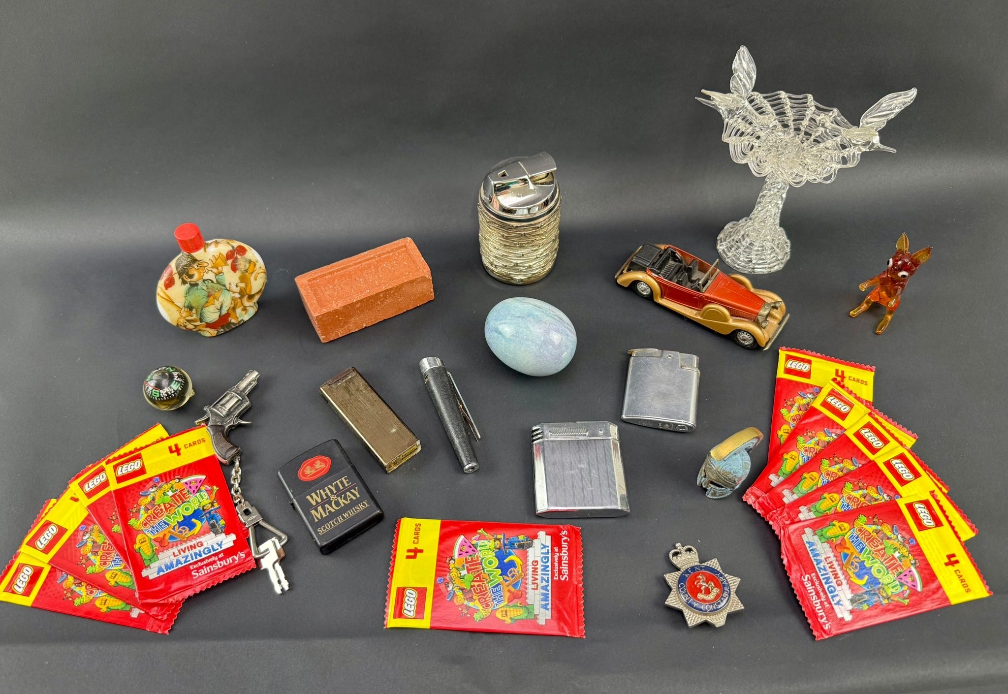 Mixed lot inc glass ornaments, Lego card packs, Pearce brick model, onyx egg and more