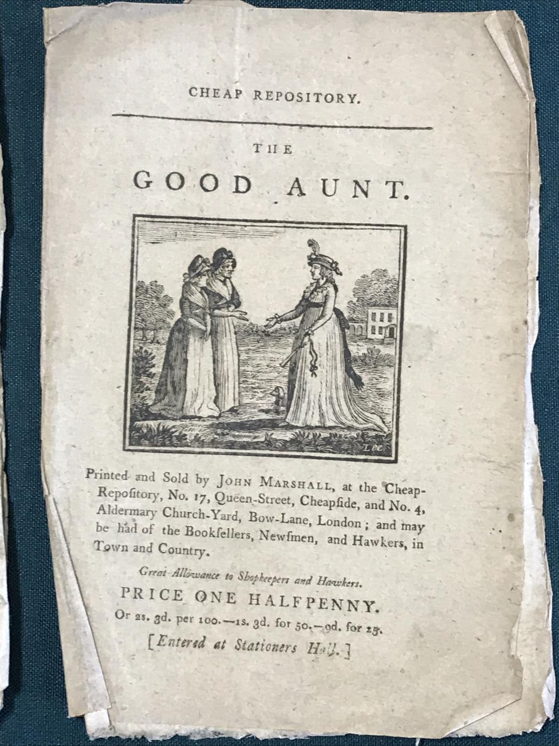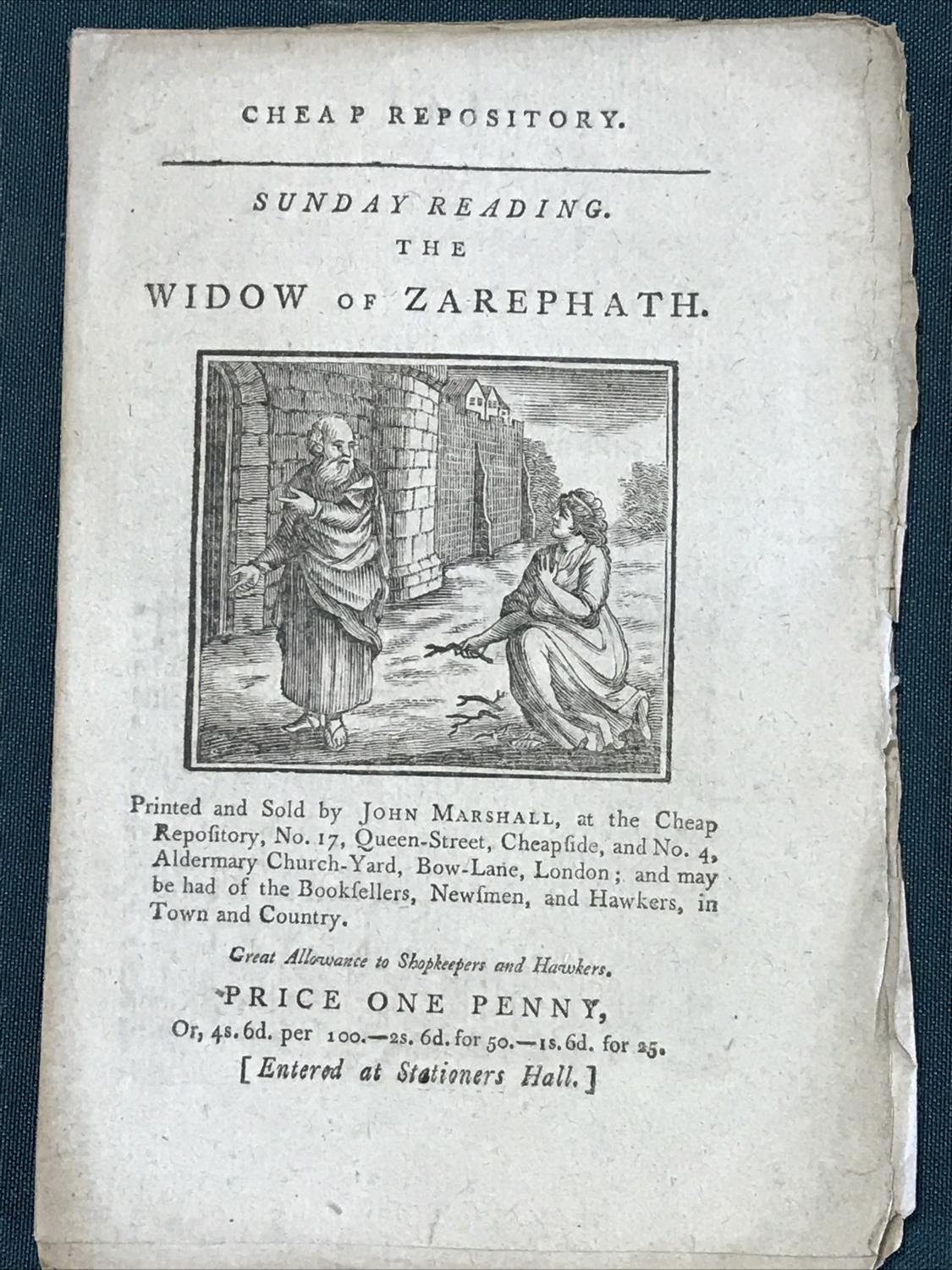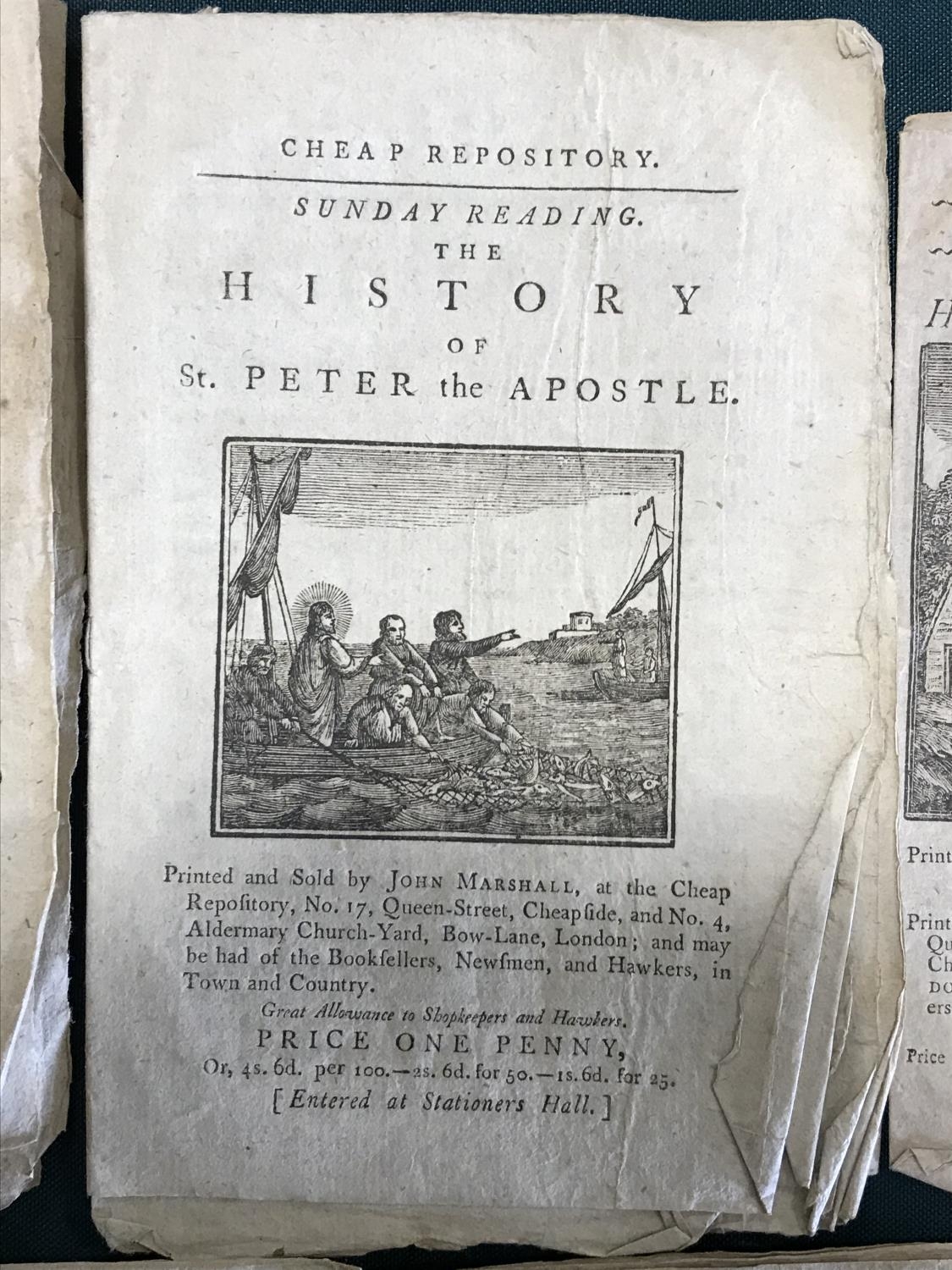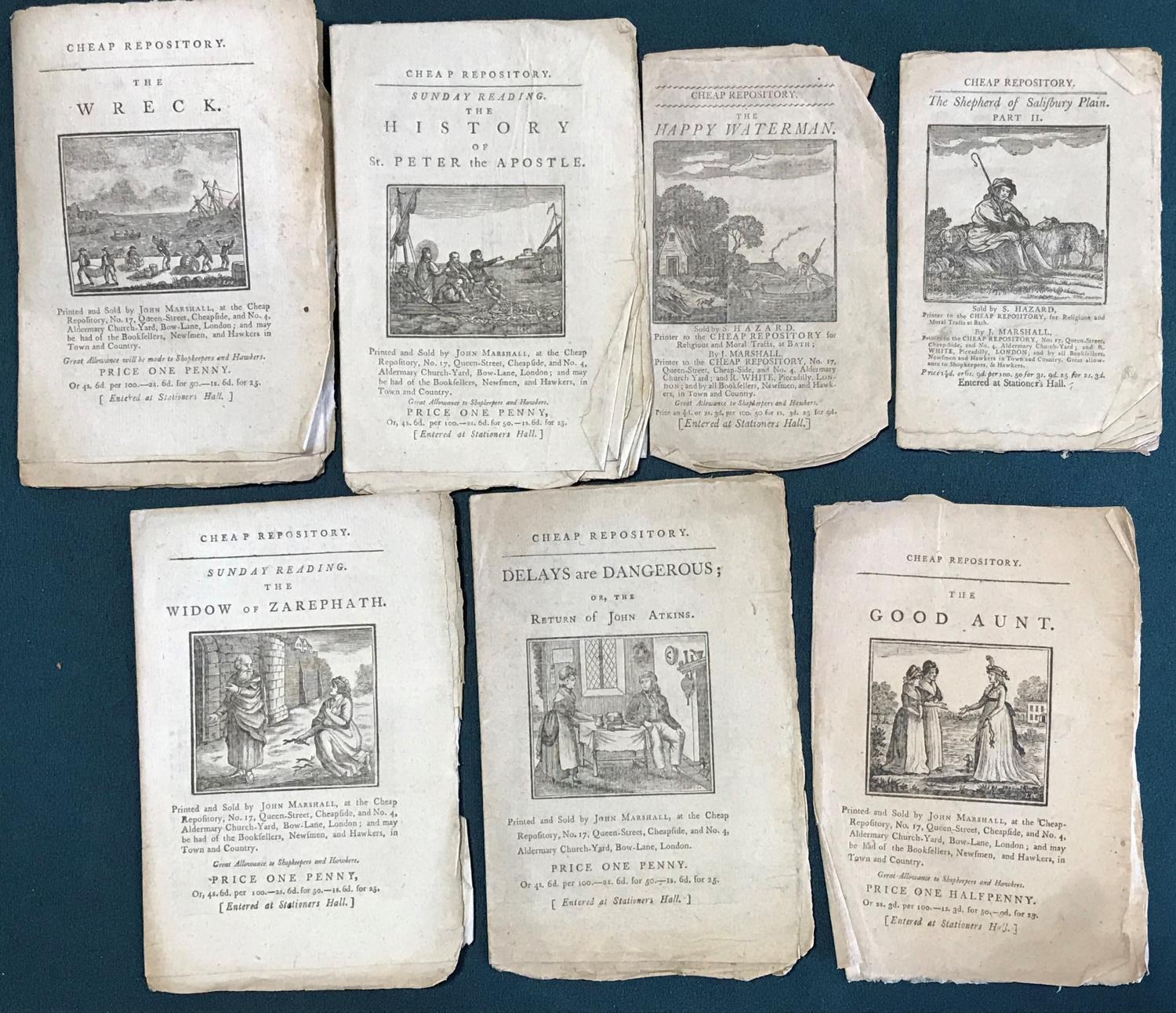 Marshall, John, publisher. A collection of seven Cheap Repository Chapbooks, including; [More, Hannah] The Happy Waterman, 12pp., [n.d.]; [More, Hannah] The Shepherd of Salisbury Plain, Pt. 2, 32pp., [n.d.]; [Anon] Sunday Reading. The Widow of Zarephath, 16pp., [c.1798]; [Anon] Delays are Dangerous; or, The Return of John Atkins, 16pp., [c.1798]; [Anon] Sunday Reading. The History of St. Peter the Apostle, 16pp., [c.1797]; [Anon] The Good Aunt, 8pp., [c.1798]; [Anon] The Wreck, 16pp., [c.1798], all with wood-engraved illustrations, slight browning, original wrappers, 8vo