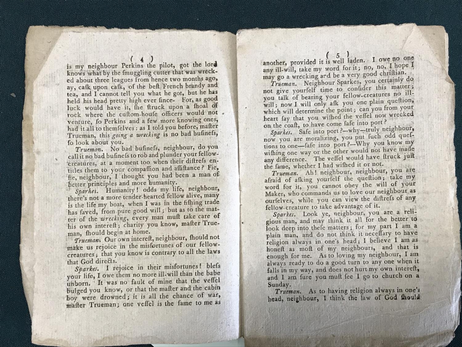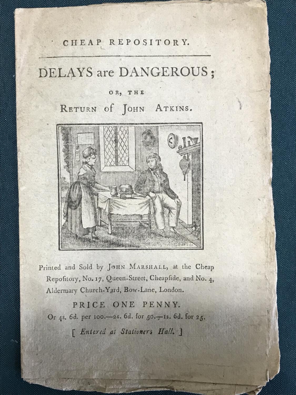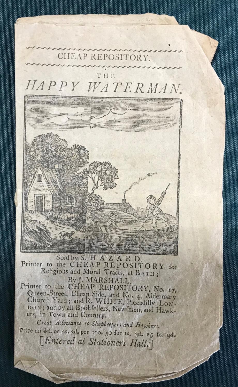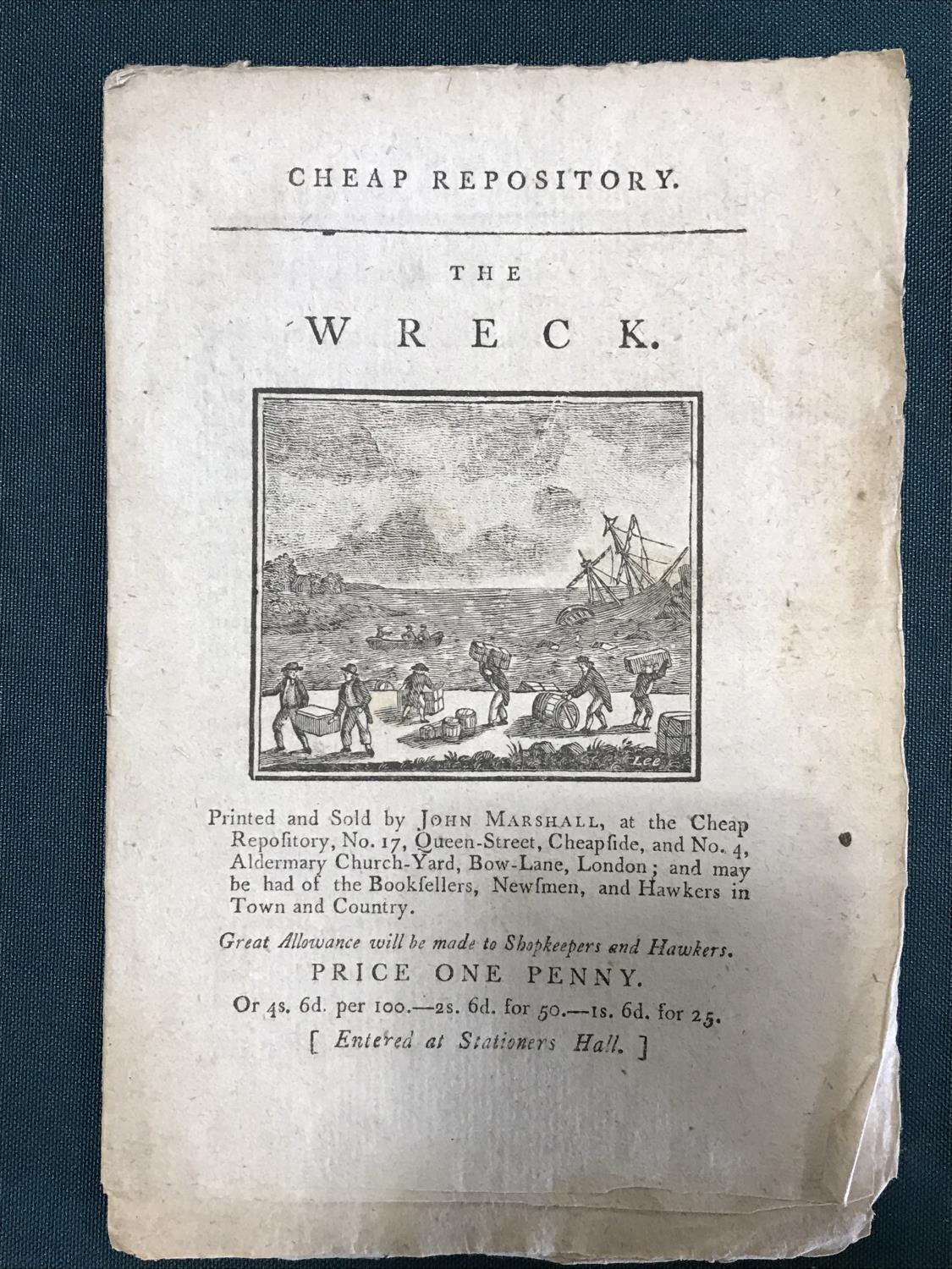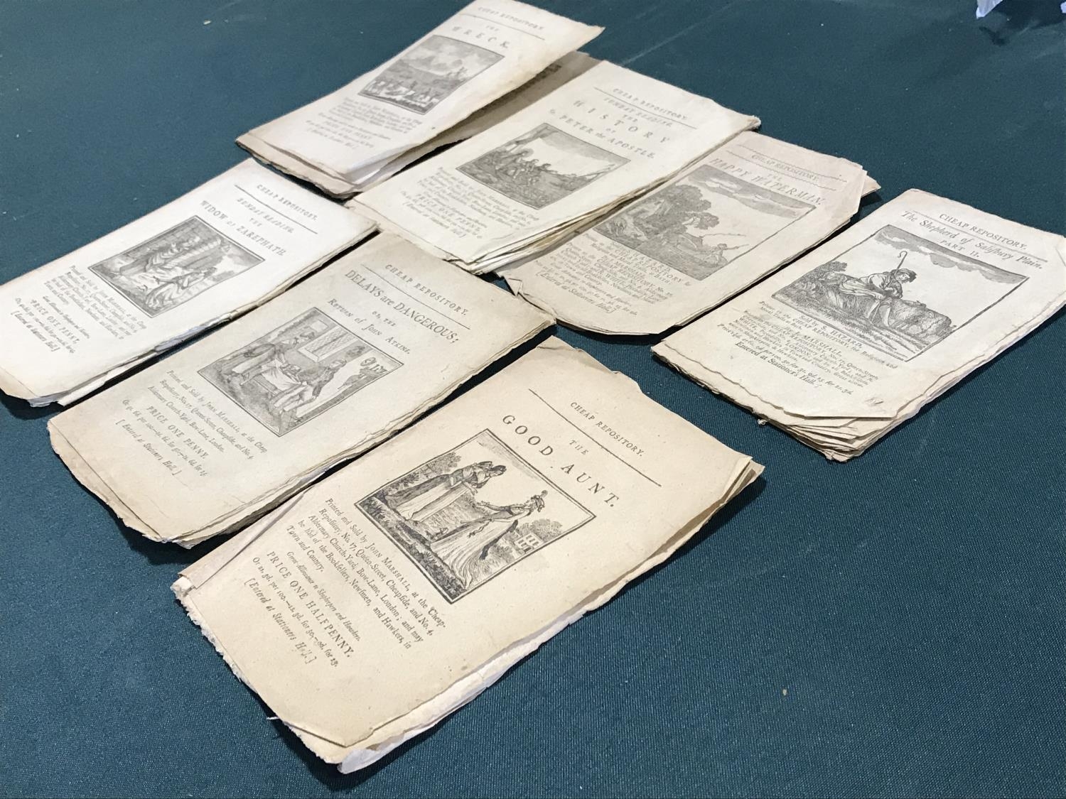 Marshall, John, publisher. A collection of seven Cheap Repository Chapbooks, including; [More, Hannah] The Happy Waterman, 12pp., [n.d.]; [More, Hannah] The Shepherd of Salisbury Plain, Pt. 2, 32pp., [n.d.]; [Anon] Sunday Reading. The Widow of Zarephath, 16pp., [c.1798]; [Anon] Delays are Dangerous; or, The Return of John Atkins, 16pp., [c.1798]; [Anon] Sunday Reading. The History of St. Peter the Apostle, 16pp., [c.1797]; [Anon] The Good Aunt, 8pp., [c.1798]; [Anon] The Wreck, 16pp., [c.1798], all with wood-engraved illustrations, slight browning, original wrappers, 8vo