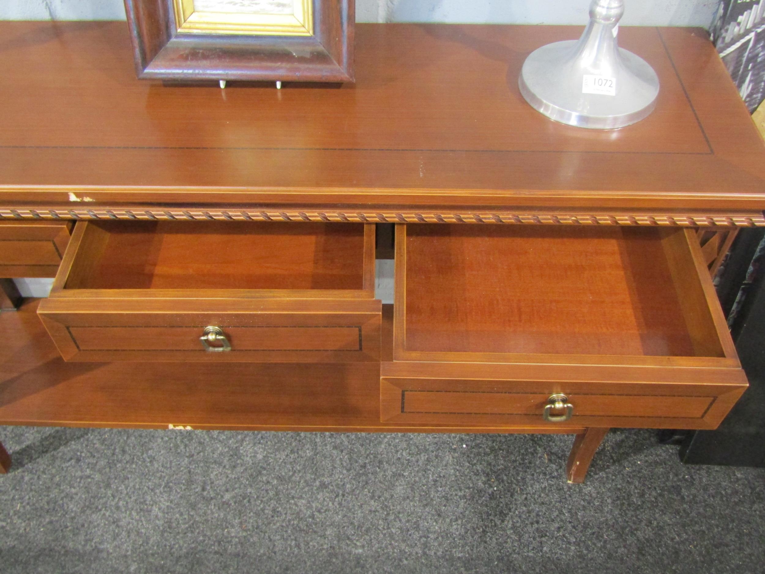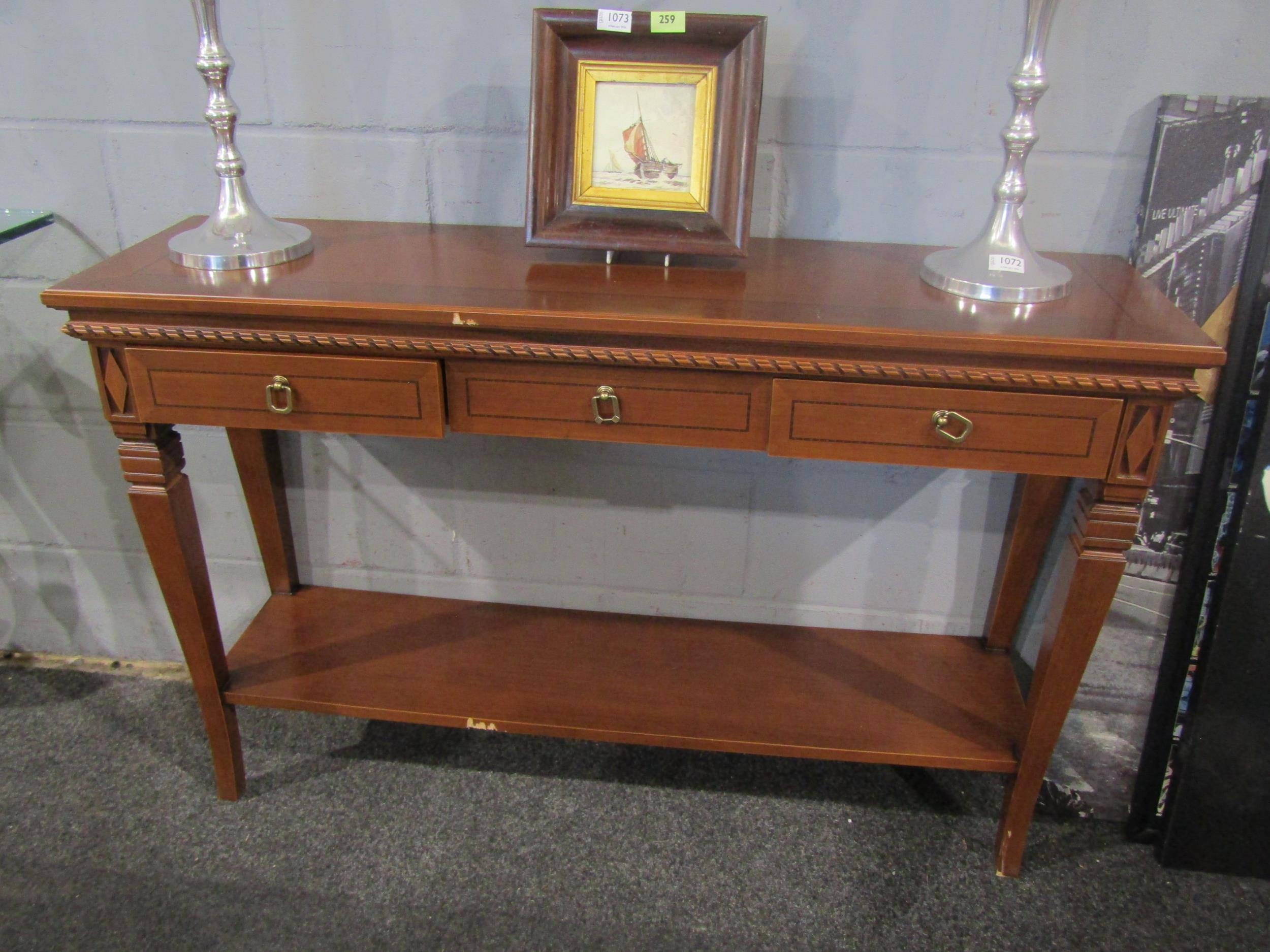 A reproduction mahogany hall table, three drawers with under-tier, some marks, 80cm tall x 125cm wide x 35cm deep