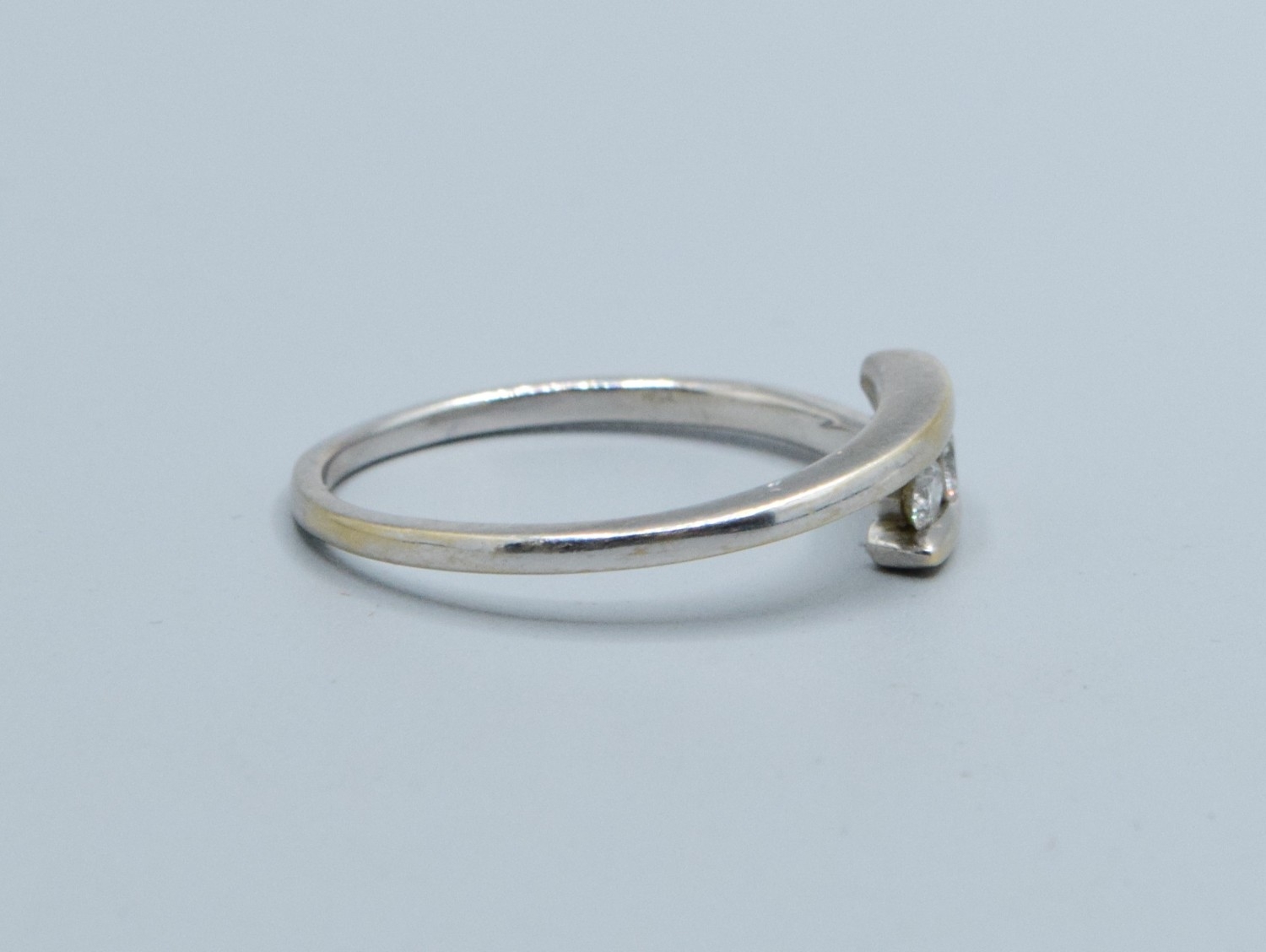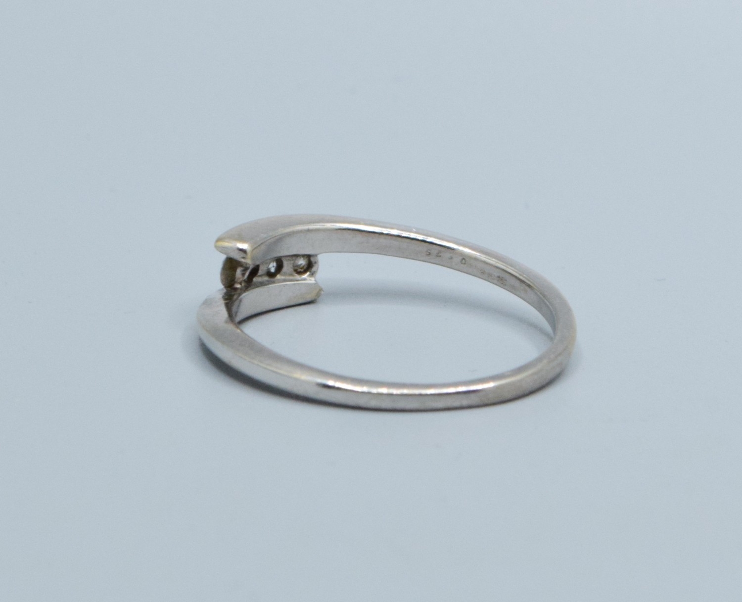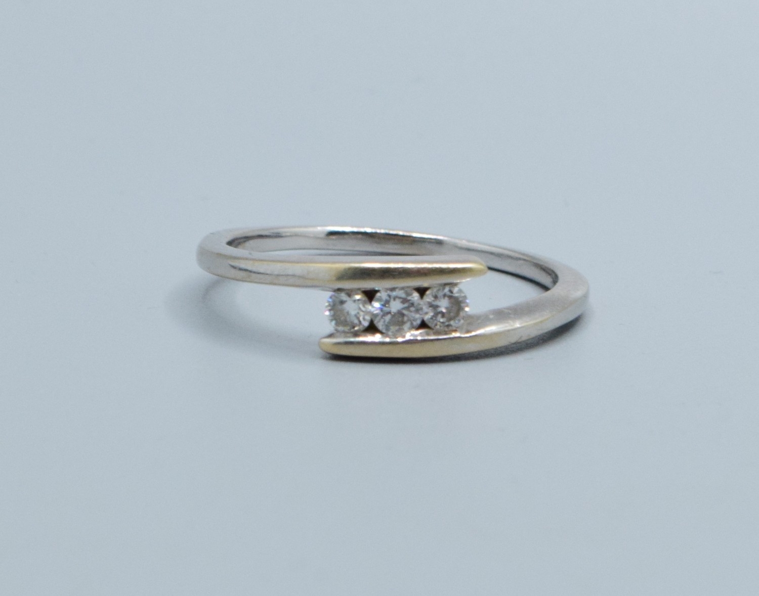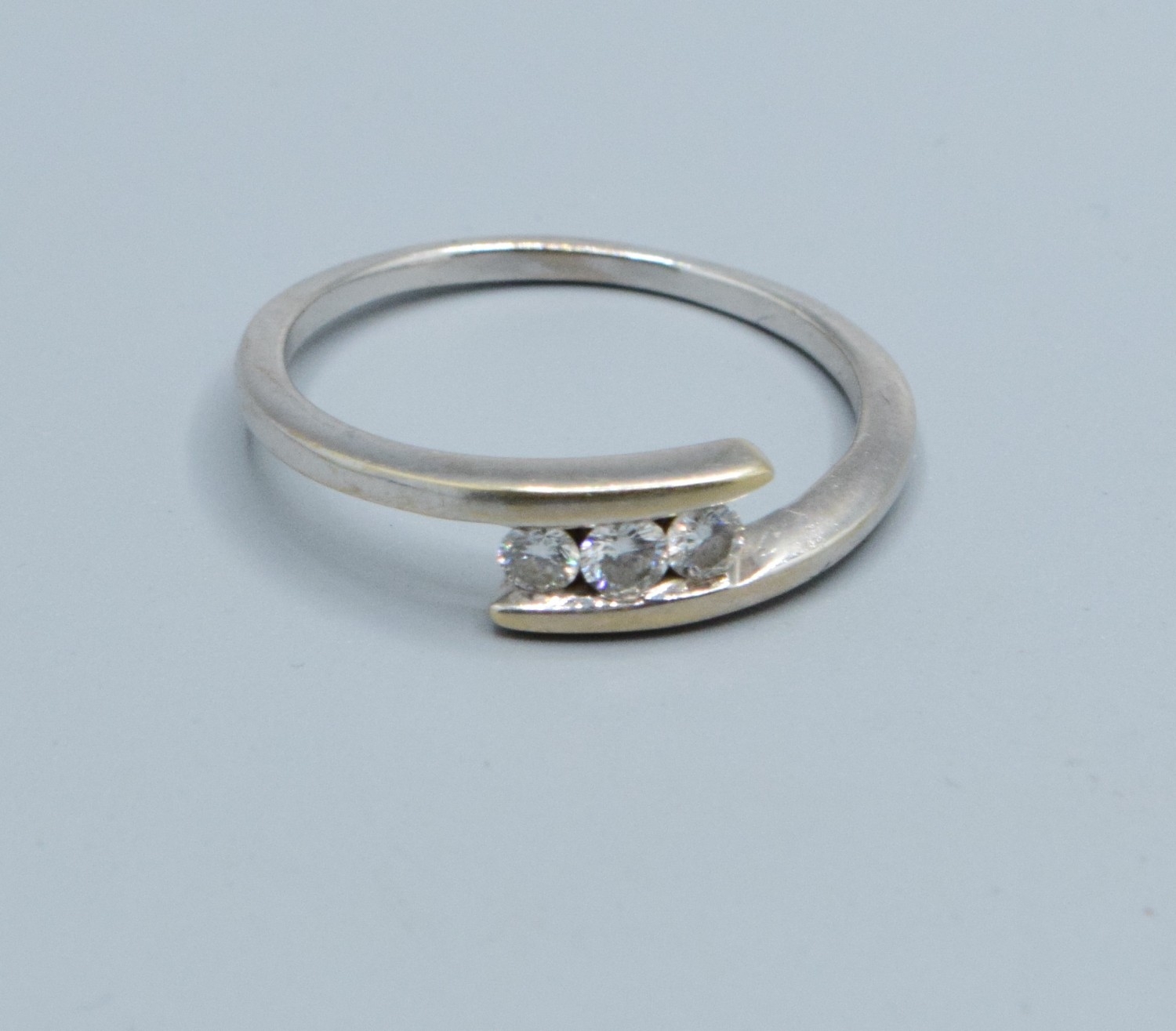 18ct gold white ladies 3 stone Diamond split twist design ring with a Diamond value of 0.25cts hallmarked in the ring size V, 3.9grams