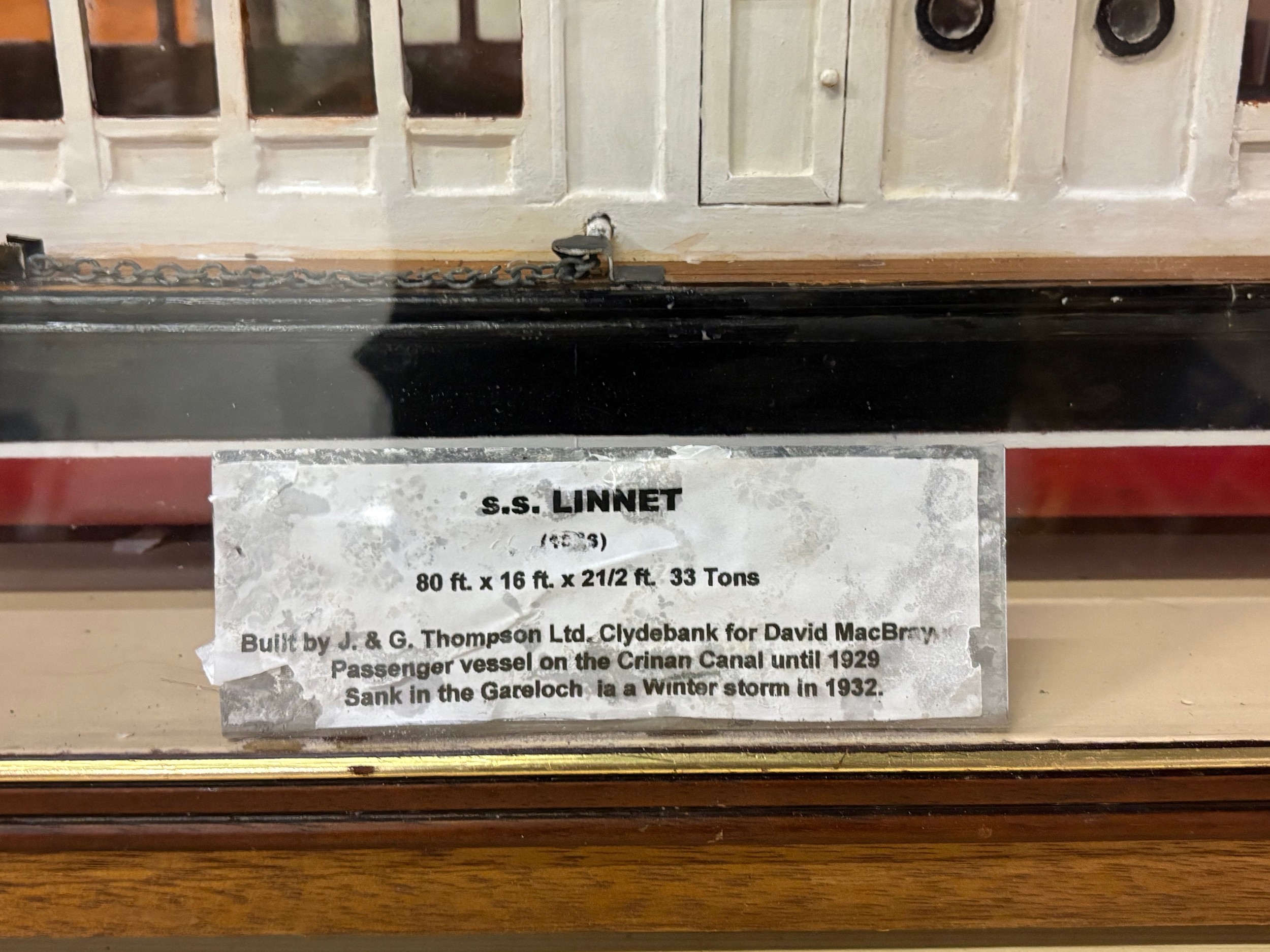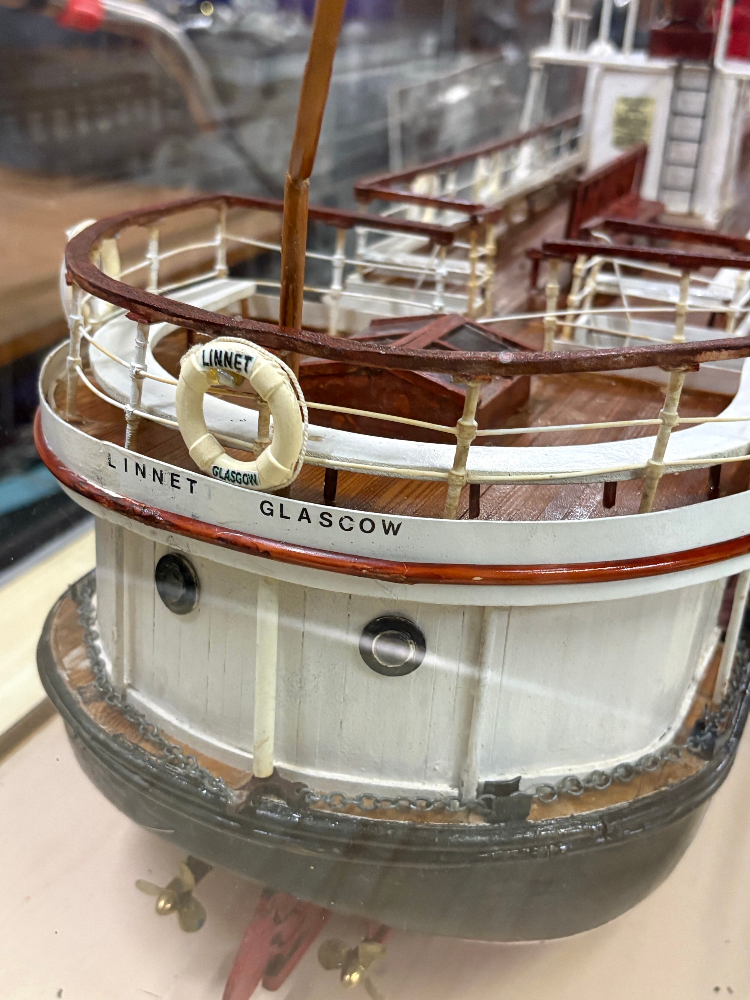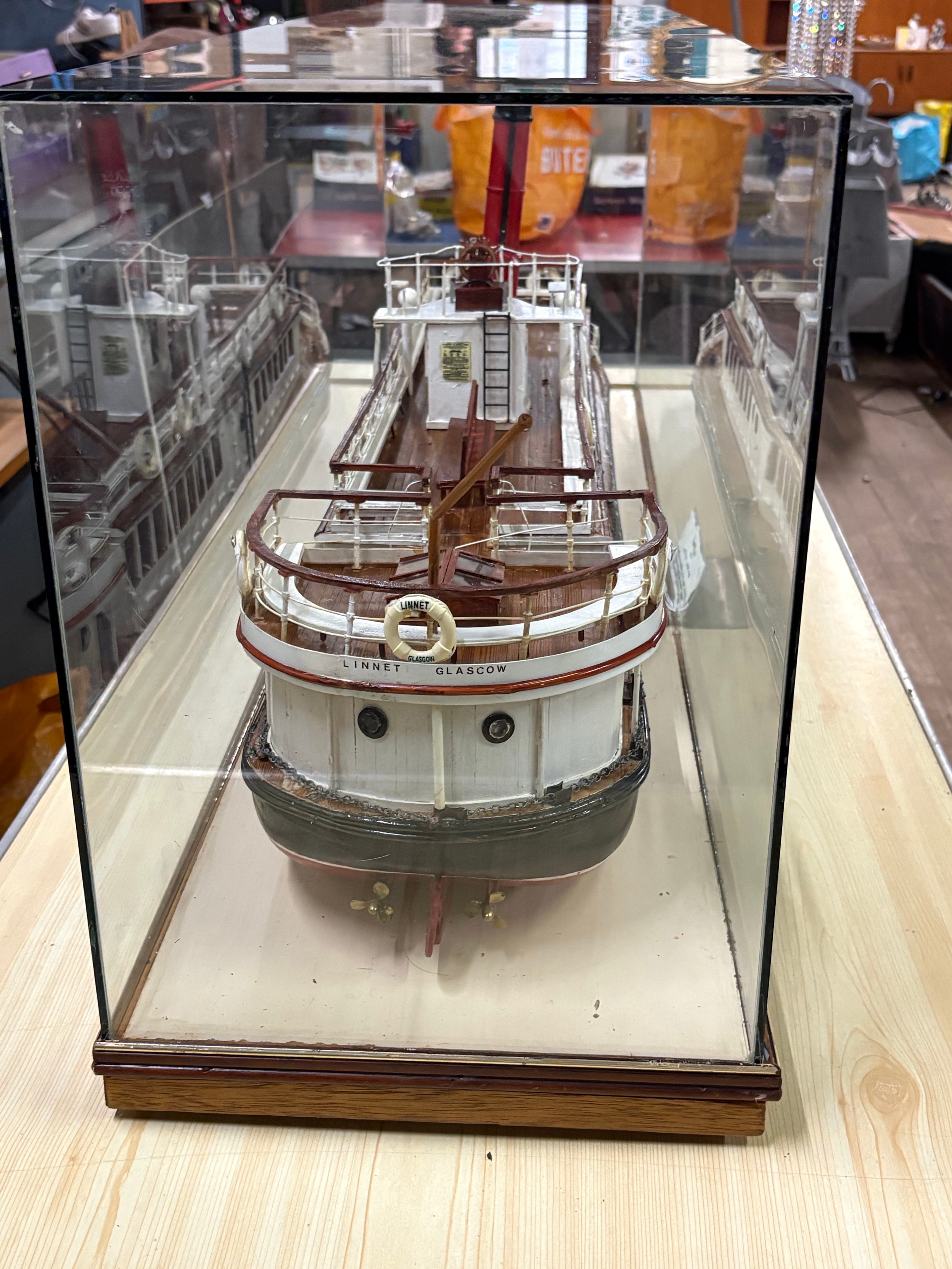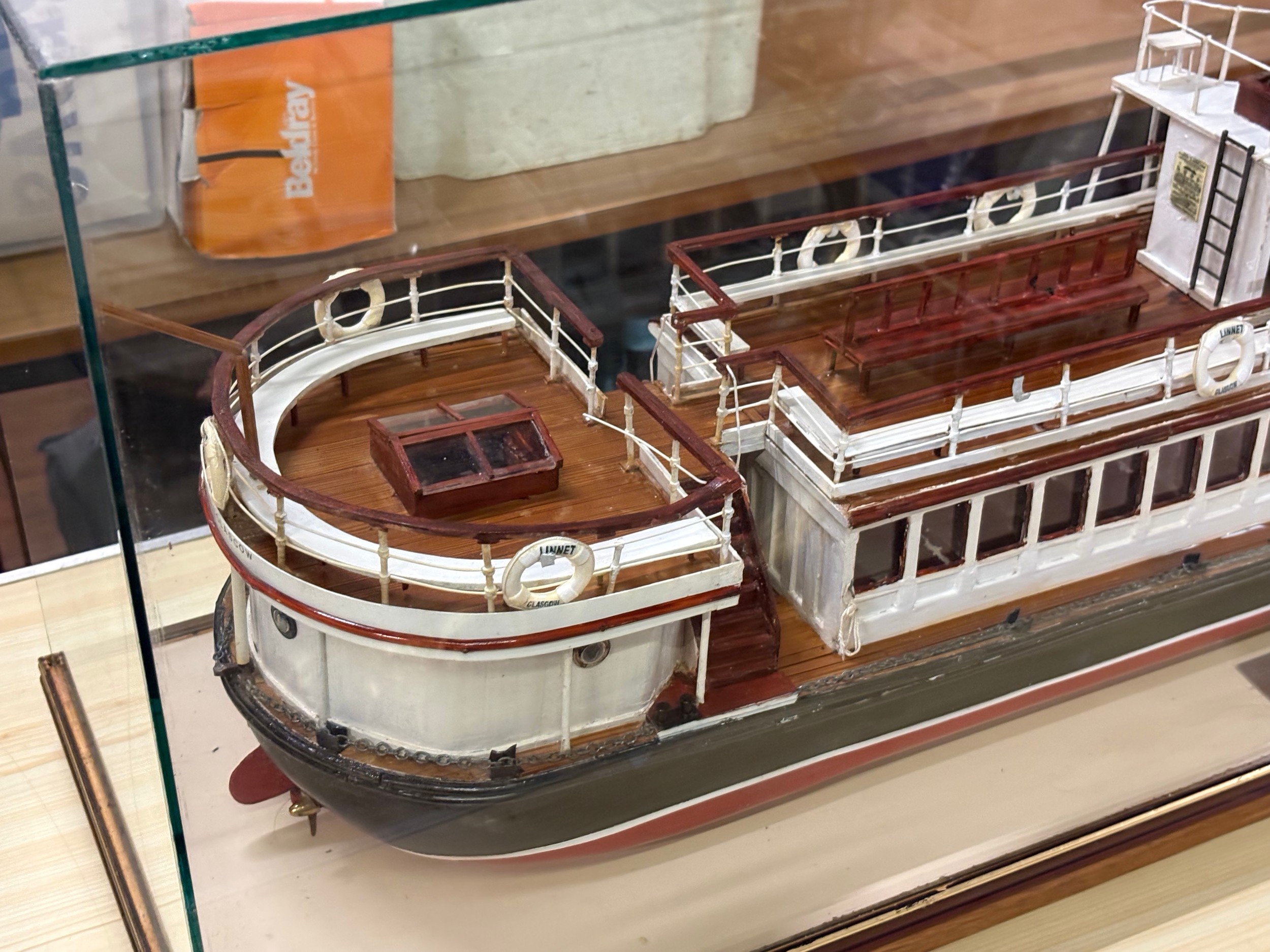 A large hand built model of the historic passenger vessel s.s linnet built for david mcbrain , sank in the gareloch 1932 housed within a large glass case 48 x 12 x 18"