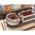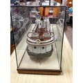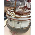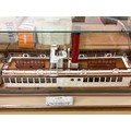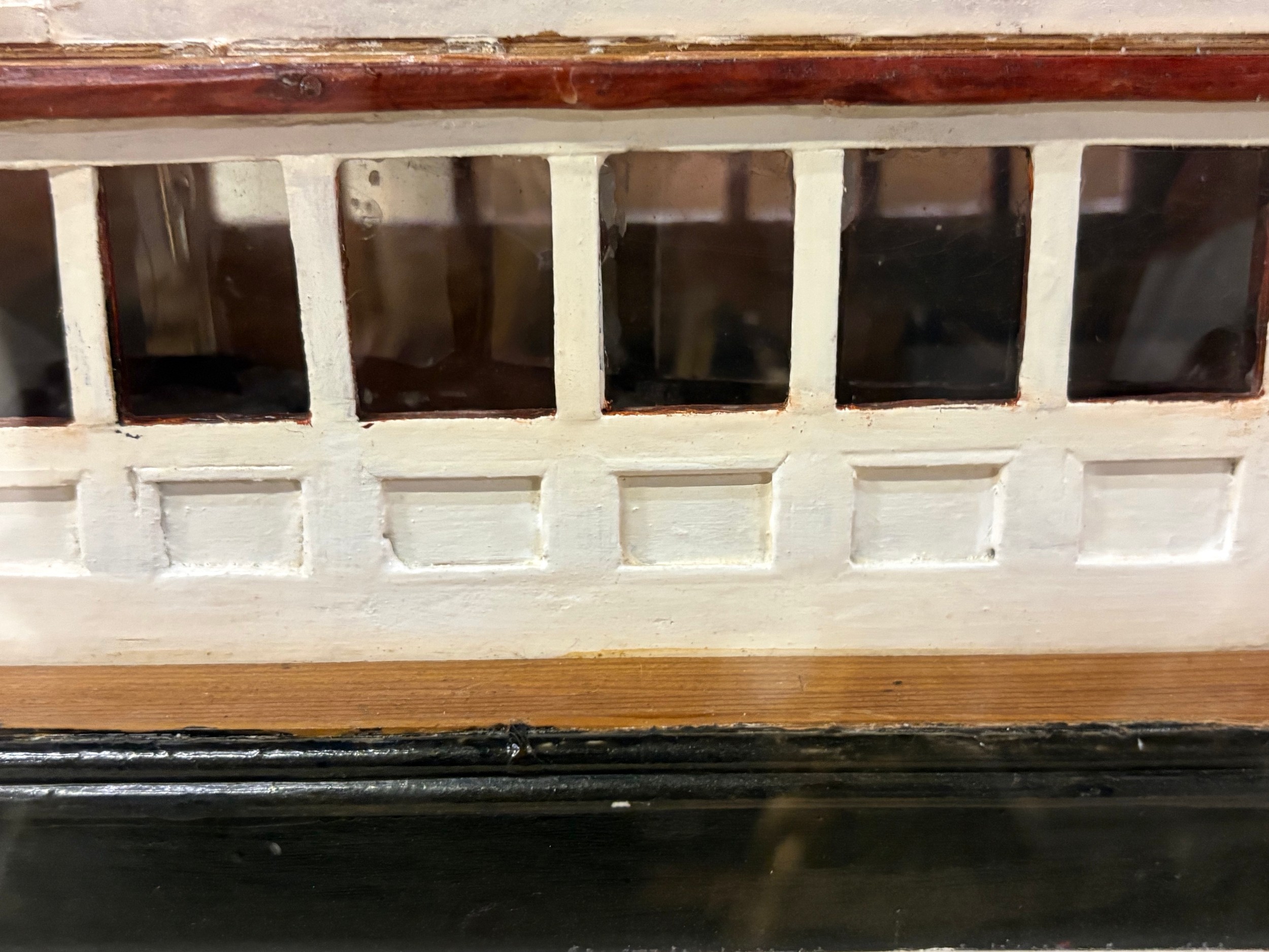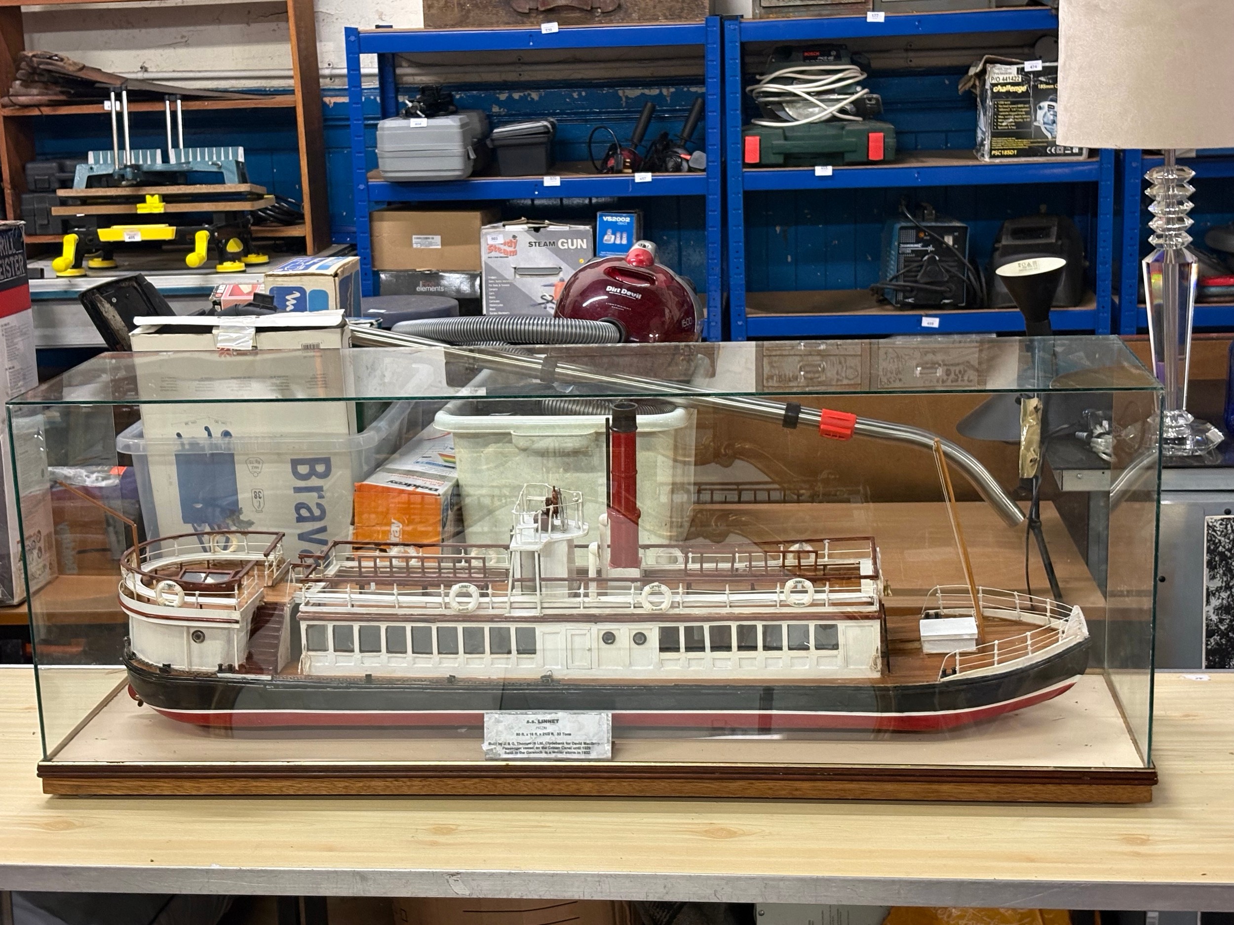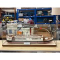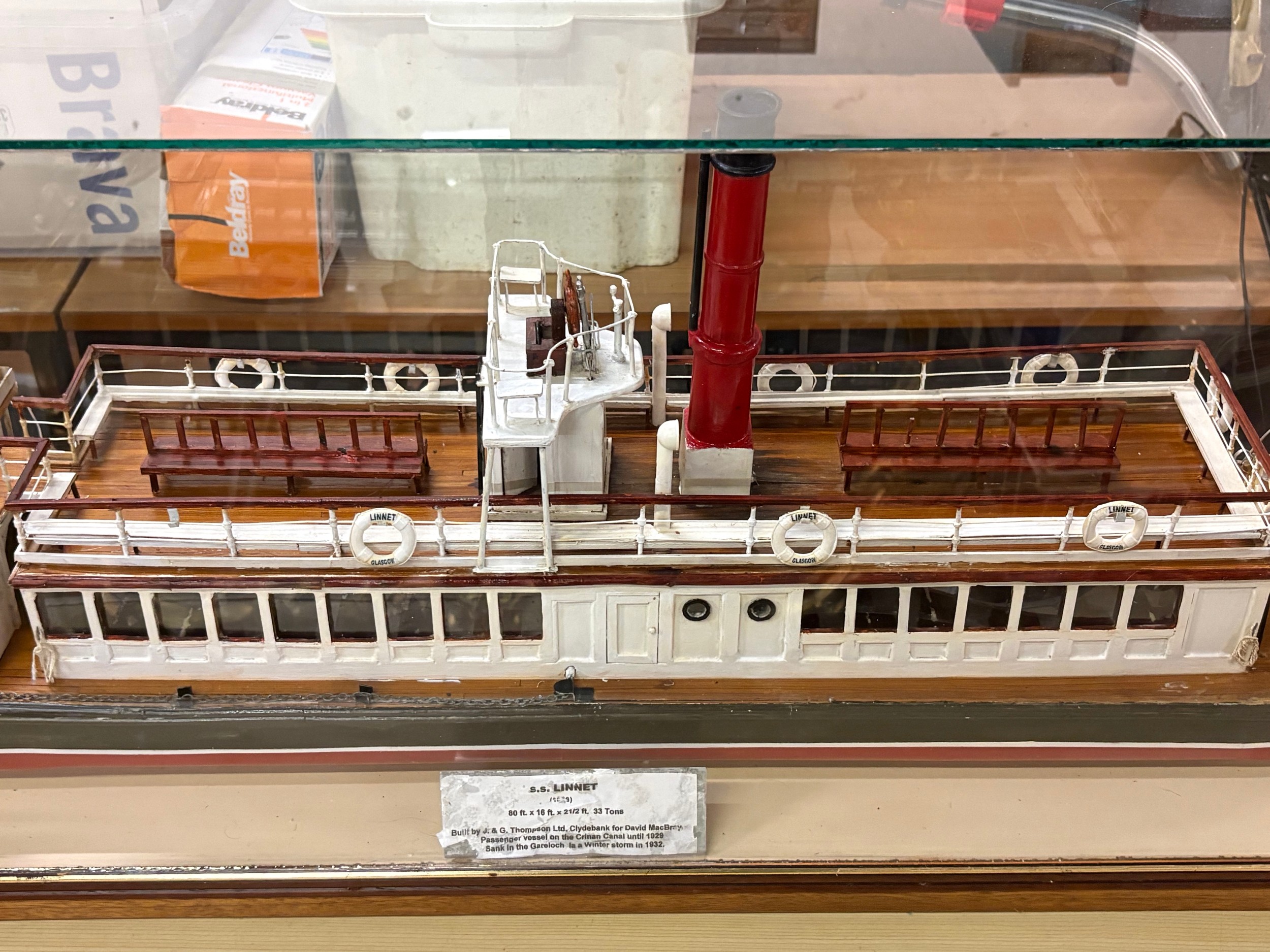A large hand built model of the historic passenger vessel s.s linnet built for david mcbrain , sank in the gareloch 1932 housed within a large glass case 48 x 12 x 18"