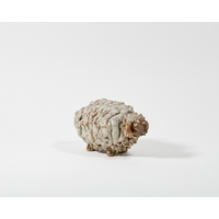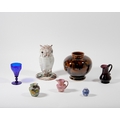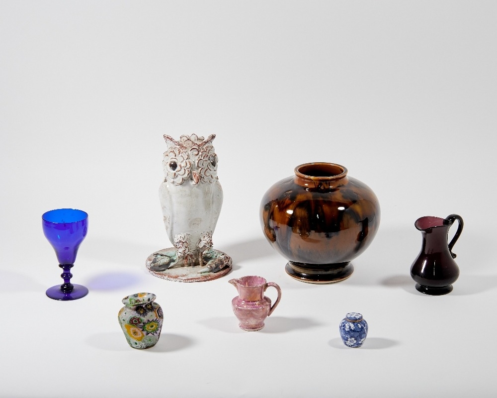 A mixed group of glass and ceramic ornaments, 19th - 20th centuries, comprising: a studio pottery glazed terracotta figure of an owl by Stanislas Reychan (1897-1994), impressed mark to underside, 22cm high, a globular brown-glazed porcelain vase with short neck and foot, impressed seal mark to underside, 17cm high, a hand-blown purple glass jug with short foot, 11.5cm high, a blue glass goblet with drawn ogee bowl and knopped stem, 12.5cm high, a Sunderland pink lusterware miniature jug, 7.5cm high, a modern Roman style mosaic glass vase, 7cm high, and a miniature Crown Staffordshire ginger jar and cover with blue and white transfer-print decoration of prunus flowers, 4.5cm high (7)