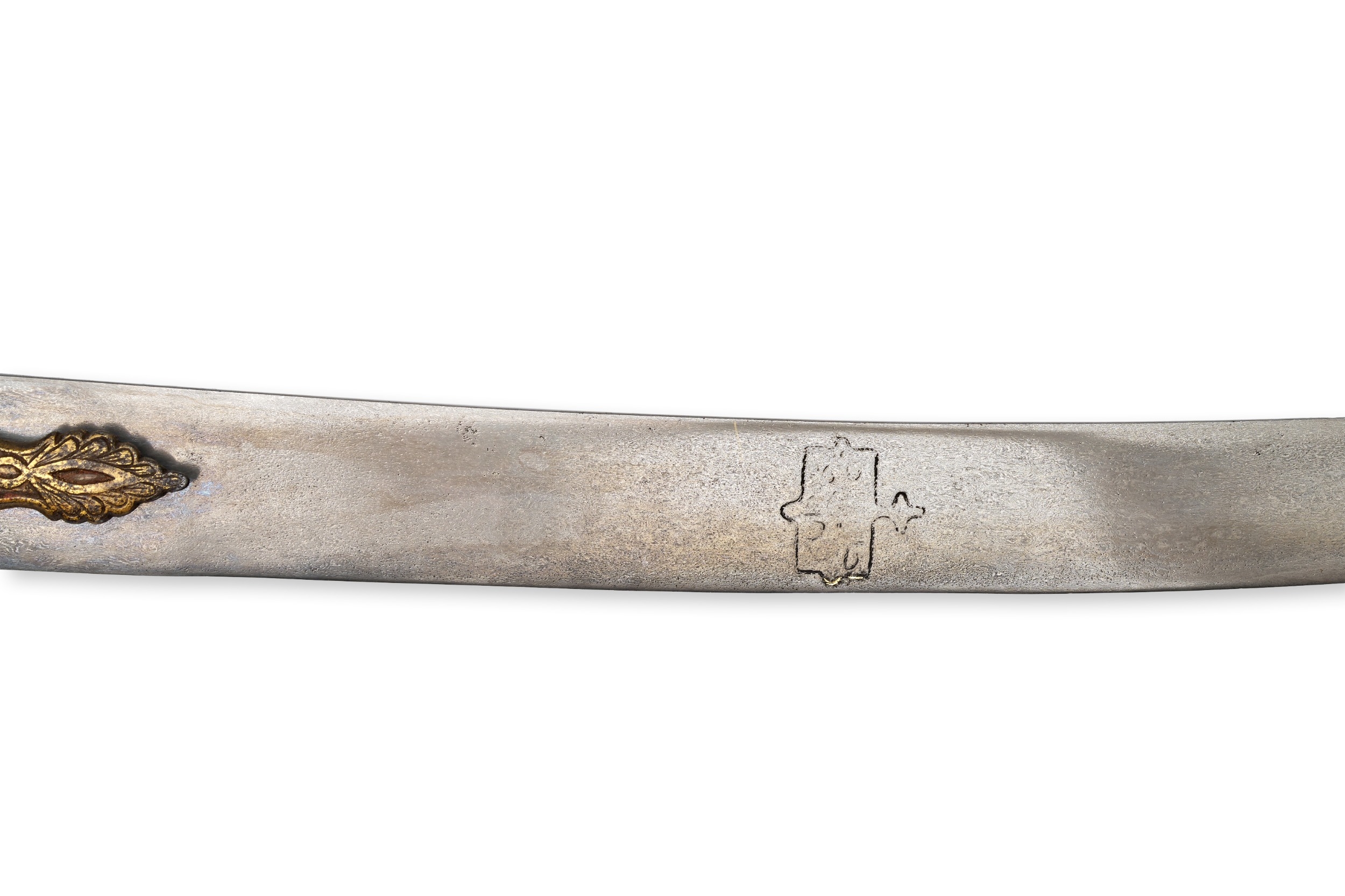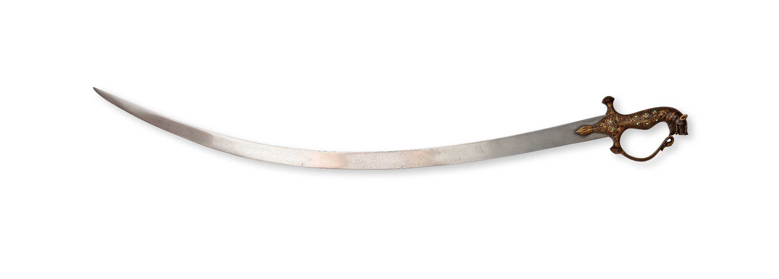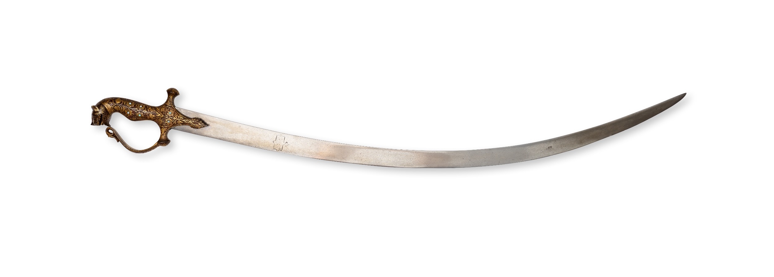 Features a deeply curved, single-edged blade of patterned wootz steel. The blade tapers to a fine point and lacks a fuller. An incised cartouche is located on the blade face, by a scalloped rectangular border and a fleur-de-lis flourish to the right. The interior of the cartouche contains faint, illegible characters. The hilt is constructed of cast metal with a yellow-gold gilded finish. The pommel is sculpted into the form of a snarling feline head, likely a tiger. The grip and langets are decorated with chased floral and foliate trellis patterns, featuring several inset turquoise-colored cabochons. A slender D-guard connects the cross-guard to a point just below the pommel, ending in a recurved scroll.