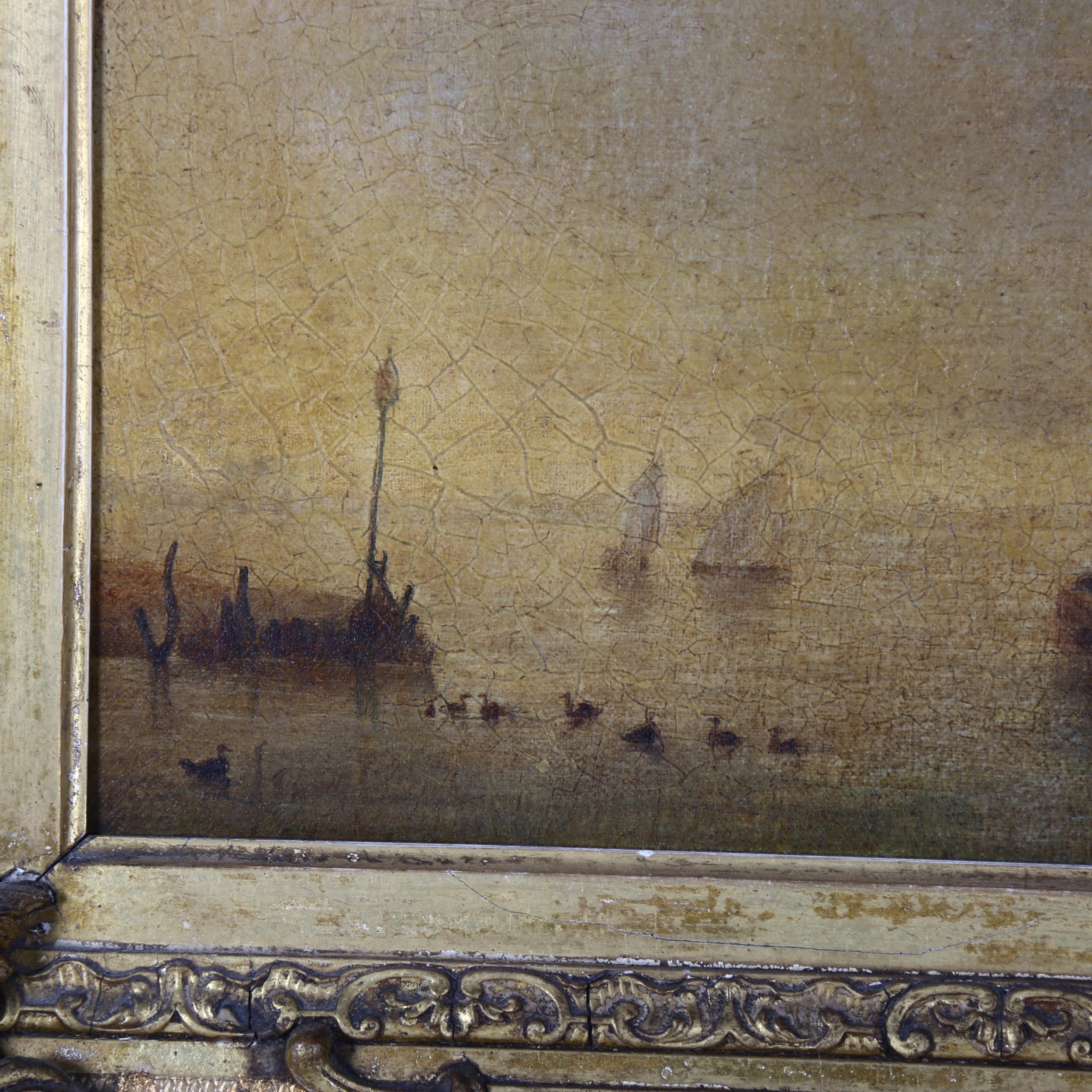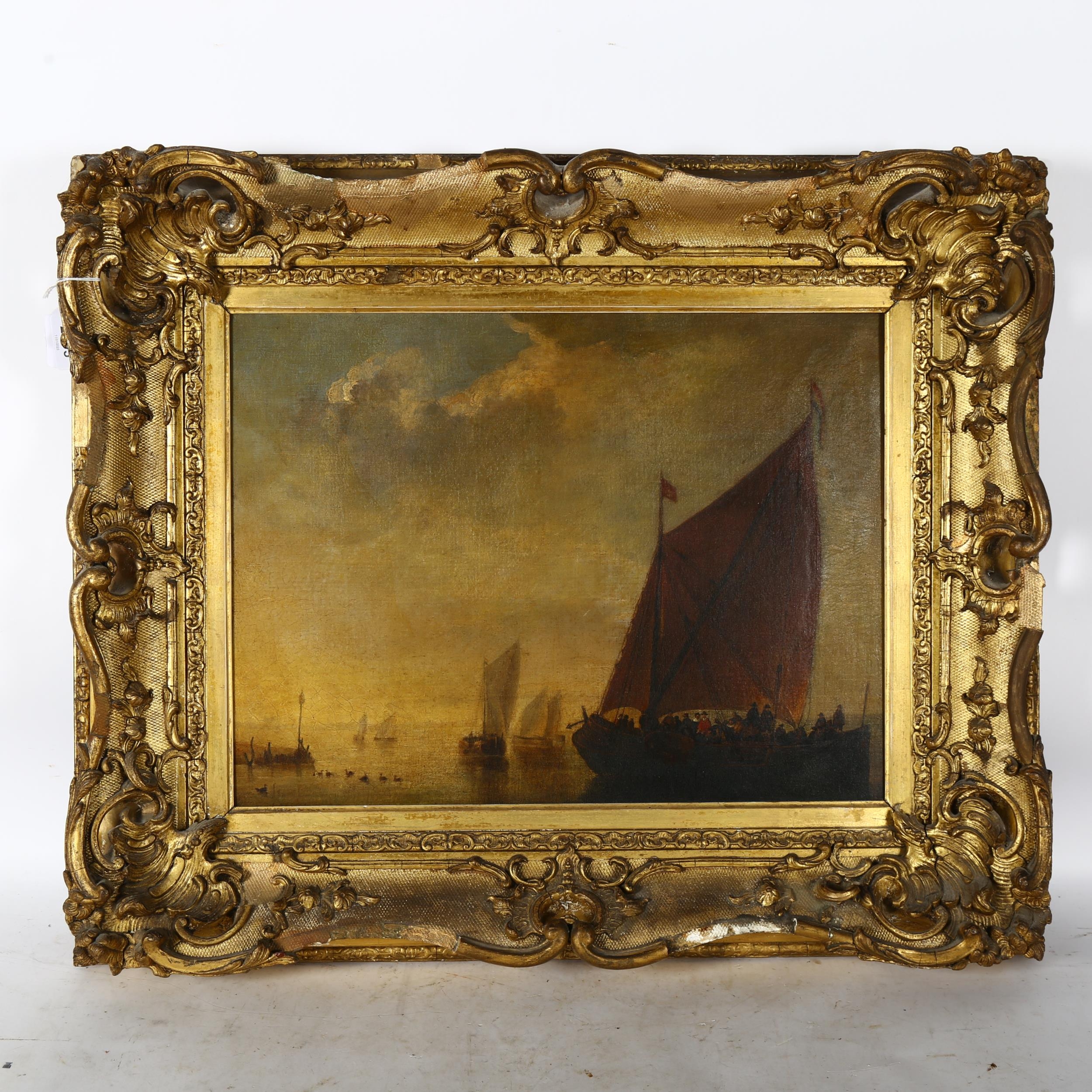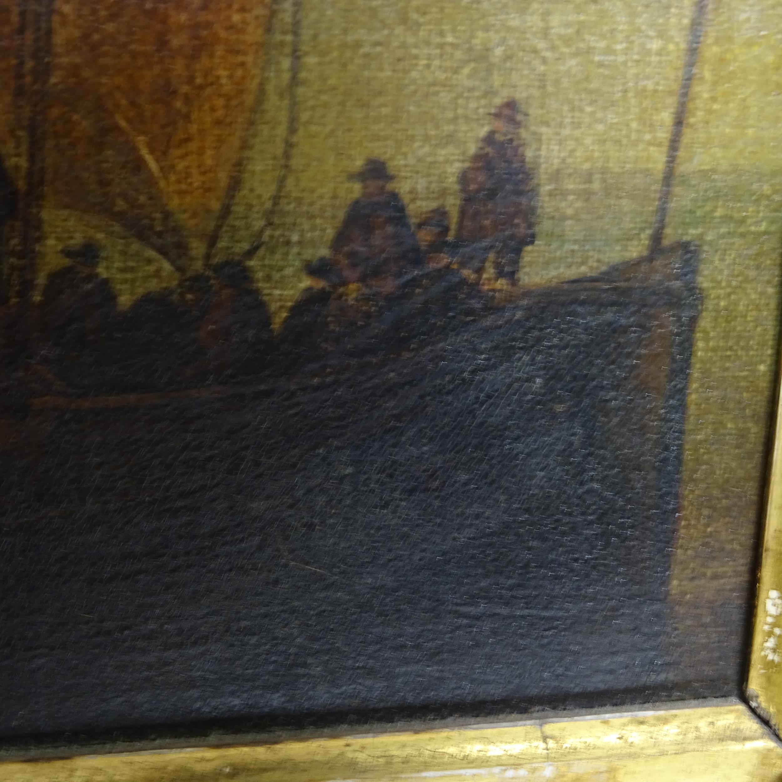 A Victorian oil on canvas, figures on a ship at harbour, image size 35cm x 46cm, 57cm x 69cm overall, in ornate giltwood and gesso frame, unsigned