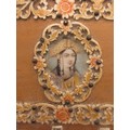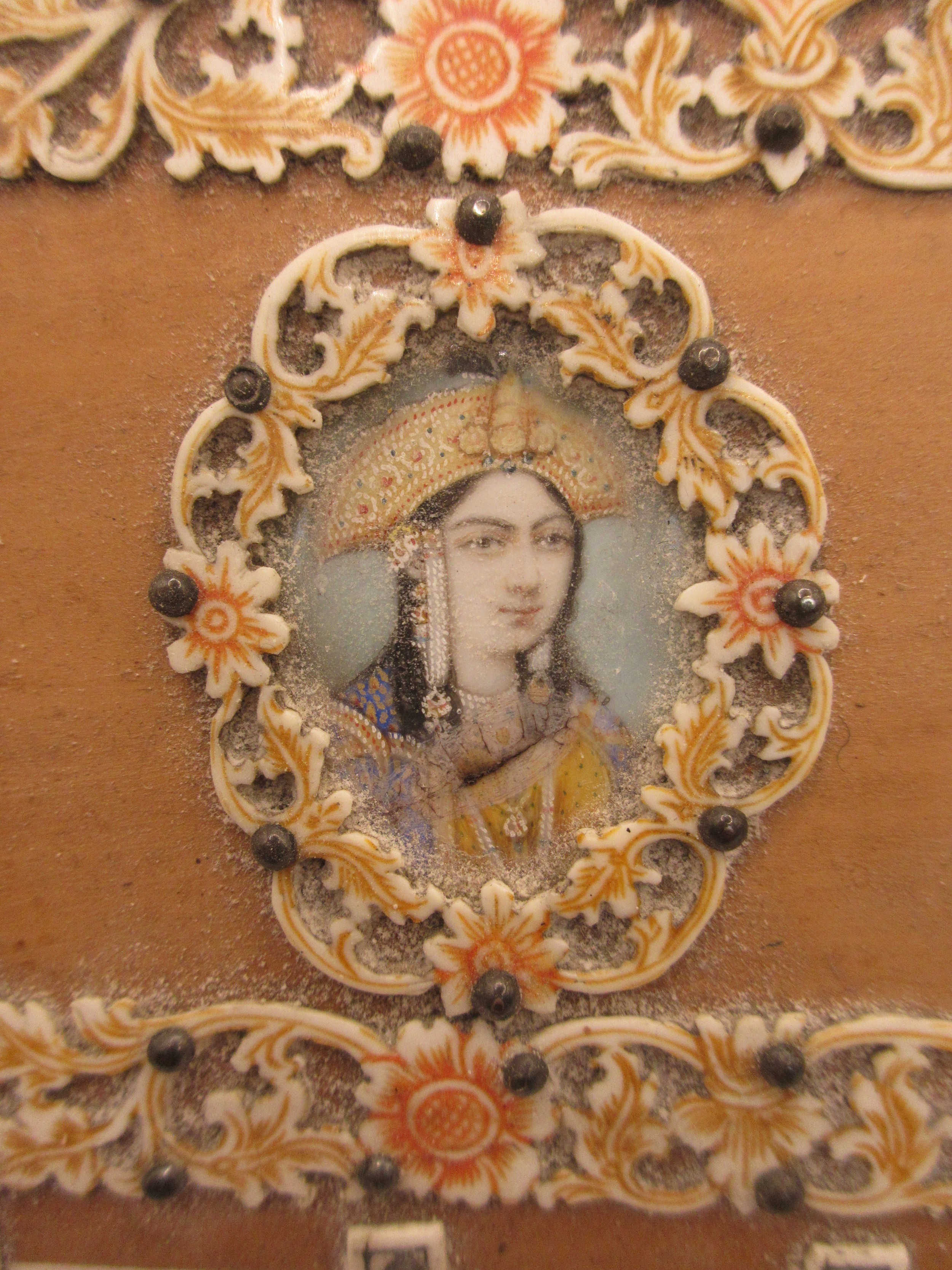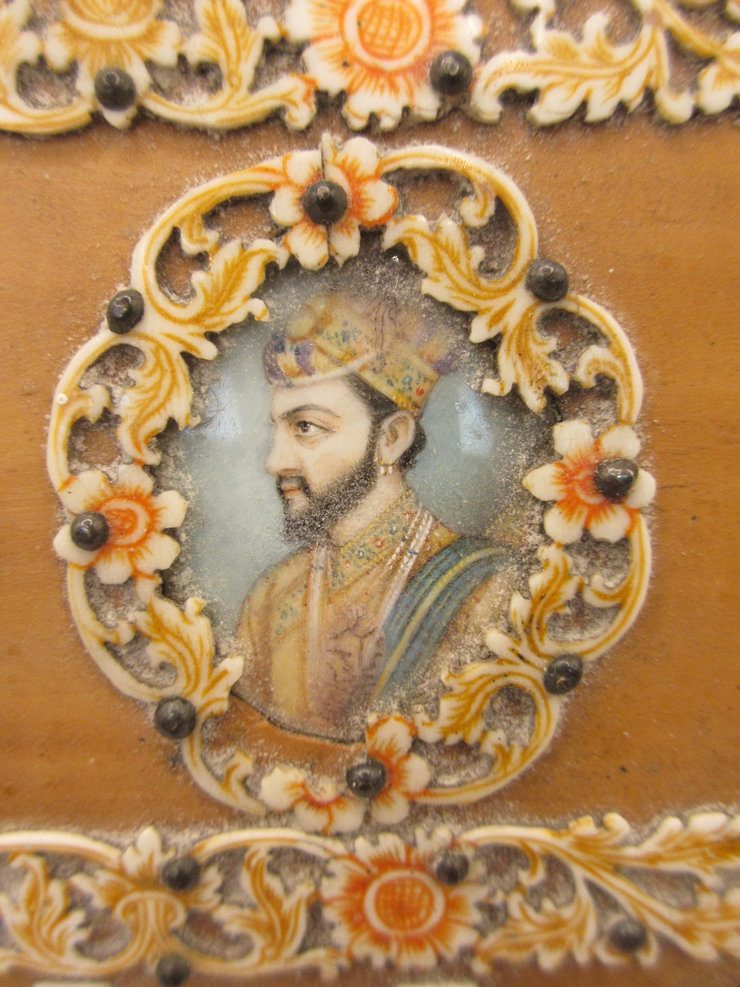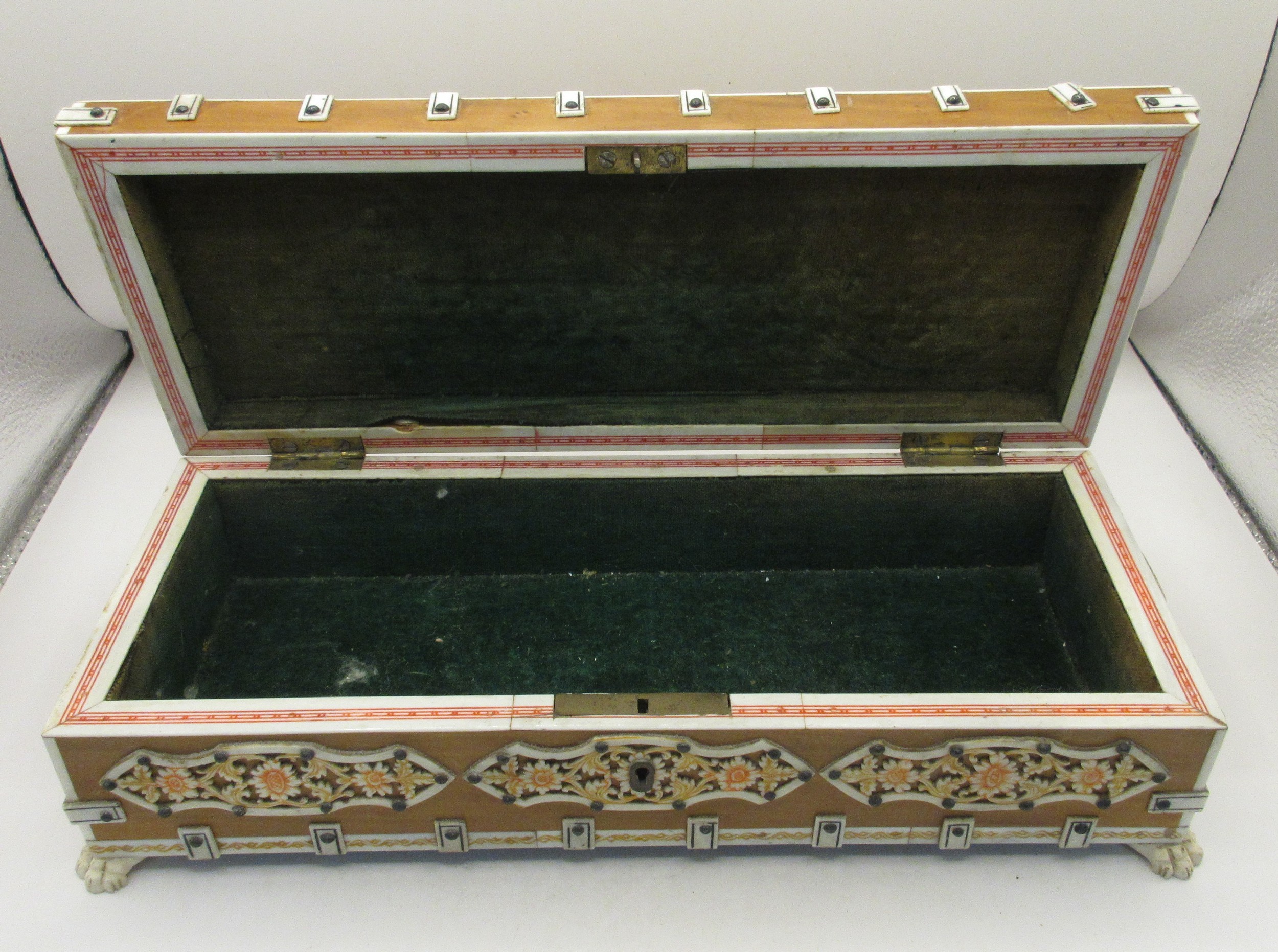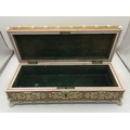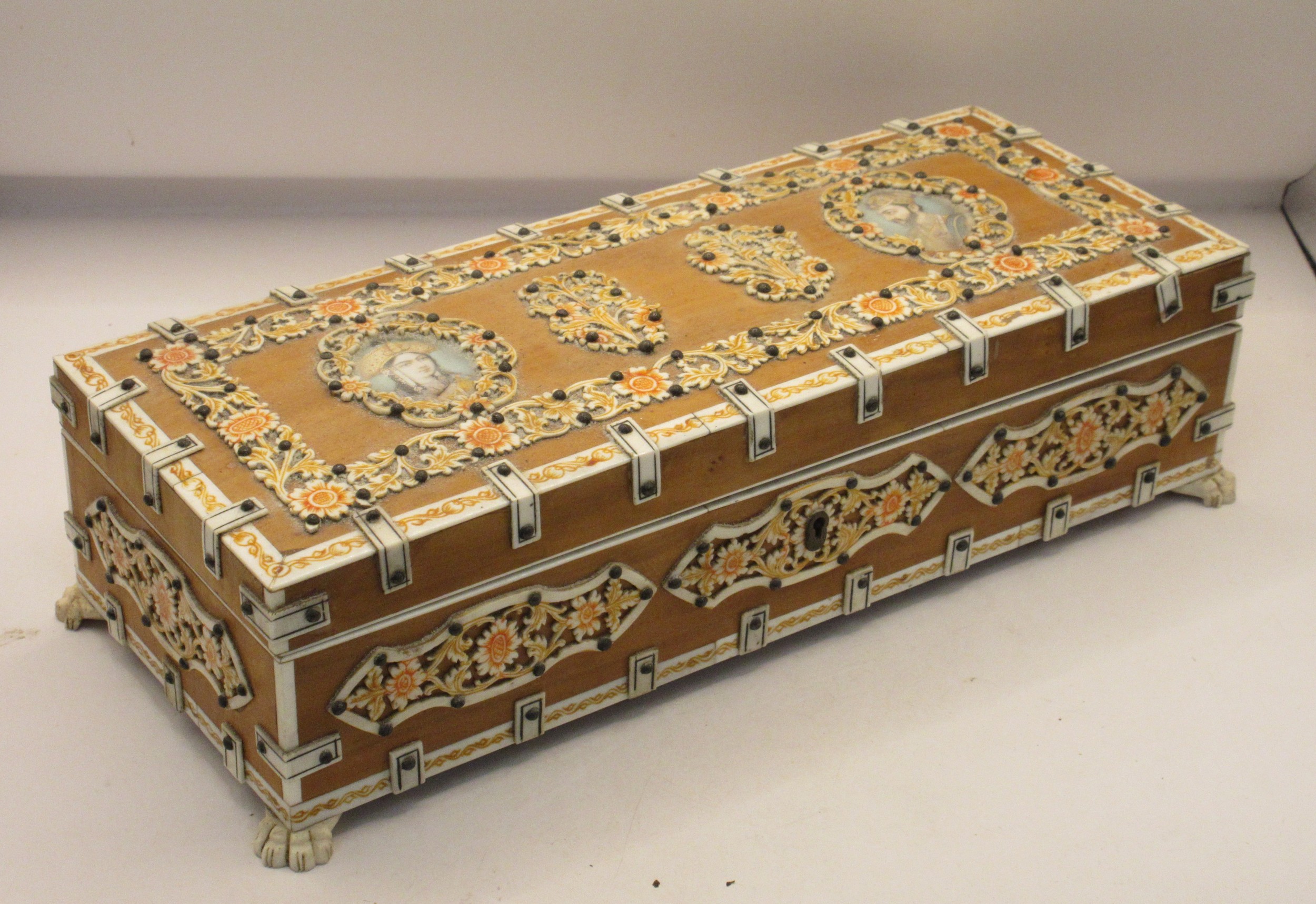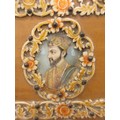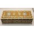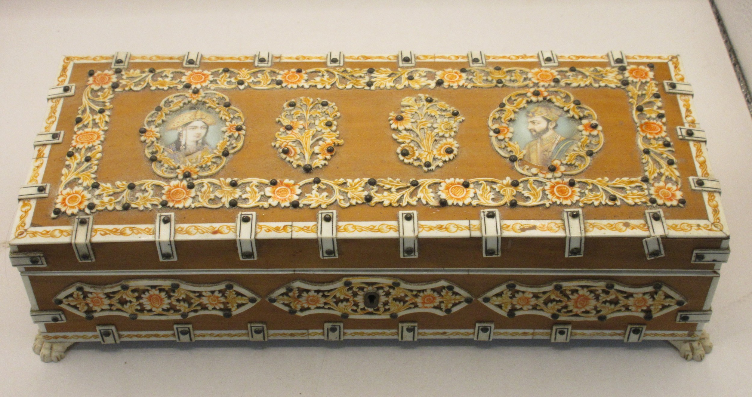 A decorative middle eastern style box, the hinged lid set with two portraits with hand painting, green fabric lining. Overall about 7cm x 26cm x 10cm