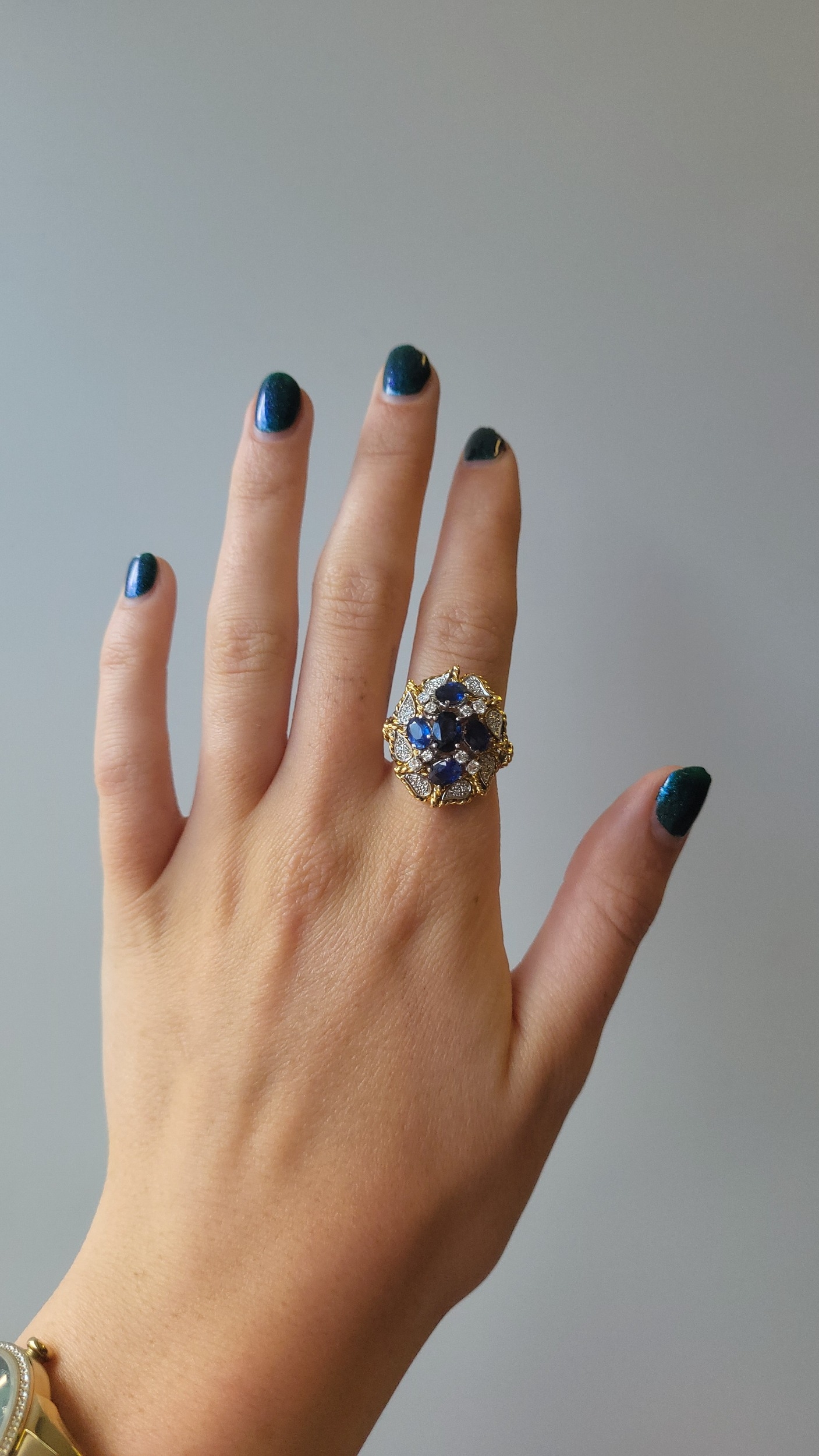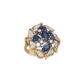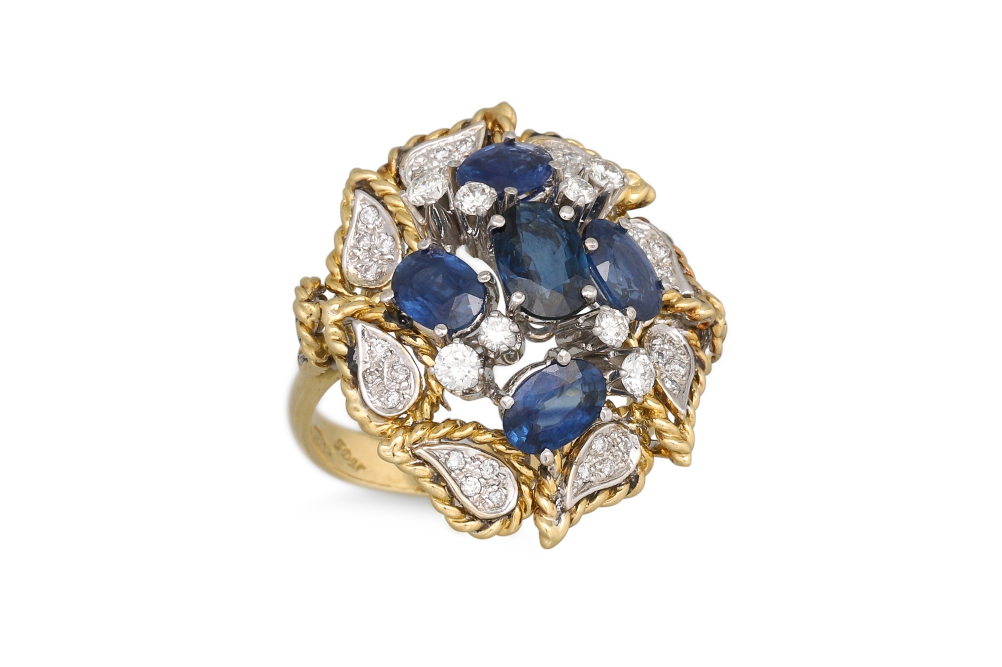A VINTAGE SAPPHIRE AND DIAMOND CLUSTER RING, the central sapphire cluster to a pavé diamond set surround, with rope edge detail. Estimated: weight of sapphire: 2.82 ct, size M-N, French assay marks for 18ct gold