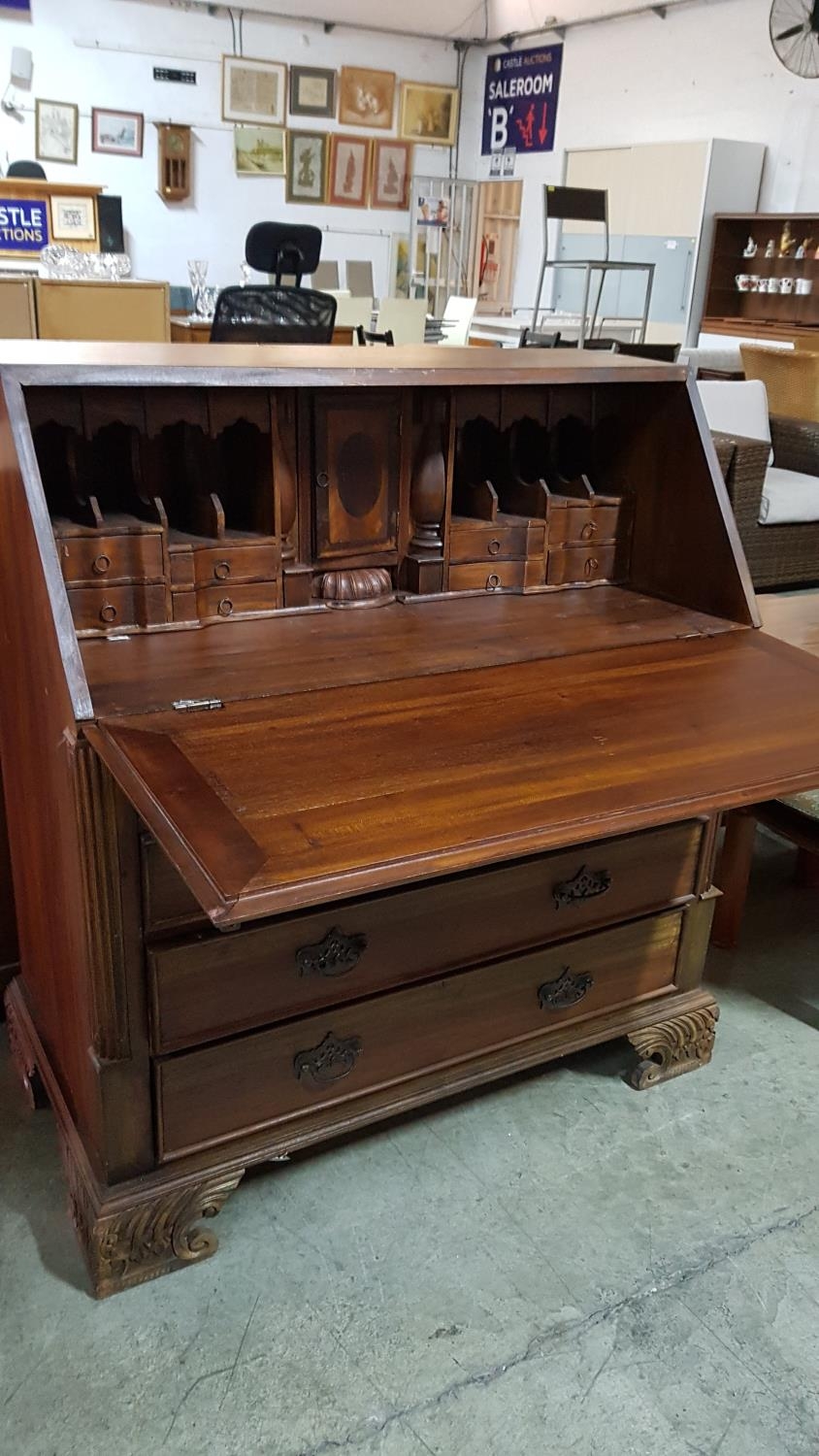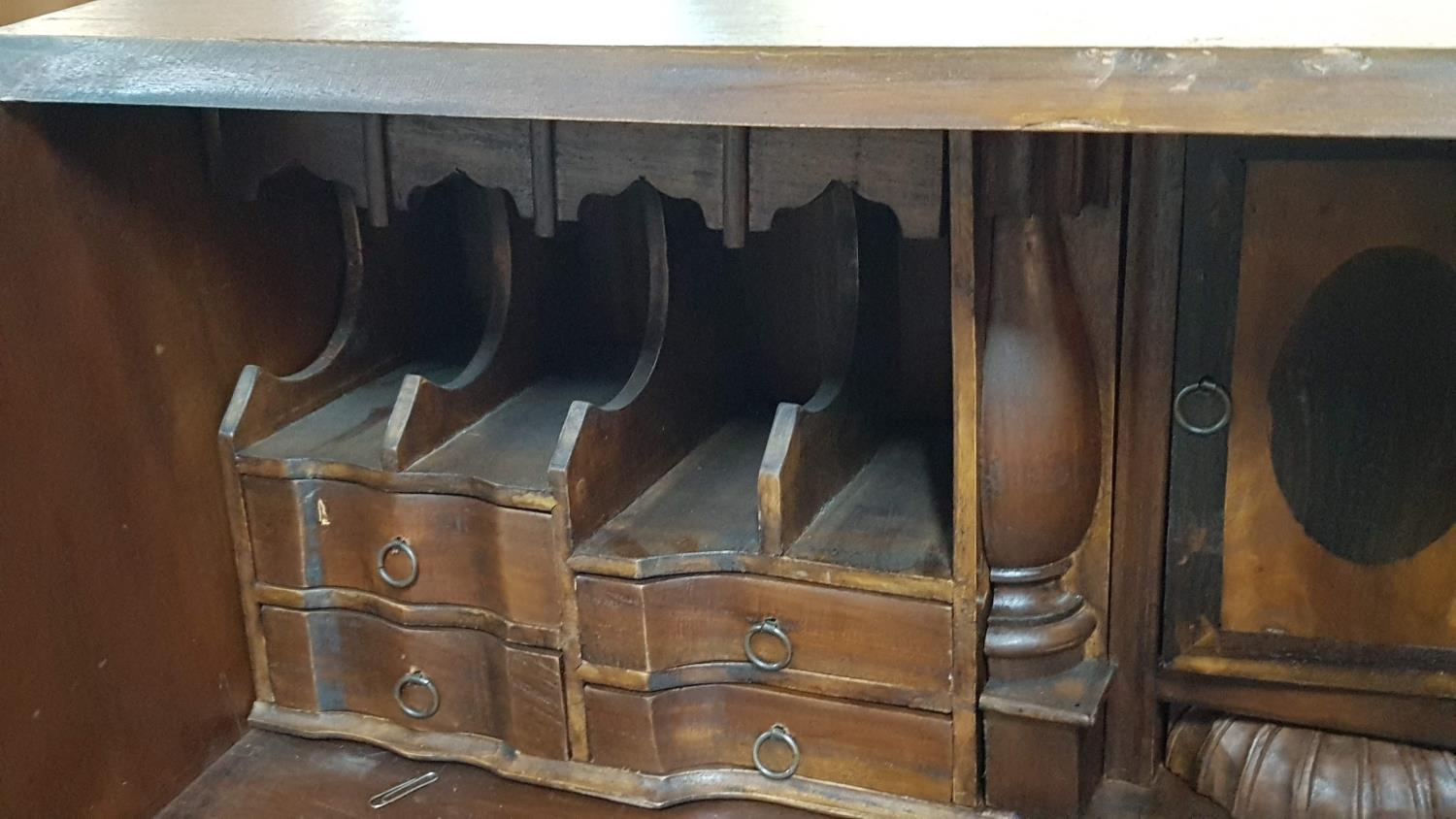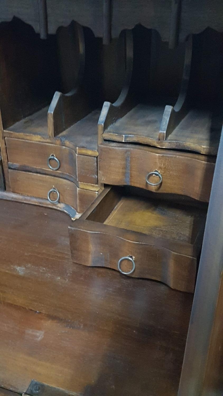 Vintage Wooden Bureau (Perhaps Edwardian Style Writing Bureau) with 5 - Fitted interiors Featuring Cubbies, Letter Racks, Drawers and a Central Cabinet with Secret Compartment (95 x 107 x 49cm)