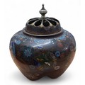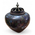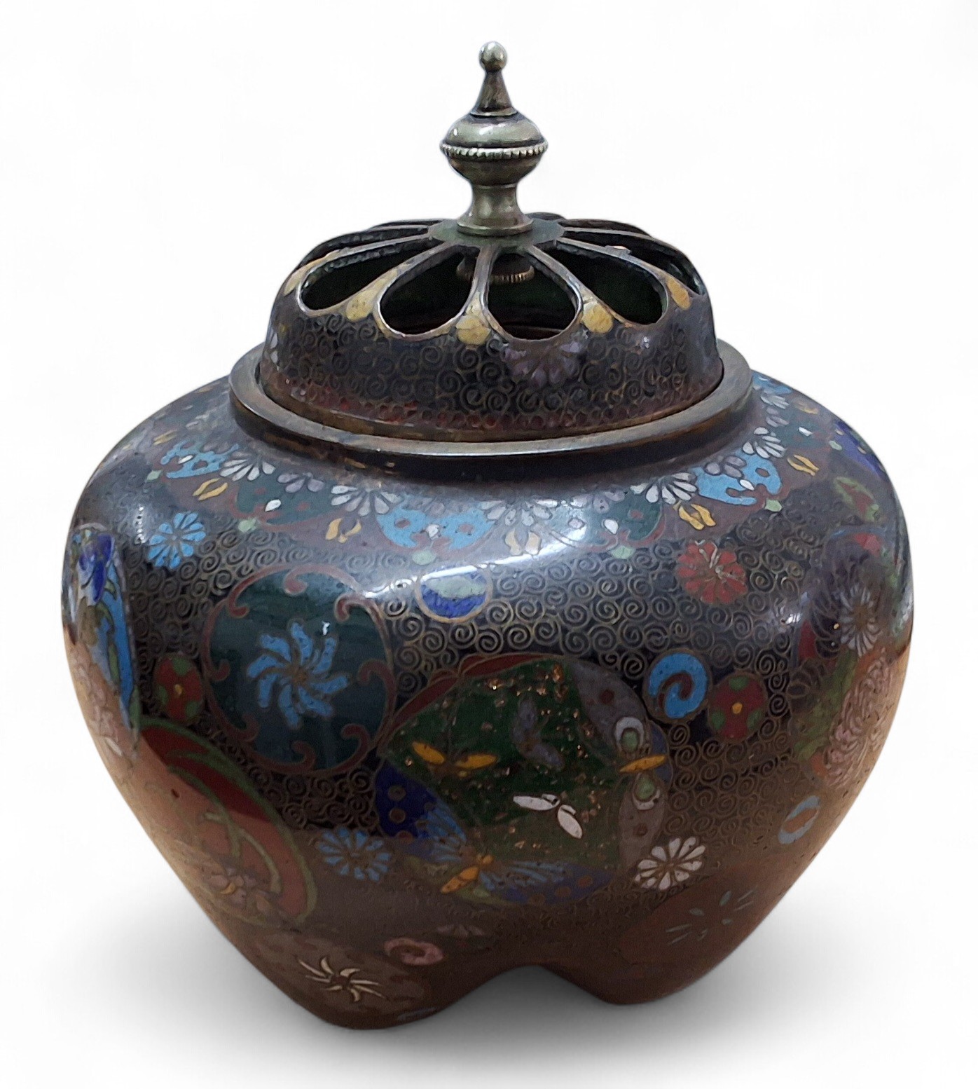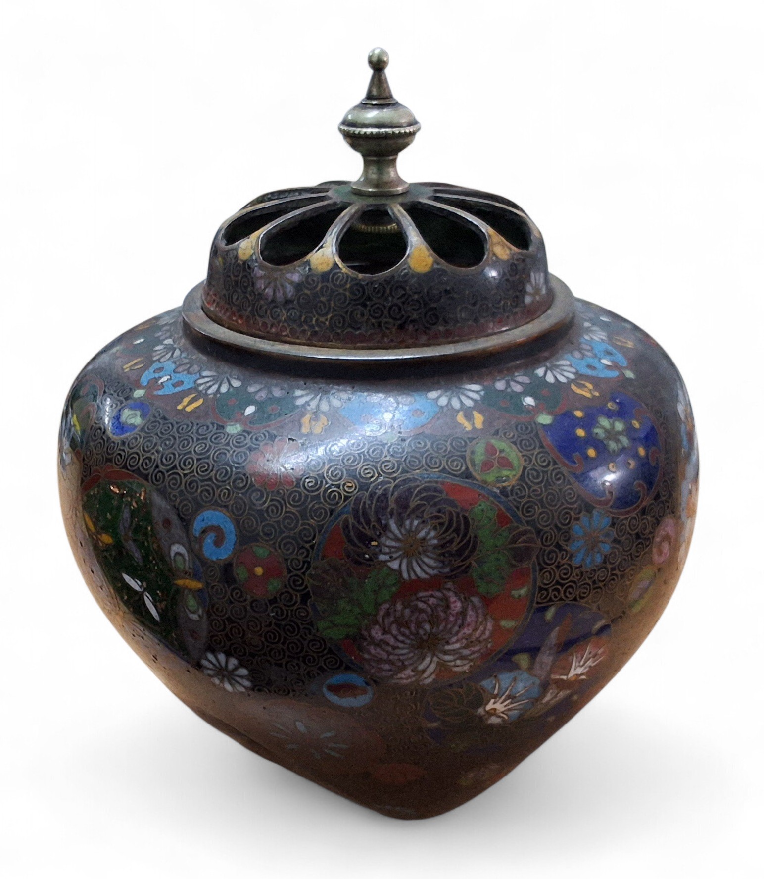 A Japanese ovoid cloisonne pot pourri vase, pierced cover, inlaid in colours and gilt with mons, flowers and scrolls, 14cm high, Meiji period