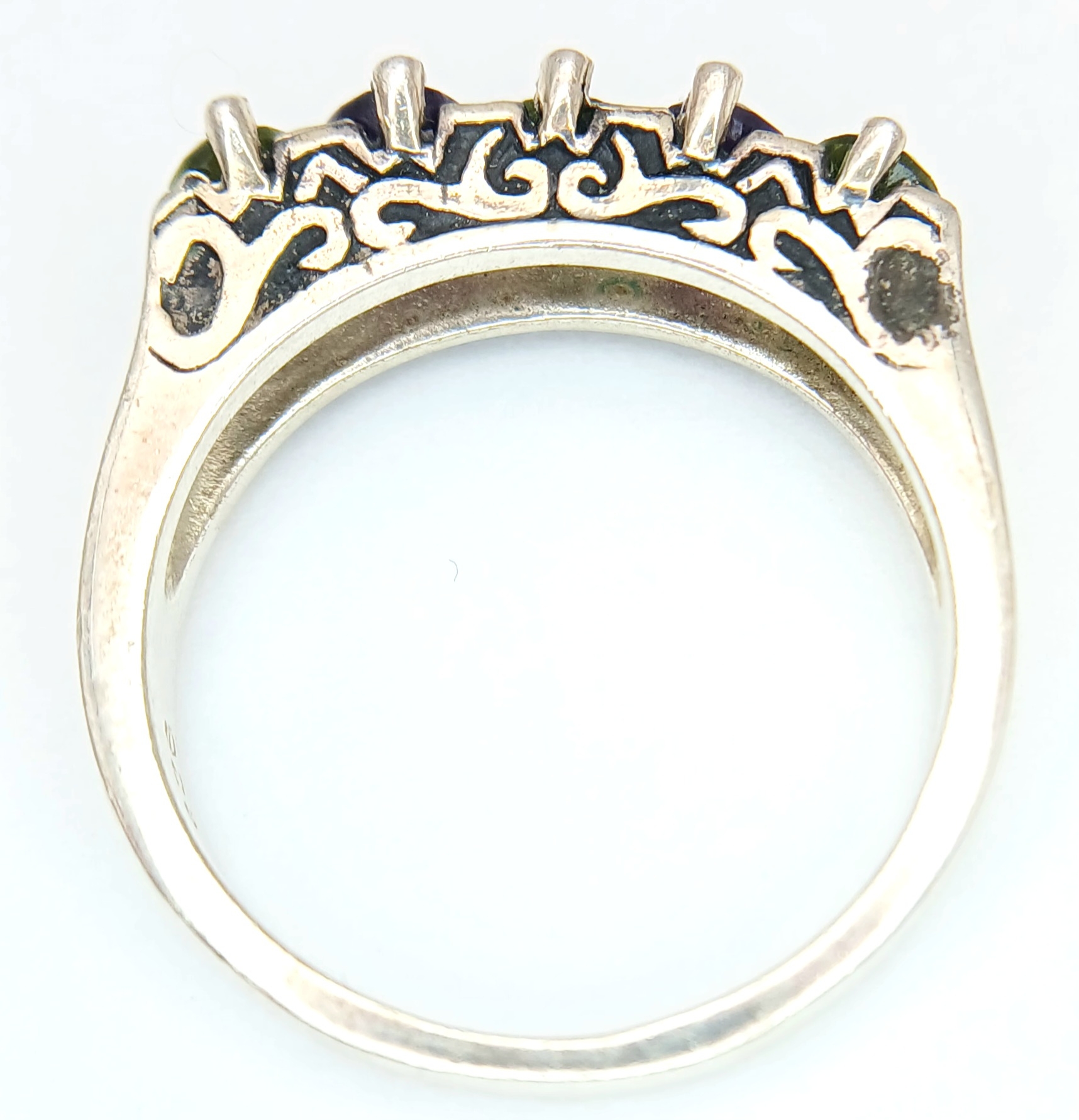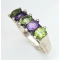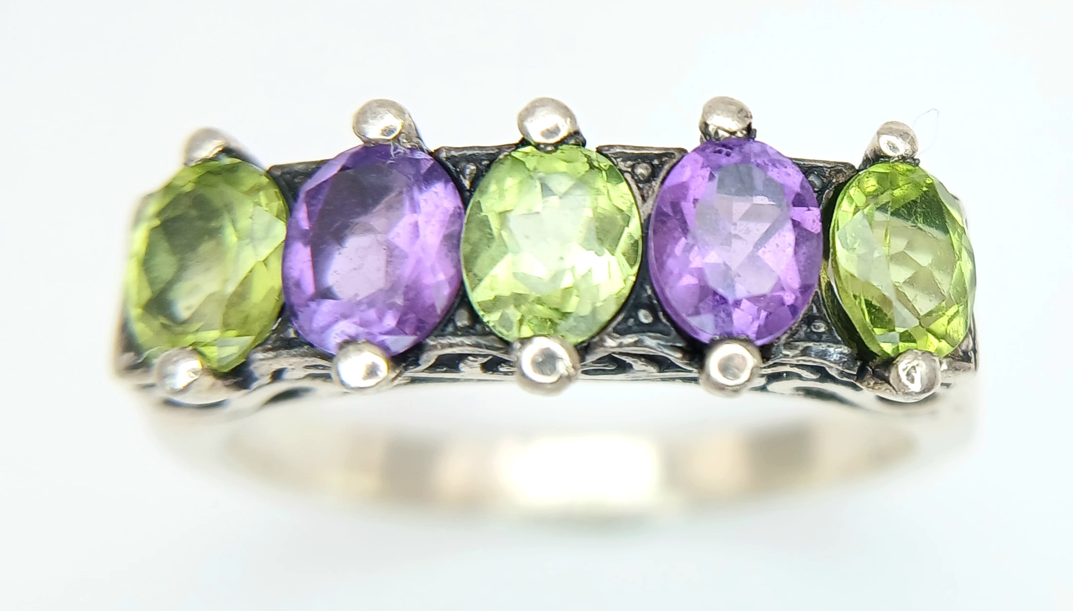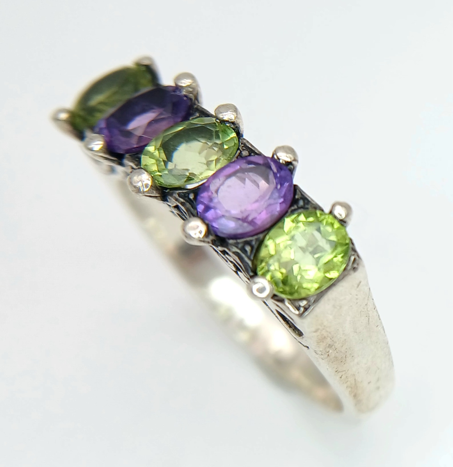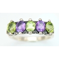 A Vintage Sterling Silver Amethyst and Peridot Ring Size S. The Ring is set with 5mm Long Oval Cut Amethysts and Peridots. Gross weight 5.05 Grams.