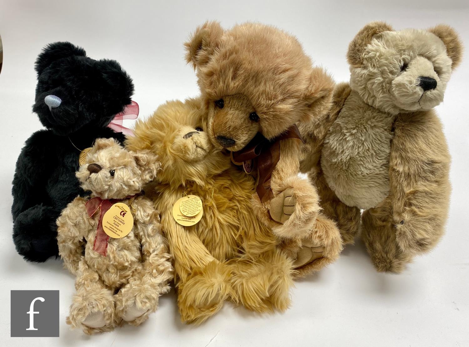Five Charlie Bears teddy bears, Scribbles 2010 Signing Bear (CB104670), golden plush and mohair, height 43cm, Wolfgang (CB104740), tonal brown plush, Peter (CB094045B), black plush, Adele (CB0104649), beige curly plush, and Robbie (CB104725), golden plush, all with swing tags. (5)