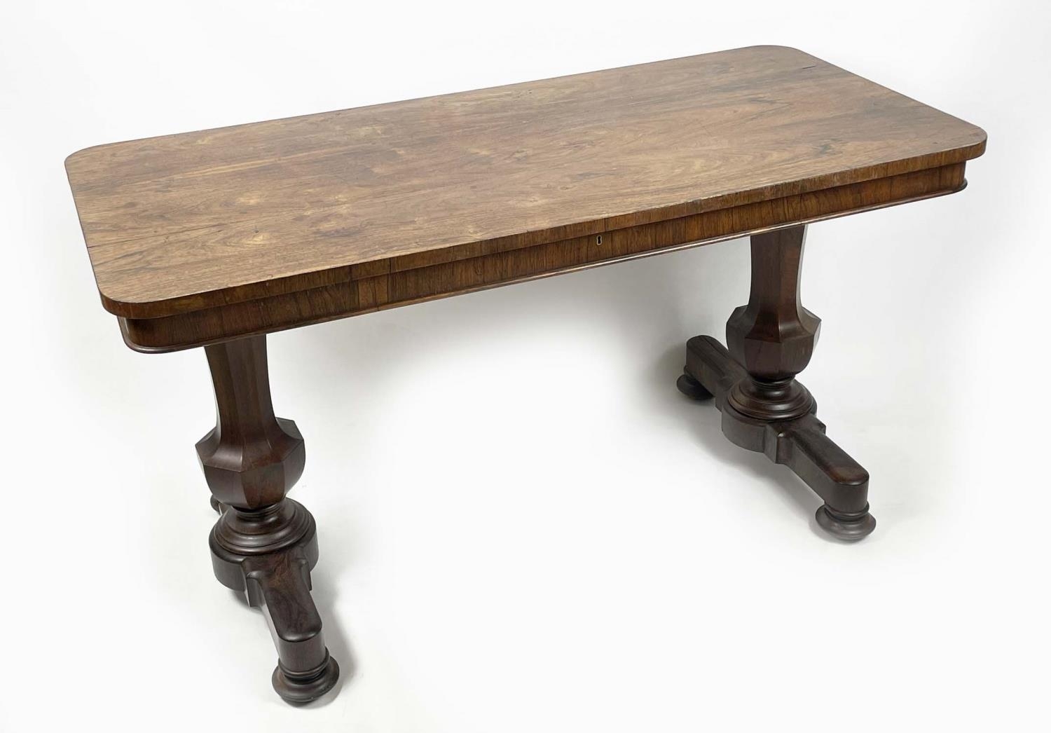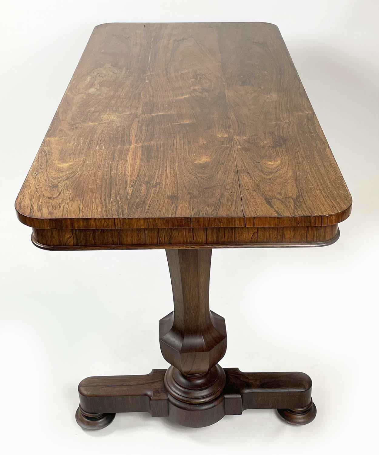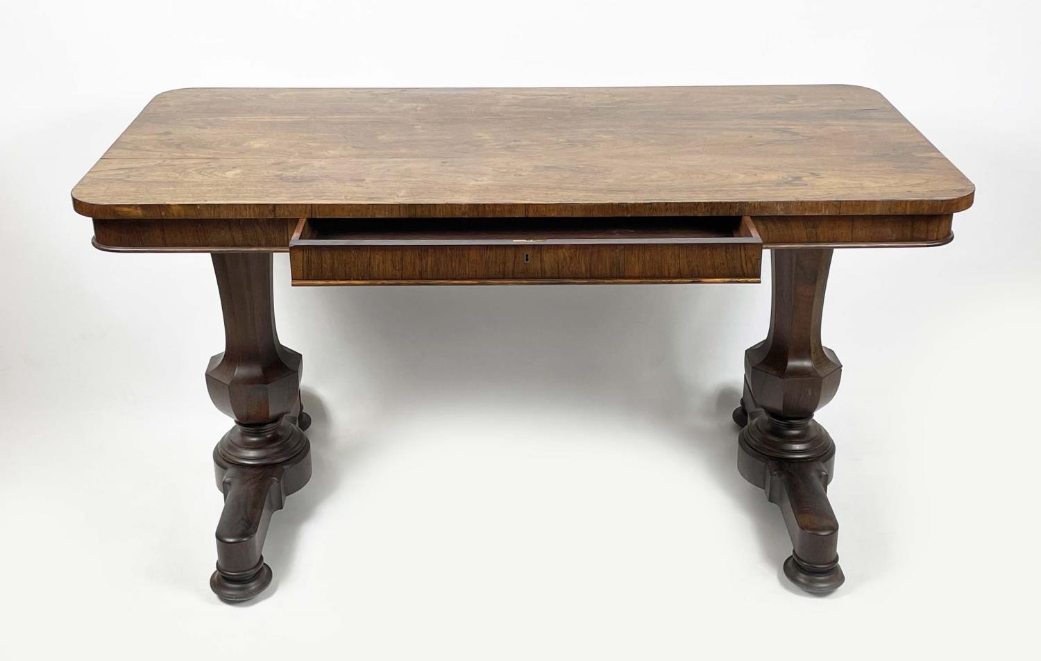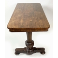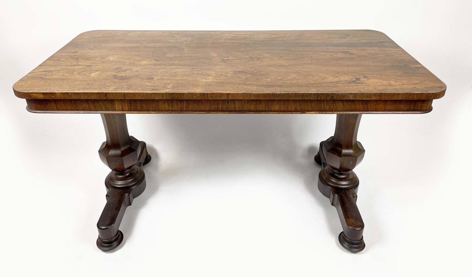 LIBRARY TABLE, late Regency rosewood, circa 1830, with central drawer on octagonal end supports with blind castors on bun feet, 140cm L x 68cm W x 74cm H.
