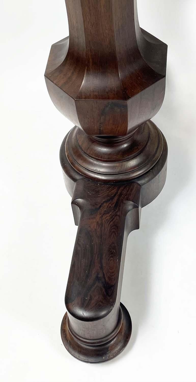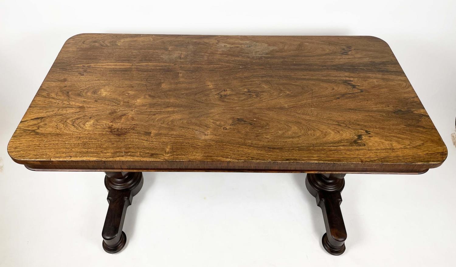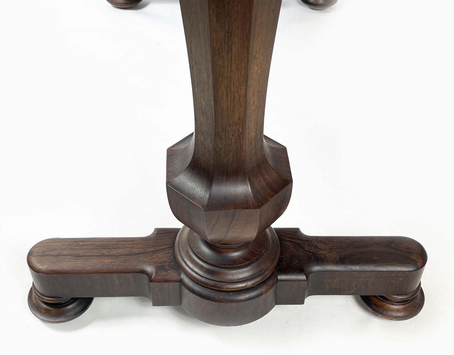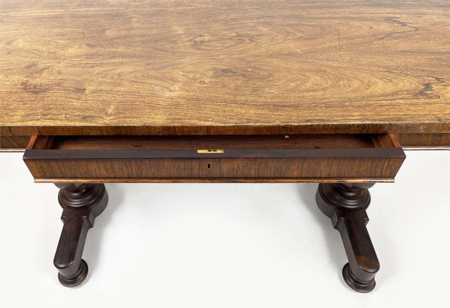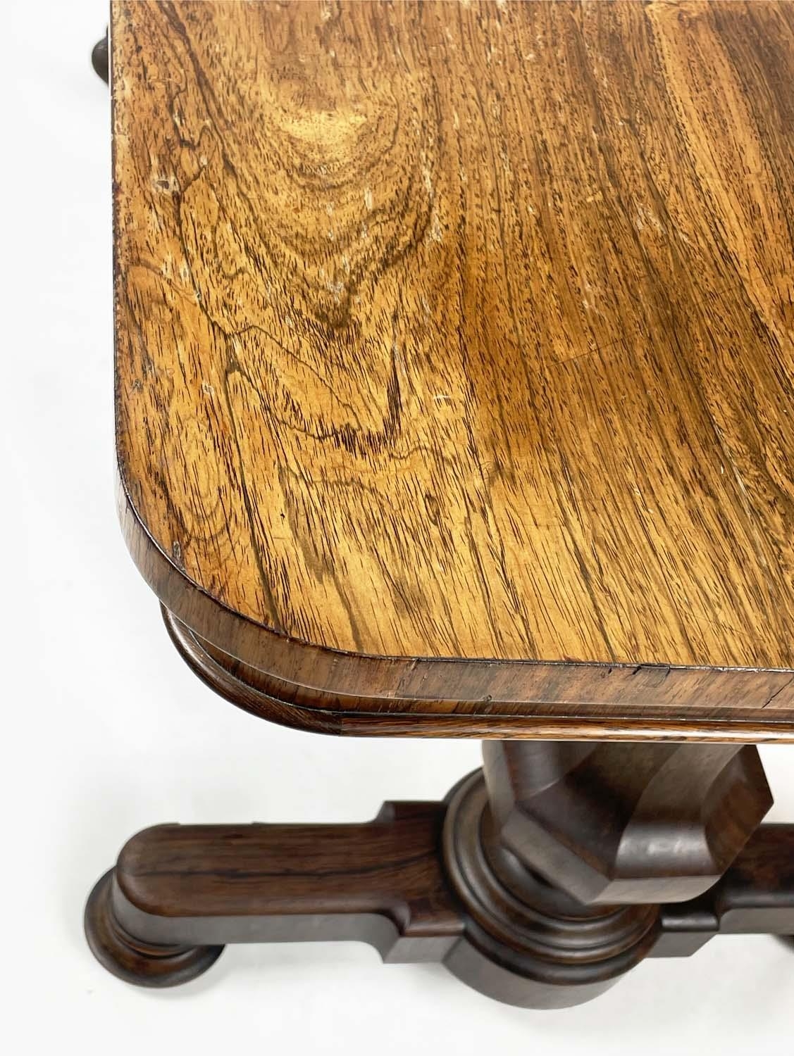 LIBRARY TABLE, late Regency rosewood, circa 1830, with central drawer on octagonal end supports with blind castors on bun feet, 140cm L x 68cm W x 74cm H.