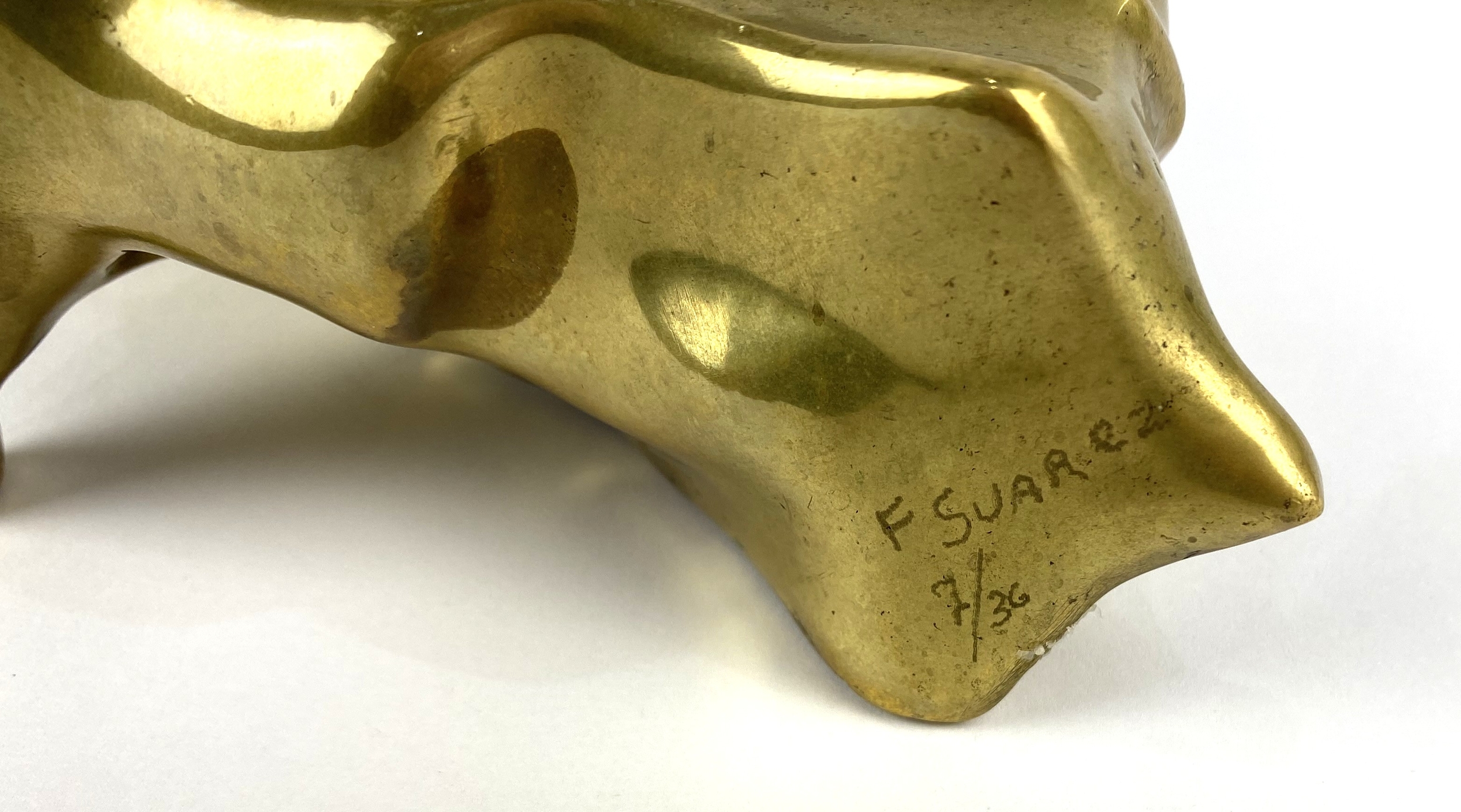 Fernando Suarez (Spanish), A bronze sculpture of a bull, signed and numbered 2/36, 21cm long