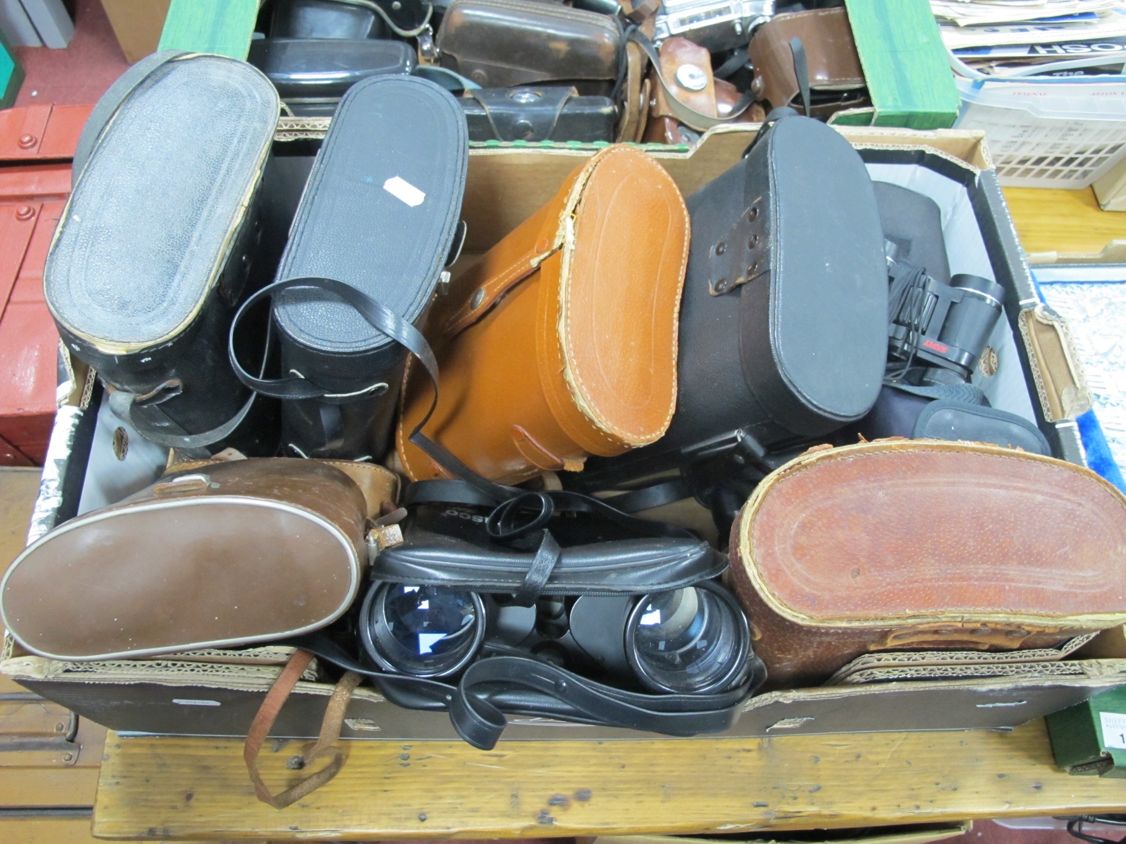 Binoculars and Spotting Scopes, vintage and modern, to include Viper 10x50, Viking 8x25, Asahi Pentax 10x50, Prinz 10x50, Tesco 10x50, Nikon Sprint IV, Opticron Mono 8x32, etc:- One Box. [800048, 893939]