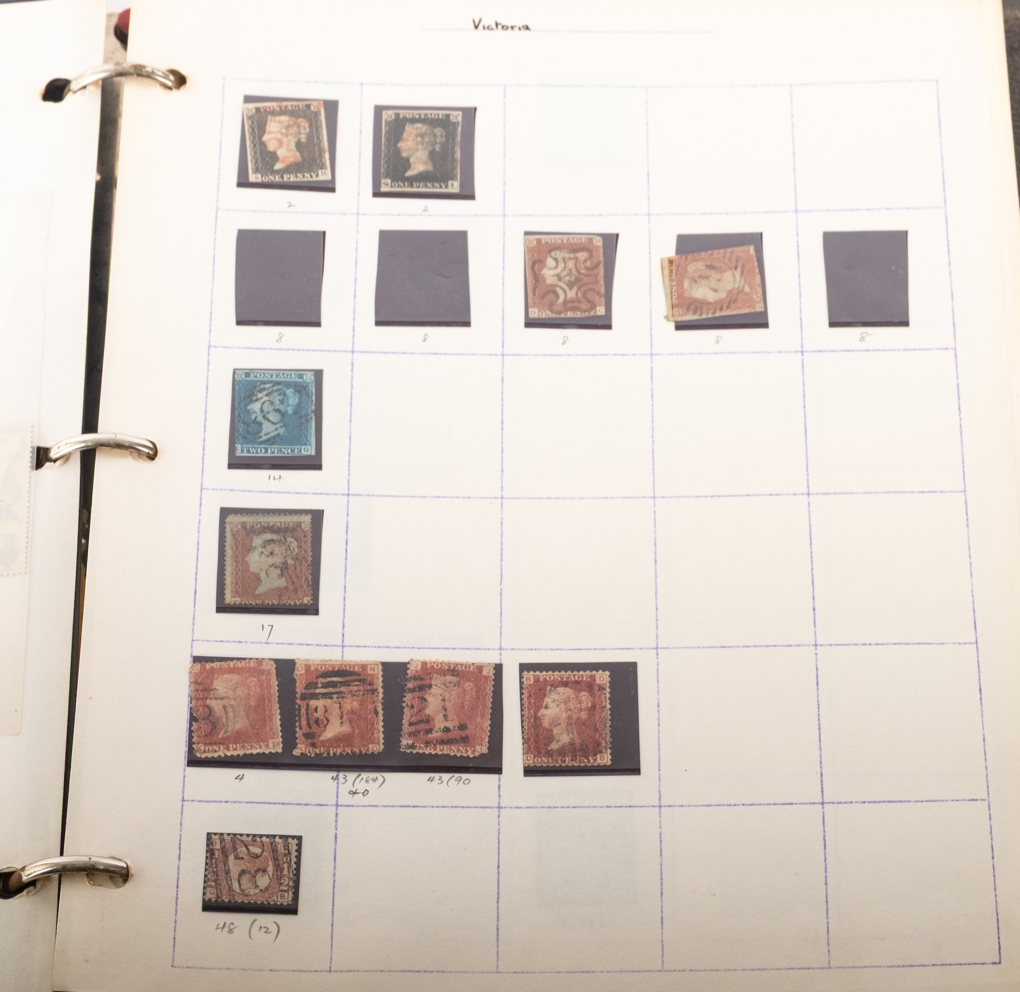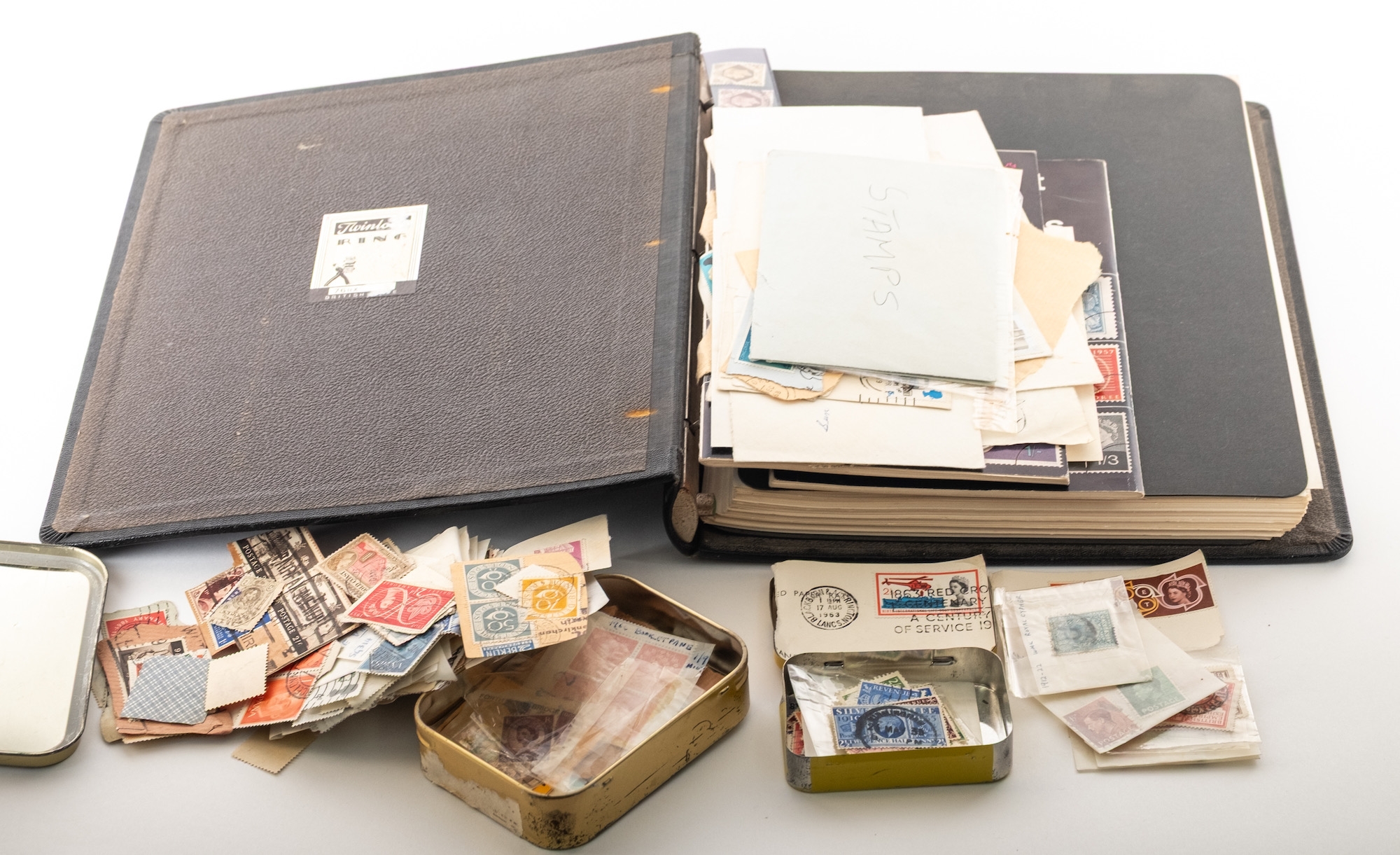 Stamp album with GB Queen Victoria and later, including two 1840 1d Blacks, surface printed to 1/-(x2), etc, plus two small tins of loose stamps.