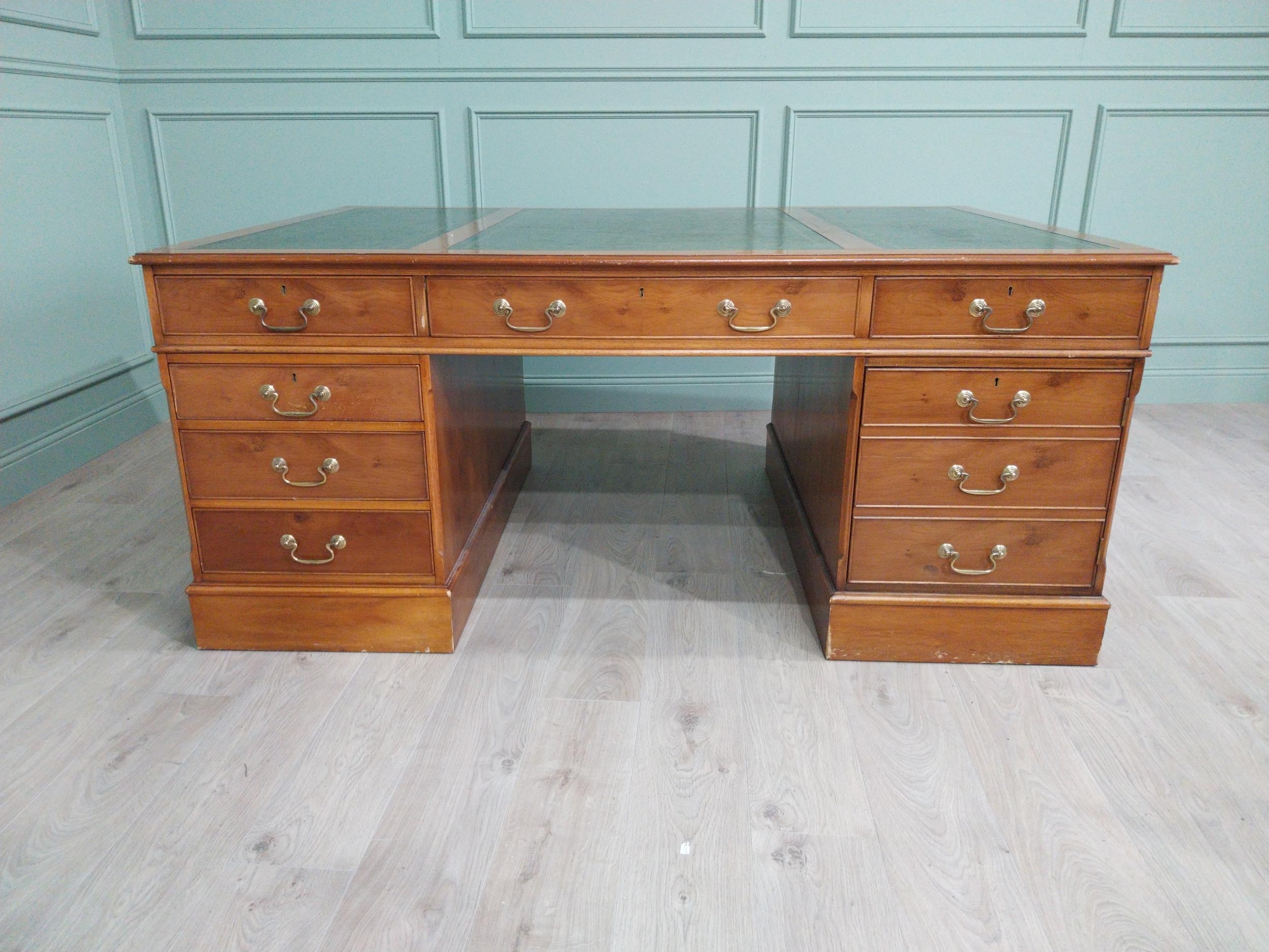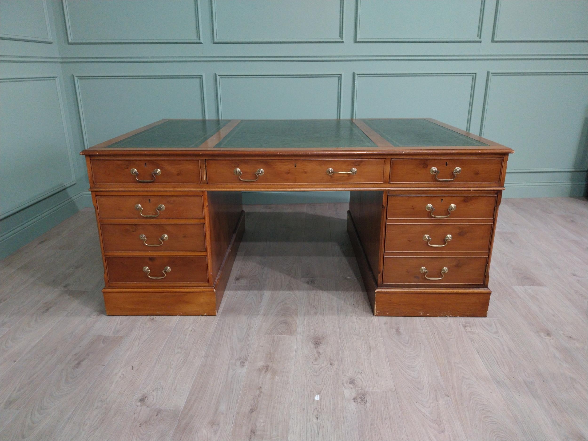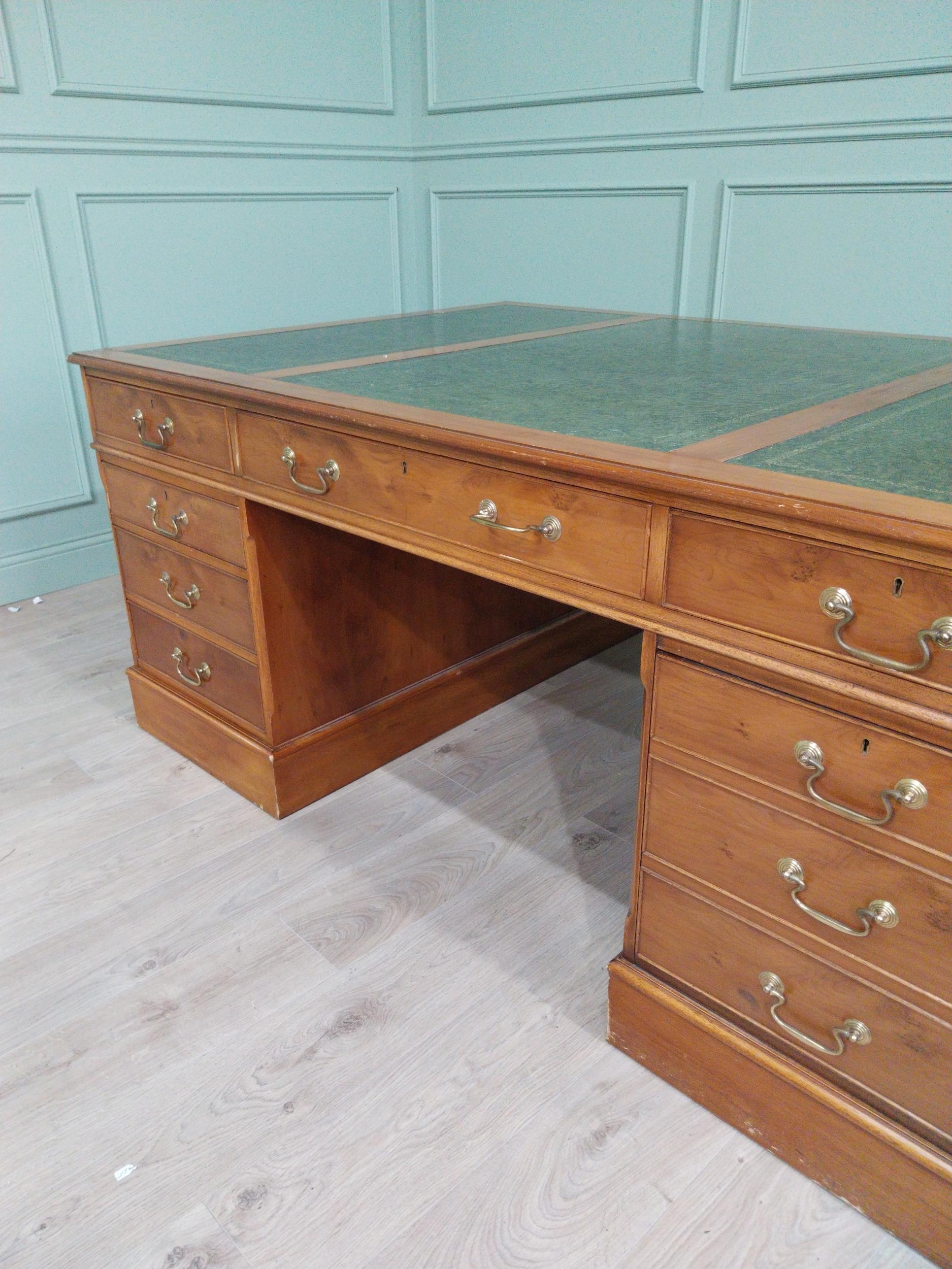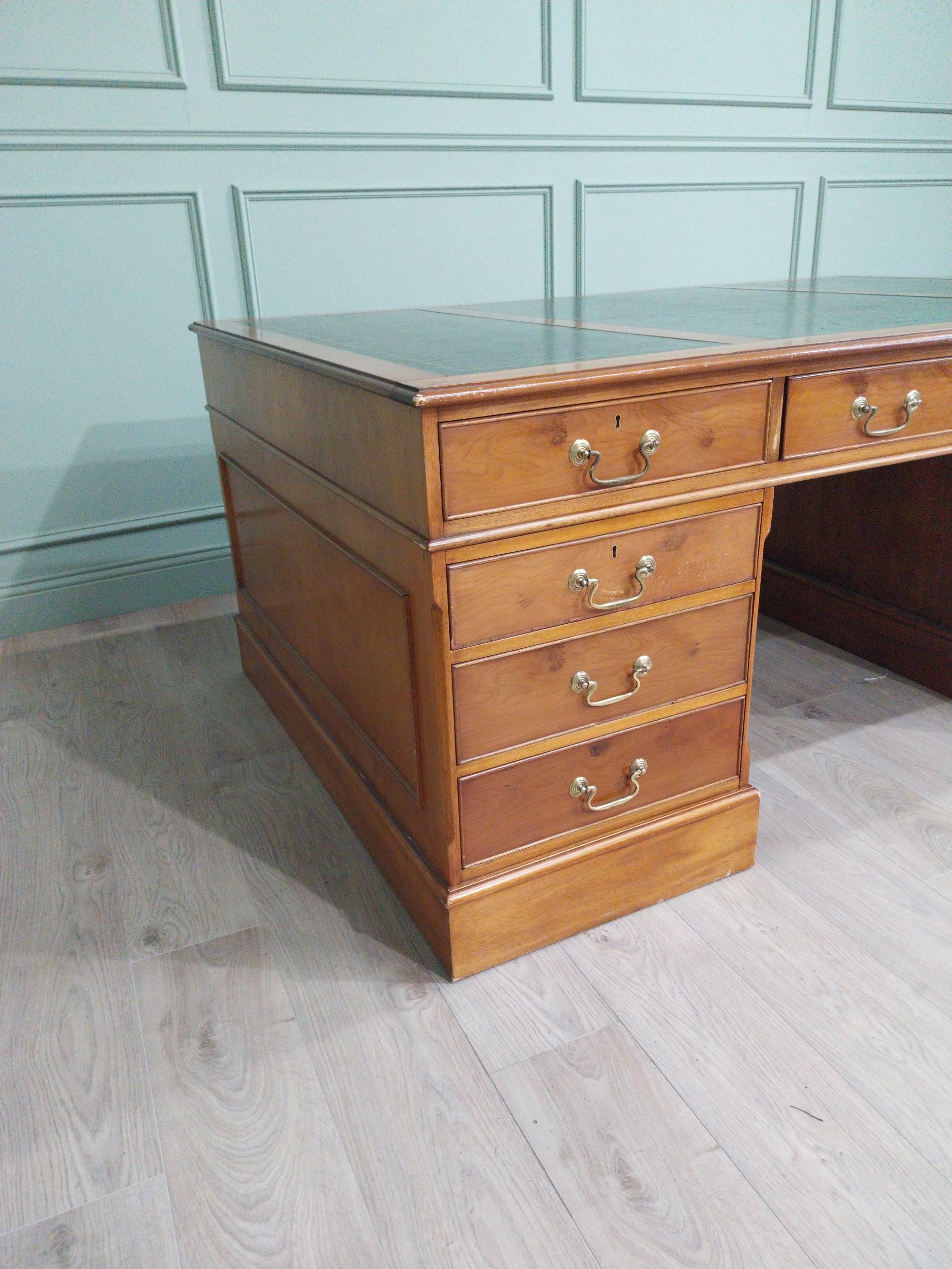 Good quality 19th C. yew wood Partner's desk with inset tooled leather top above a short centre drawer flanked by eight short drawers raised on plinth bases . {80 cm H x 183 cm W x 122 cm D}.