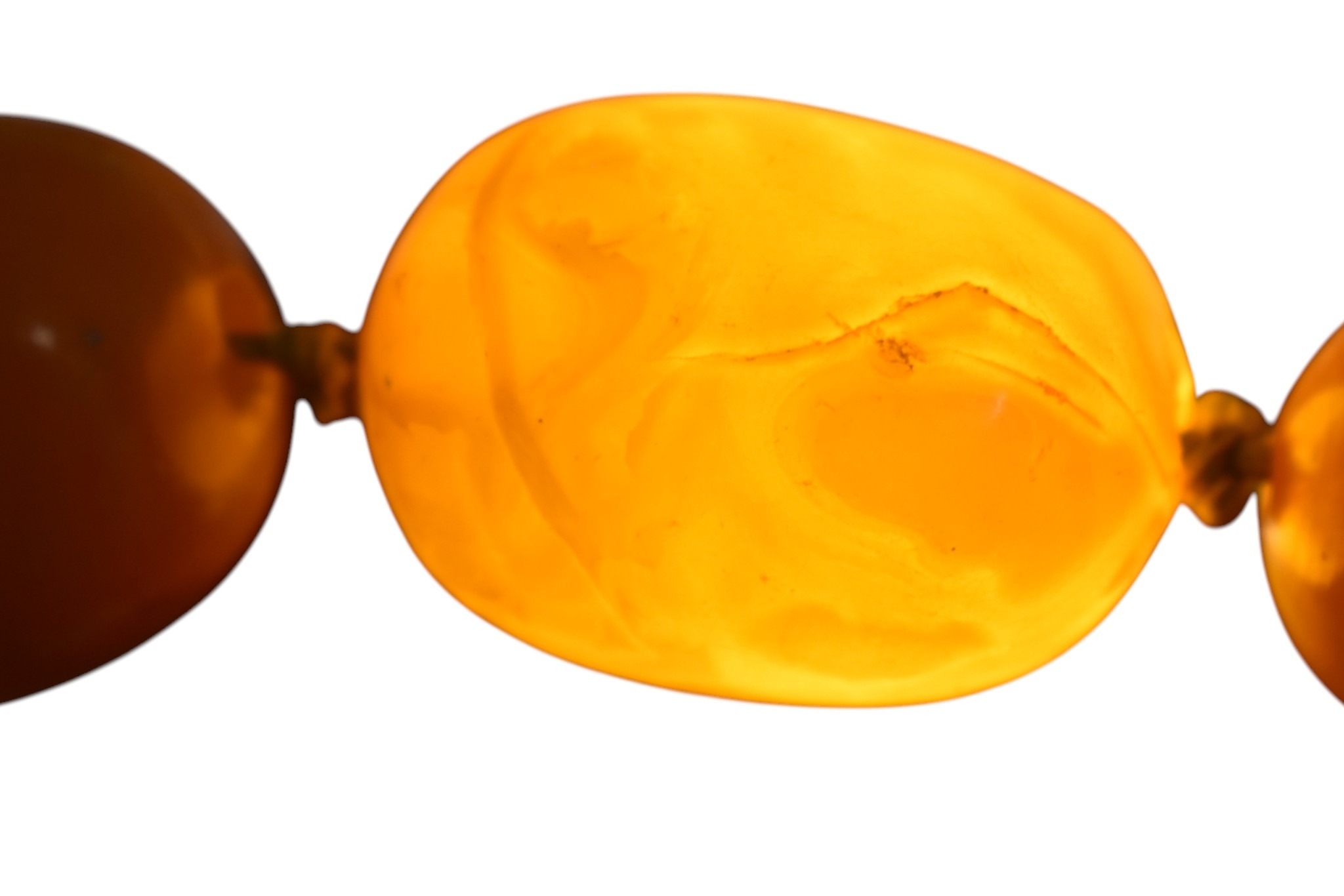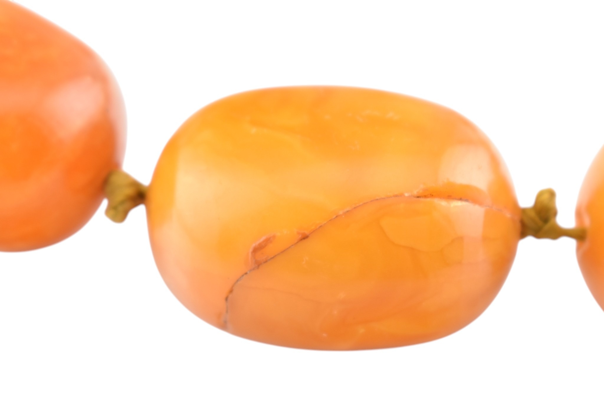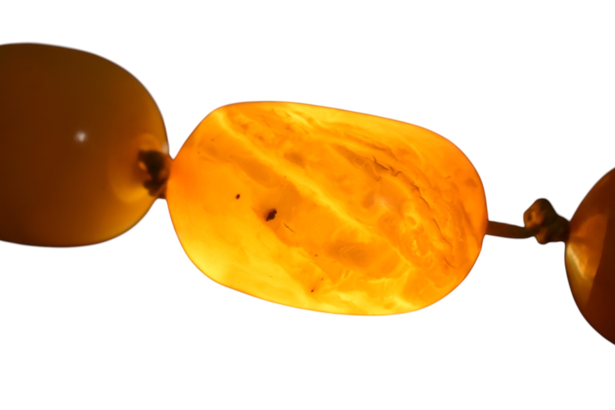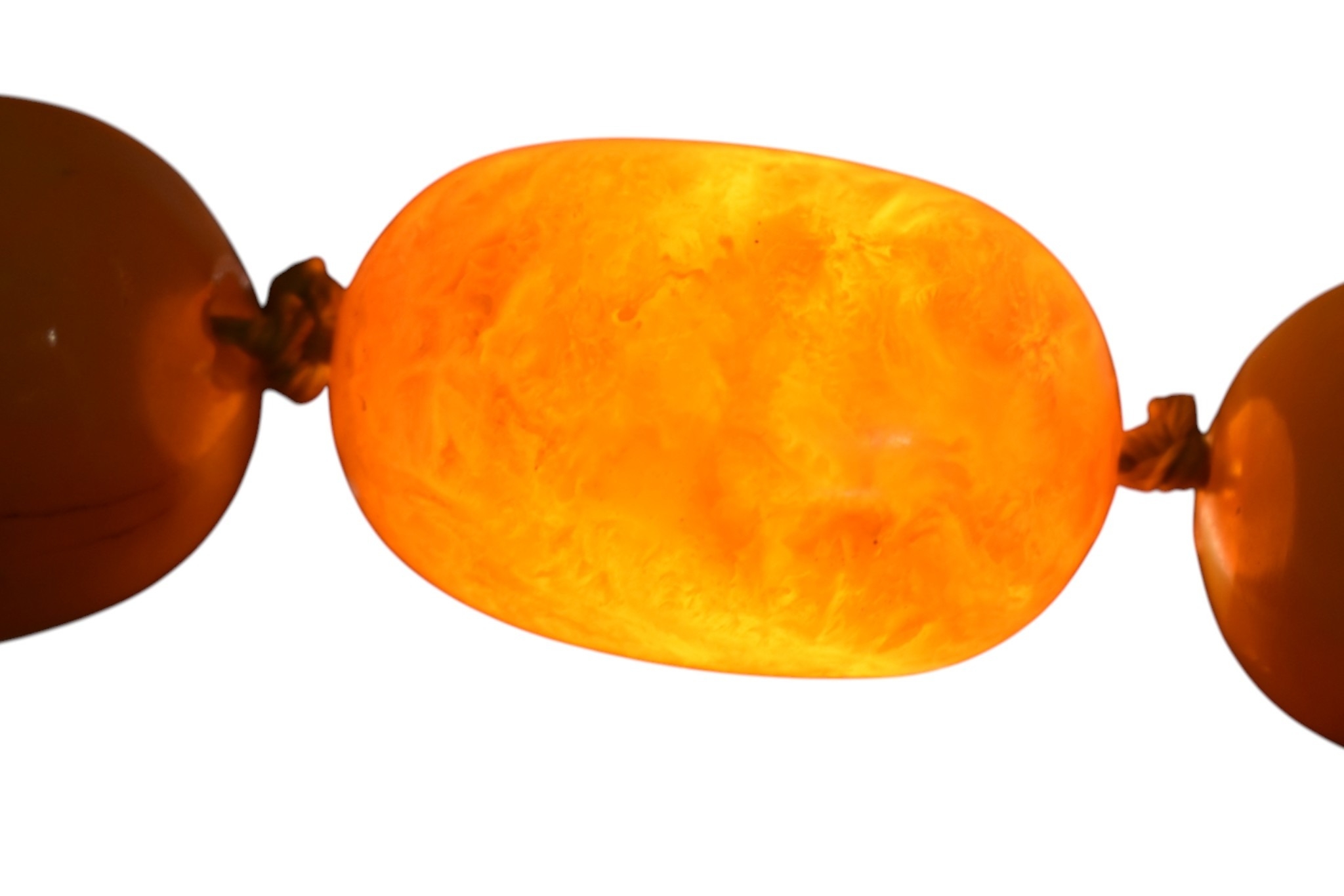 A vintage egg yolk amber bead necklace and earrings. The necklace with large knotted amber beads. The earrings made from another amber bead necklace.