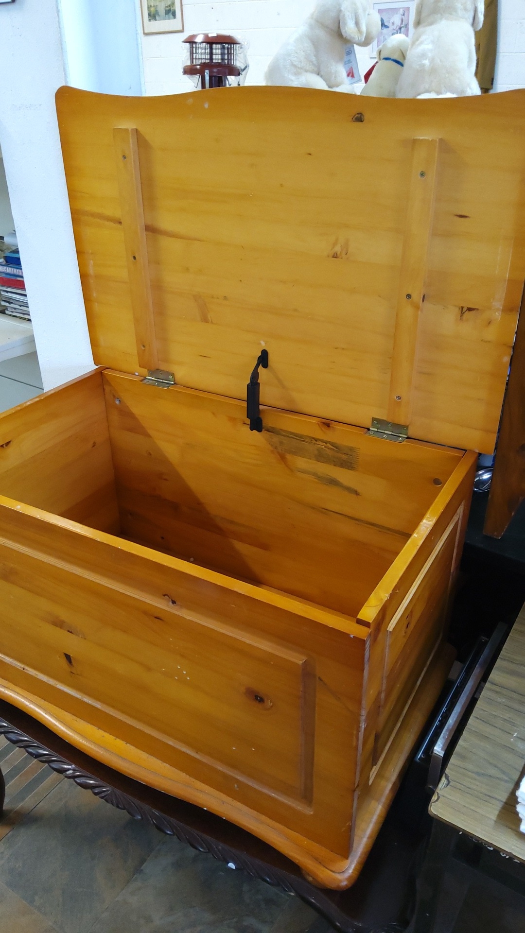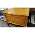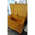 A pine blanket box with hinged lid and plain panelled sides, fitted with internal stay; rectangular form with moulded base and edges.