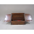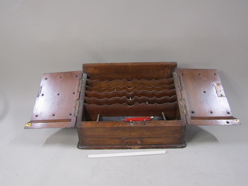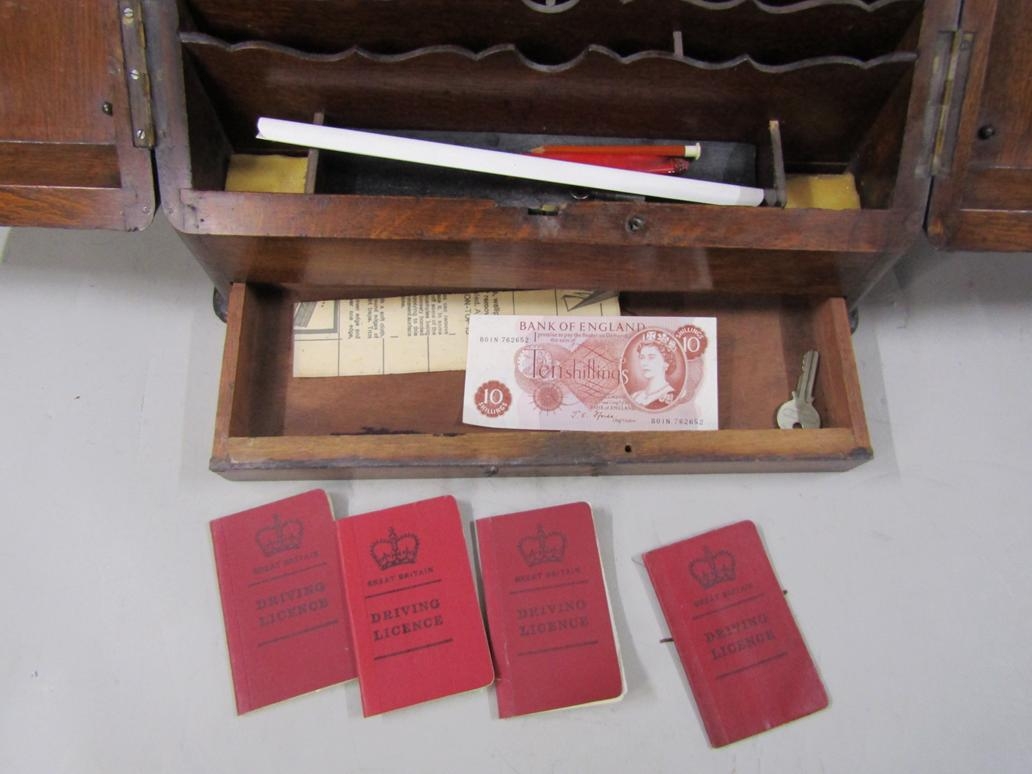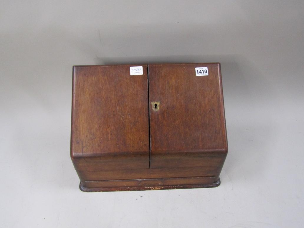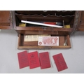 EDWARDIAN OAK STATIONERY BOX AND CONTENTS