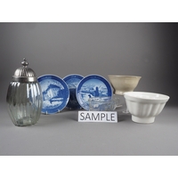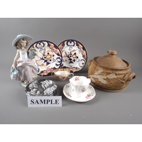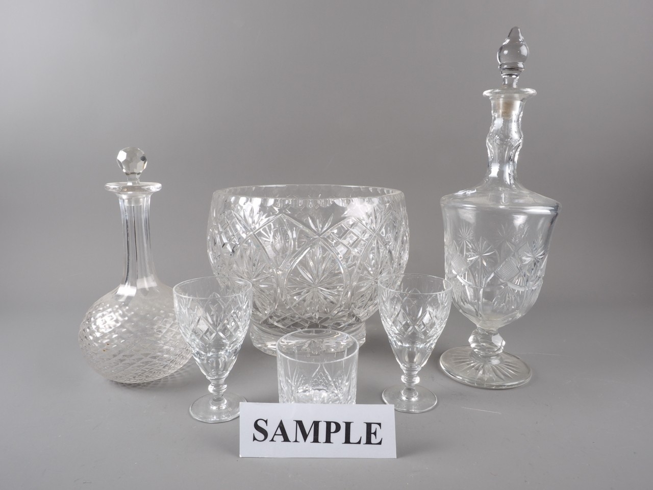 A cut glass bowl, 8" high x 9" dia, two decanters, glasses etc