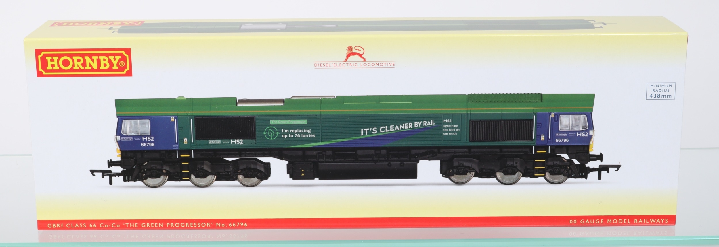 A Hornby GBRf class 66 Co-Co Diesel Locomotive (R30151). 'The Green Progressor' 66796 in green and purple livery. Boxed. Contents Mint. £60-80
