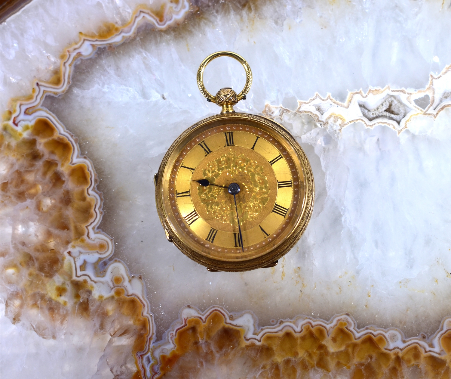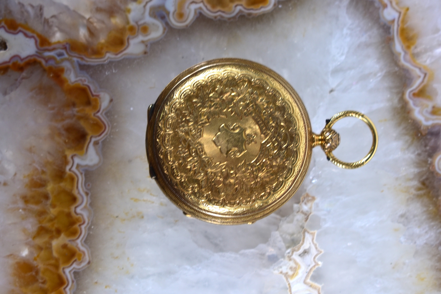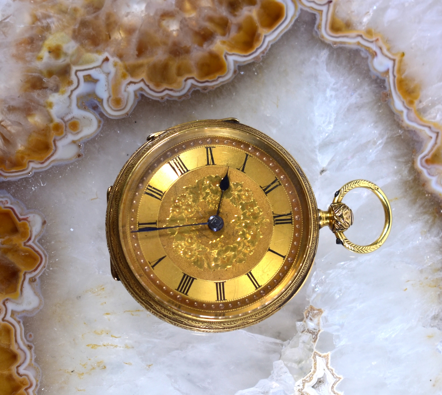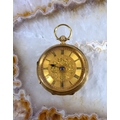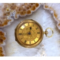 A Victorian 18ct gold ladies pocket watch, with an ornate gold dial with foliate engravings and Roman numerals, hallmarked for Chester 1896, 57.5g.
