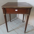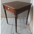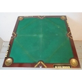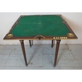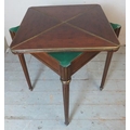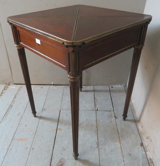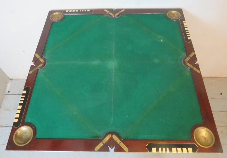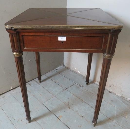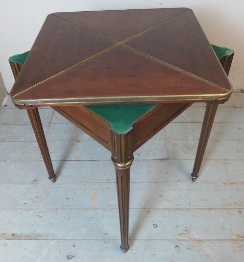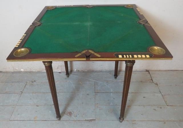 An Edwardian Regency revival 'plum pudding' mahogany envelope 'whist' table with gilt metal mounts, raised on tapering reeded supports.