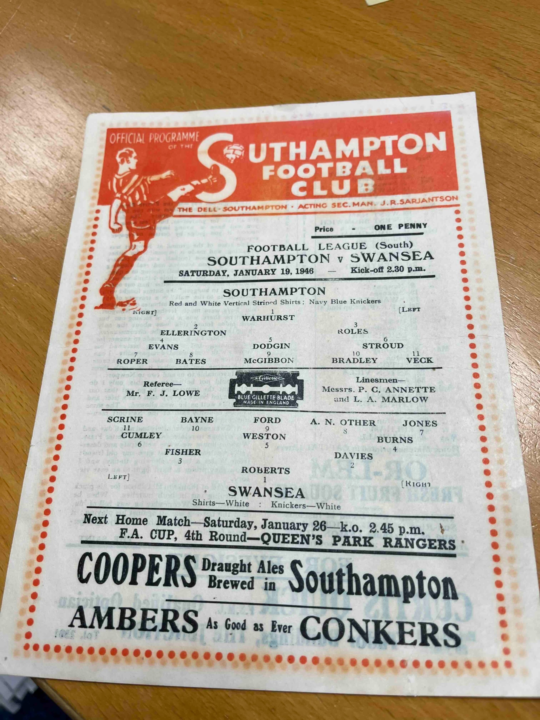 1945/46 Southampton v Swansea, Sl cr.
